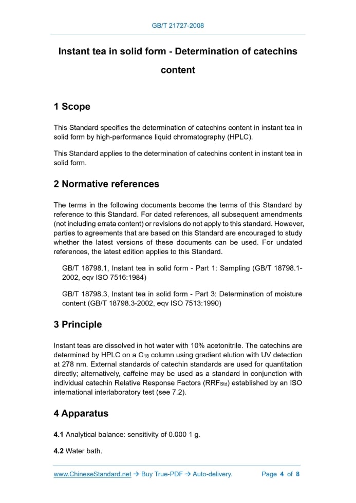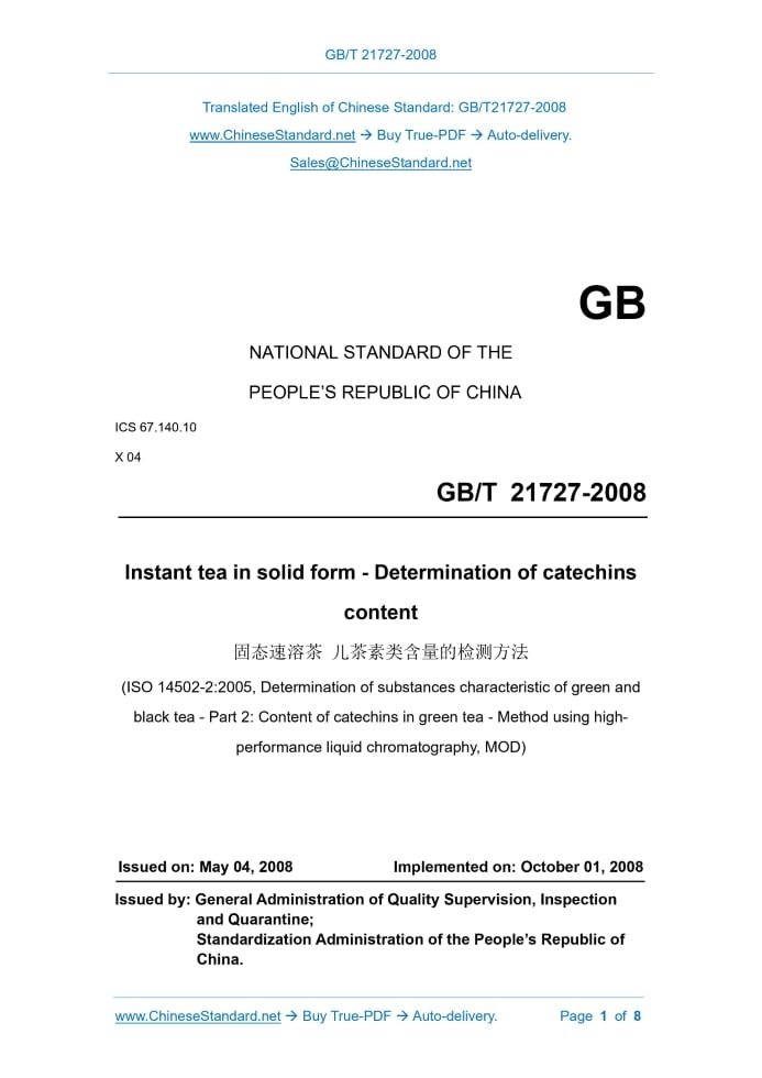 GB/T 21727-2008: Instant tea in solid form -- Determination of catechins content Delivery: 9 seconds. True-PDF full-copy in English & invoice will be downloaded + auto-delivered via email. See step-by-step procedure Status: Valid