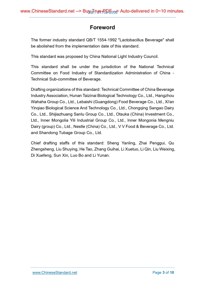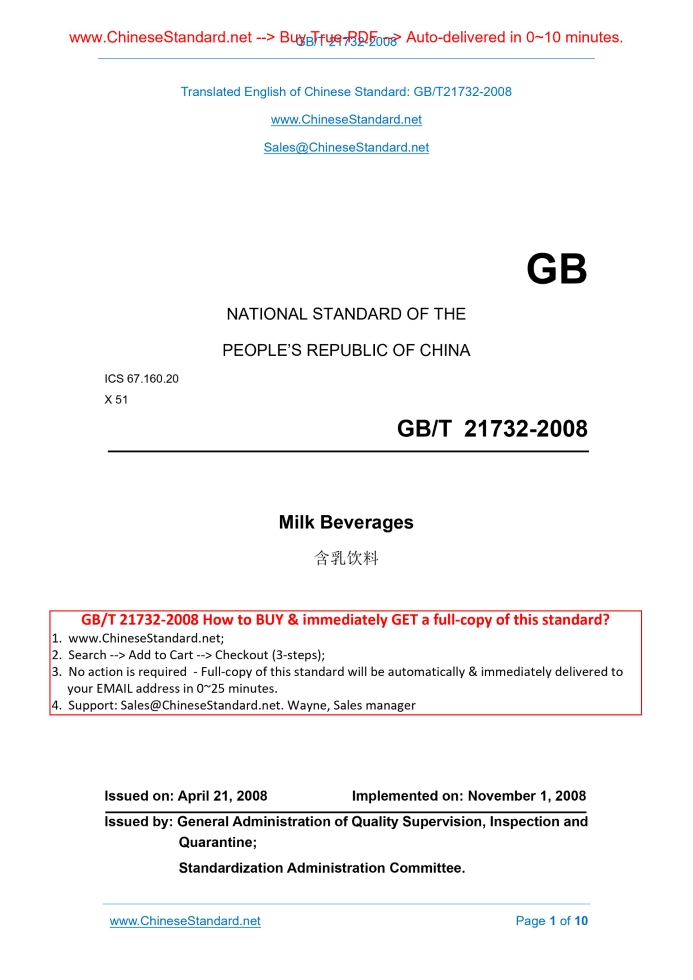 Similar standardsGB/T 21732-2008: Milk Beverages---This is an excerpt. Full copy of true-PDF in English version (including equations, symbols, images, flow-chart, tables, and figures etc.), auto-downloaded/delivered in 9 seconds, can be purchased online: https://www.ChineseStandard.net/PDF.aspx/GBT21732-2008GB NATIONAL STANDARD OF THE PEOPLE’S REPUBLIC OF CHINA ICS 67.160.20 X 51 Milk Beverages 含乳饮料 Issued on: APRIL 21, 2008 Implemented on: NOVEMBER 1, 2008 Issued by. General Administration of Quality Supervision, Inspection and Quarantine; Standardization Administration Committee. Table of ContentsForeword ... 3 1 Scope ... 4 2 Normative References ... 4 3 Term and Definition ... 5 4 Product Classification ... 5 5 Technical Requirements ... 6 6 Test Methods ... 7 7 Inspection Rules ... 8 8 Marking, Packing, Transport and Storage ... 9ForewordThe former industry standard QB/T 1554-1992 "Lactobacillus Beverage" shall be abolished from the implementation date of this standard. This standard was proposed by China National Light Industry Council. This standard shall be under the jurisdiction of the National Technical Committee on Food Industry of Standardization Administration of China - Technical Sub-committee of Beverage. Drafting organizations of this standard. Technical Committee of China Beverage Industry Association, Hunan Taizinai Biological Technology Co., Ltd., Hangzhou Wahaha Group Co., Ltd., Lebaishi (Guangdong) Food Beverage Co., Ltd., Xi'an Yinqiao Biological Science And Technology Co., Ltd., Chongqing Sangao Dairy Co., Ltd., Shijiazhuang Sanlu Group Co., Ltd., Otsuka (China) Investment Co., Ltd., Inner Mongolia Yili Industrial Group Co., Ltd., Inner Mongonia Mengniu Dairy (group) Co., Ltd., Nestle (China) Co., Ltd., V V Food & Beverage Co., Ltd. and Shandong Tubage Group Co., Ltd. Chief drafting staffs of this standard. Sheng Yanling, Zhai Penggui, Qu Zhengsheng, Liu Shuying, He Tao, Zhang Guihai, Li Xuetuo, Li Qin, Liu Weixing, Di Xuefeng, Sun Xin, Luo Bo and Li Yunan. Milk Beverages1 ScopeThis standard specifies the product classification, technical requirements, testing methods, inspection rules, marking, packing, transport and storage of milk beverages. This standard is applicable to milk beverages.2 Normative ReferencesThe following standards contain the provisions which, through reference in this text, constitute the provisions of this standard. For dated reference, the subsequent amendments (excluding correction) or revisions of these publications do not apply. However, all parties who reach an agreement based in this standard are encouraged to study whether the latest edition of these documents is applicable. For undated references, the latest edition of the normative standard referred to applies. GB 2760 Hygienic Standards for Uses of Food Additives GB/T 4789.35 Microbiological Examination of Food Hygiene - Examination of Lactic Acid Bacteria in Yoghurt Beverage GB/T 5009.5 Determination of Protein in Foods GB/T 5009.29 Determination of Sorbic Acid and Benzioc Acid in Foods GB/T 5009.46 Method for Analysis of Hygienic Standard of Milk and Milk Products GB 7718 General Standard for the Labeling of Prepackaged Foods GB 11673 Hygienic Standard for Milk Beverage GB 13432 General Standard for the Labeling of Prepackaged Foods for Special Dietary Uses GB 14880 Hygienic Standard for the Use of Nutritional Fortification Substances in Foods GB 16321 Hygienic Standard for Lactobacillus Beverage3 Term and DefinitionThe following terms and definitions apply to this standard. 3.1 Milk beverage The beverages that are prepared or fermented by adding water and proper quantity of accessory ingredients in milk or milk products. Mild beverage is also called as milk drinks and mild potables.4 Product Classification4.1 Prepared milk beverage The beverage which is prepared with milk or milk products by adding water, white granulated sugar and (or) one or several kinds of such ingredients as sweetening agent, sour agent, fruit juice, tea, coffee, plant extracting solution, etc. 4.2 Fermented milk beverage The beverage which mixes the milky liquid (obtained by cultivating and fermenting milk or milk product with beneficial bacteria, such as lactobacillus), water, white granulated sugar and (or) one or several kinds of such ingredients as sweetening agent, sour agent, fruit juice, tea, coffee, plant extracting solution, etc. Lactobacillus beverage is of this type. The fermented mild beverage is classified into pasteurized (non-viable) type and unpasteurized (viable) type. Fermented milk beverage may also be called as sour milk beverage and sour mild drink. 4.3 Lactobacillus beverage The beverage which mixes the milky liquid (obtained by and fermenting milk or milk product with lactobacillus), water, white granulated sugar and (or) one or several kinds of such ingredients as sweetening agent, sour agent, fruit juice, Test according to the methods specified in GB 11673, GB 16321 and GB/T 5009.46. 6.4 Lactobacillus index Test according to the methods specified in GB/T 4789.35.7 Inspection Rules7.1 Sampling method and sampling quantity Take twelve minimal independent packets randomly from each batch for exit- factory inspection. Among them, six are for inspection on sensory index and physiochemical indexes; two for microbe inspection; and the rest are for reserved-use. Take twelve minimal independent packets randomly from each batch for type inspection. Among them, six are for inspection on sensory index and physiochemical indexes; two for microbe inspection; and the reset are for reserved-use. 7.2 Exit-factory inspection 7.2.1 The quality management department of the manufacturer determines the product lots according to the corresponding rules. 7.2.2 The items of exit-factory inspection include. protein, sense, lactobacillus count (viable product), aerobic bacteria count (non-viable product) and coliform bacteria. 7.2.3 Each batch of products shall be conducted by exit-factory inspectio