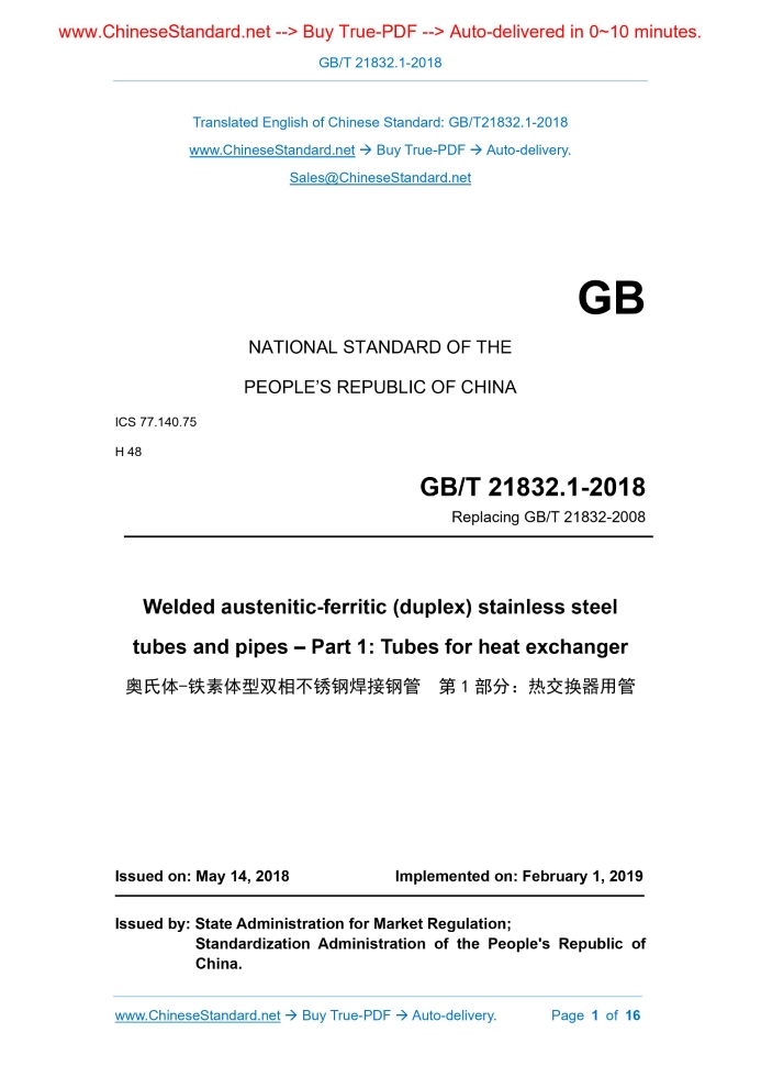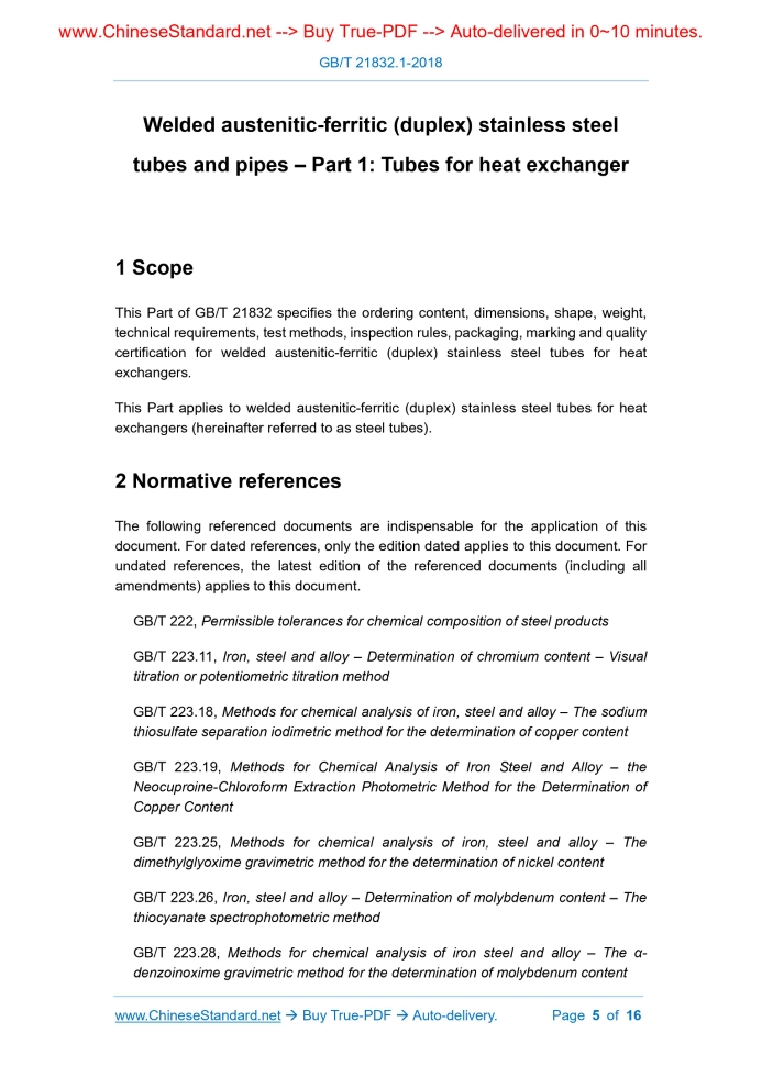 Similar standardsGB/T 21832.1-2018: Welded austenitic-ferritic (duplex) stainless steel tubes and pipes - Part 1: Tubes for heat exchanger---This is an excerpt. Full copy of true-PDF in English version (including equations, symbols, images, flow-chart, tables, and figures etc.), auto-downloaded/delivered in 9 seconds, can be purchased online: https://www.ChineseStandard.net/PDF.aspx/GBT21832.1-2018 GB NATIONAL STANDARD OF THE PEOPLE’S REPUBLIC OF CHINA ICS 77.140.75 H 48 Replacing GB/T 21832-2008 Welded austenitic-ferritic (duplex) stainless steel tubes and pipes – Part 1. Tubes for heat exchanger Issued on: MAY 14, 2018 Implemented on: FEBRUARY 1, 2019 Issued by. State Administration for Market Regulation; Standardization Administration of the People's Republic of China. Table of ContentsForeword ... 3 1 Scope ... 5 2 Normative references ... 5 3 Ordering content ... 7 4 Dimensions, shape and weight ... 7 5 Technical requirements ... 9 6 Test methods ... 14 7 Inspection rules ... 15 8 Packaging, marking and quality certification ... 16 Welded austenitic-ferritic (duplex) stainless steel tubes and pipes – Part 1. Tubes for heat exchanger1 ScopeThis Part of GB/T 21832 specifies the ordering content, dimensions, shape, weight, technical requirements, test methods, inspection rules, packaging, marking and quality certification for welded austenitic-ferritic (duplex) stainless steel tubes for heat exchangers. This Part applies to welded austenitic-ferritic (duplex) stainless steel tubes for heat exchangers (hereinafter referred to as steel tubes).2 Normative referencesThe following referenced documents are indispensable for the application of this document. For dated references, only the edition dated applies to this document. For undated references, the latest edition of the referenced documents (including all amendments) applies to this document. GB/T 222, Permissible tolerances for chemical composition of steel products GB/T 223.11, Iron, steel and alloy – Determination of chromium content – Visual titration or potentiometric titration method GB/T 223.18, Methods for chemical analysis of iron, steel and alloy – The sodium thiosulfate separation iodimetric method for the determination of copper content GB/T 223.19, Methods for Chemical Analysis of Iron Steel and Alloy – the Neocuproine-Chloroform Extraction Photometric Method for the Determination of Copper Content GB/T 223.25, Methods for chemical analysis of iron, steel and alloy – The dimethylglyoxime gravimetric method for the determination of nickel content GB/T 223.26, Iron, steel and alloy – Determination of molybdenum content – The thiocyanate spectrophotometric method GB/T 223.28, Methods for chemical analysis of iron steel and alloy – The α- denzoinoxime gravimetric method for the determination of molybdenum content GB/T 11170, Stainless steel – Determination of multi-element contents – Spark discharge atomic emission spectrometric method (Routine method) GB/T 13305, Micrographic method for determining area content of the α-phases in stainless steels GB/T 20066, Steel and iron-sampling and preparation of samples for the determination of chemical composition GB/T 20123, Steel and iron – Determination of total carbon and sulfur content Infrared absorption method after combustion in an induction furnace (routine method) GB/T 20124, Steel and iron – Determination of nitrogen content – Thermal conductimetric method after fusion in a current of inert gas GB/T 21835, Dimensions and masses per unit length of welded steel pipes3 Ordering contentContracts or orders for purchase of steel tubes based on this Part shall include the following content. a) a reference to this Part; b) product name; c) steel designation; d) dimensions (outer diameter × wall thickness, in mm); e) quantity ordered; f) special requirements.4 Dimensions, shape and weight4.1 Outer diameter and wall thickness 4.1.1 The outer diameter D of steel tubes shall not be greater than 203 mm; the wall thickness S shall not be greater than 8.0 mm; and their dimensions shall be as specified in GB/T 21835. Steel tubes of other outer diameters and wall thicknesses can be supplied in accordance with the requirements of the purchaser, which shall be as agreed on by the supplier and the purchaser. D – the outer diameter, in mm. 5.6.2 Underwater air-tightness 5.6.2.1 For steel tubes of outer diameter not greater than 50.8 mm, carry out underwater air-tightness test in place of hydrostatic test one by one. Test pressure for underwater air-tightness test shall not be less than 1.0 MPa; and test medium is compressed air. Under the test pressure, steel tubes shall be fully immersed in water; the standup pressure time shall not be less than 10 s; and steel tubes shall be free from leakage. 5.6.2.2 Other test pressures can be used for air-tightness test in accordance with the requirements of the purchaser, which shall be as agreed on by the supplier and the purchaser and stated in contracts. 5.6.3 Eddy current testing The supplier can use eddy current testing to replace hydrostatic test. The artificial defects of contrast sample tubes for eddy current testing shall comply with the specifications for acceptance level E4H of GB/T 7735-2016. 5.7 Metallographic structure 5.7.1 The metallographic structure of steel tubes shall be austenitic-ferritic; the austenitic content of the base metal zones shall be 40% ~ 60%; and the austenitic content of the weld zones (the heat affected zones) shall be 35% ~ 65%. 5.7.2 Austenitic contents of other ranges can be specified, which shall be as agreed on by the supplier and the purchaser and stated in contracts. 5.8 Surface quality 5.8.1 The inner-outer surfaces of steel tubes shall be smooth, without cracks, folds, undercuts, lack of penetration or weld sags. These defects shall be removed completely; the removing depth shall not exceed the lower deviation of nominal wall thickness; the actual wall thickness at the removi