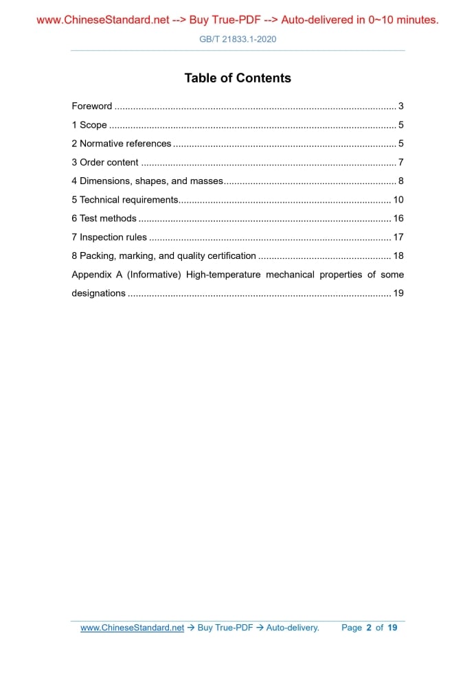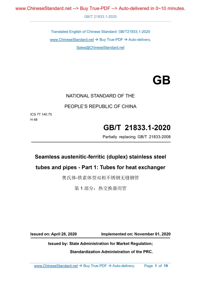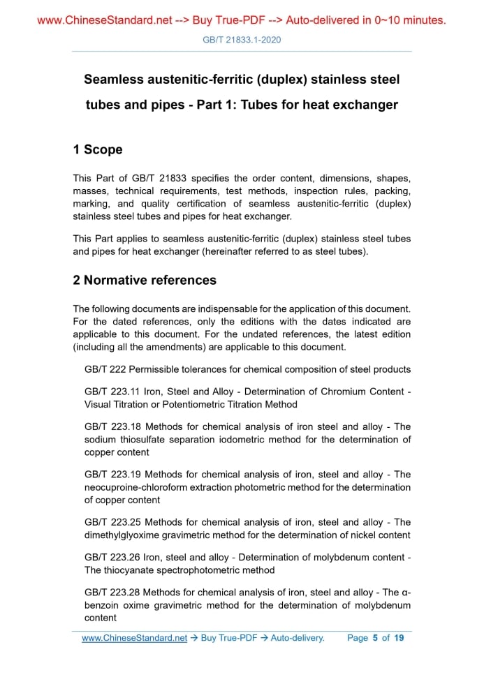 Similar standardsGB/T 21833.1-2020: Seamless austenitic-ferritic (duplex) stainless steel tubes and pipes - Part 1: Tubes for heat exchanger---This is an excerpt. Full copy of true-PDF in English version (including equations, symbols, images, flow-chart, tables, and figures etc.), auto-downloaded/delivered in 9 seconds, can be purchased online: https://www.ChineseStandard.net/PDF.aspx/GBT21833.1-2020 NATIONAL STANDARD OF THE PEOPLE’S REPUBLIC OF CHINA ICS 77.140.75 H 48 Partially replacing GB/T 21833-2008 Seamless austenitic-ferritic (duplex) stainless steel tubes and pipes - Part 1.Tubes for heat exchanger Issued on. APRIL 28, 2020 Implemented on. NOVEMBER 01, 2020 Issued by. State Administration for Market Regulation; Standardization Administration of the PRC. Table of ContentsForeword... 3 1 Scope... 5 2 Normative references... 5 3 Order content... 7 4 Dimensions, shapes, and masses... 8 5 Technical requirements... 10 6 Test methods... 16 7 Inspection rules... 17 8 Packing, marking, and quality certification... 18 Appendix A (Informative) High-temperature mechanical properties of some designations... 19ForewordGB/T 21833 "Seamless austenitic-ferritic (duplex) stainless steel tubes and pipes" is intended to be divided into three parts. - Part 1.Tubes for heat exchanger; - Part 2.Pipes for fluid service; - Part 3.Pipes for oil and gas service. This Part is Part 1 of GB/T 21833. This Part is drafted in accordance with the rules given in GB/T 1.1-2009. This Part partially replaces GB/T 21833-2008 "Austenitic-Ferritic (duplex) grade stainless steel seamless tubes and pipes". Compared with GB/T 21833-2008, the main technical changes of this Part are as follows. - Modify normative references (see Clause 2; Clause 2 of the 2008 edition); - Add dimension delivery method (see 4.1.1); - Modify the tolerances of the outer diameter and wall thickness of the steel tube (see 4.1.3; 4.1.2 of the 2008 edition); - Modify the tolerance of the fixed length (see 4.2.2; 4.2.2 of the 2008 edition); - Modify the bending requirements (see 4.3; 4.3 of the 2008 edition); - Modify the chemical composition requirements; delete the designations 06Cr26Ni4Mo2 and 12Cr21Ni5Ti (see 5.1.1; 5.1.1 of the 2008 edition); - Modify the smelting method of steel (see 5.2.1; 5.2.1 of the 2008 edition); - Delete the hot-rolling (hot-extrusion) steel tube manufacturing method and corresponding clauses (see 5.2.2 of the 2008 edition); - Modify the delivery state (see 5.3.1; 5.3.1 of the 2008 edition); - Delete Brinell hardness requirements and add Vickers hardness requirements (see 5.4.2; 5.4.2 of the 2008 edition); - ADD intergranular corrosion requirements, pitting corrosion requirements, and ultrasonic testing requirements (see 5.9, 5.10, 5.11); - Delete the impact test, color coding, and control of the upper limit of the tensile strength of steel tubes in special requirements (see 5.10 of the 2008 edition); - Modify the lot grouping rules (see 7.2; 7.2 of the 2008 edition); - Delete the comparison of domestic and foreign designations (see Appendix B of the 2008 edition). This Part was proposed by China Iron and Steel Association. This Part shall be under the jurisdiction of National Technical Committee 183 on Steel of Standardization Administration of China (SAC/TC 183). Drafting organizations of this Part. Baosteel Special Metals Co., Ltd., Zhejiang Jiuli Hi-Tech Metals Co., Ltd., Jiangsu Yinhuan Precision Steel Tube Co., Ltd., Jiangsu Wujin Stainless Steel Pipe Group Co., Ltd., Shanxi Taigang Stainless Steel Pipe Co., Ltd., Zhejiang Zhongda Special Steel Co., Ltd., Wuxi Tengyue Special Steel Pipe Co., Ltd., Shangshang Desheng Group Co., Ltd., Yongxing Special Stainless Steel Co., Ltd., Zhejiang Yongshang Special Material Co., Ltd., Zhejiang Tsingshan Steel Pipe Co., Ltd., China Metallurgical Information and Standardization Institute. Main drafters of this Part. Shen Yi, Zhao Junliang, Wang Baoshun, Gao Pei, Xu Qi, Wang Bowen, Chen Xiaofu, Wang Zhibiao, Ji Xuewen, Wu Minghua, Fang Dewei, Chen Tao, Dong Li, Zhu Changchun, Wang Man, Li Qi. The previous editions of the standard replaced by this Part were released as follows. - GB/T 21833-2008. Seamless austenitic-ferritic (duplex) stainless steel tubes and pipes - Part 1.Tubes for heat exchanger1 ScopeThis Part of GB/T 21833 specifies the order content, dimensions, shapes, masses, technical requirements, test methods, inspection rules, packing, marking, and quality certification of seamless austenitic-ferritic (duplex) stainless steel tubes and pipes for heat exchanger. This Part applies to seamless austenitic-ferritic (duplex) stainless steel tubes and pipes for heat exchanger (hereinafter referred to as steel tubes).2 Normative referencesThe following documents are indispensable for the application of this document. For the dated references, only the editions with the dates indicated are applicable to this document. For the undated references, the latest edition (including all the amendments) are applicable to this document. GB/T 222 Permissible tolerances for chemical composition of steel products GB/T 223.11 Iron, Steel and Alloy - Determination of Chromium Content - Visual Titration or Potentiometric Titration Method GB/T 223.18 Methods for chemical analysis of iron steel and alloy - The sodium thiosulfate separation iodometric method for the determination of copper content GB/T 223.19 Methods for chemical analysis of iron, steel and alloy - The neocuproine-chloroform extraction photometric method for the determination of copper content GB/T 223.25 Methods for chemical analysis of iron, steel and alloy - The dimethylglyoxime gravimetric method for the determination of nickel content GB/T 223.26 Iron, steel and alloy - Determination of molybdenum content - The thiocyanate spectrophotometric method GB/T 223.28 Methods for chemical analysis of iron, steel and alloy - The α- benzoin oxime gravimetric method for the determination of molybdenum content GB/T 223.36 Methods for 