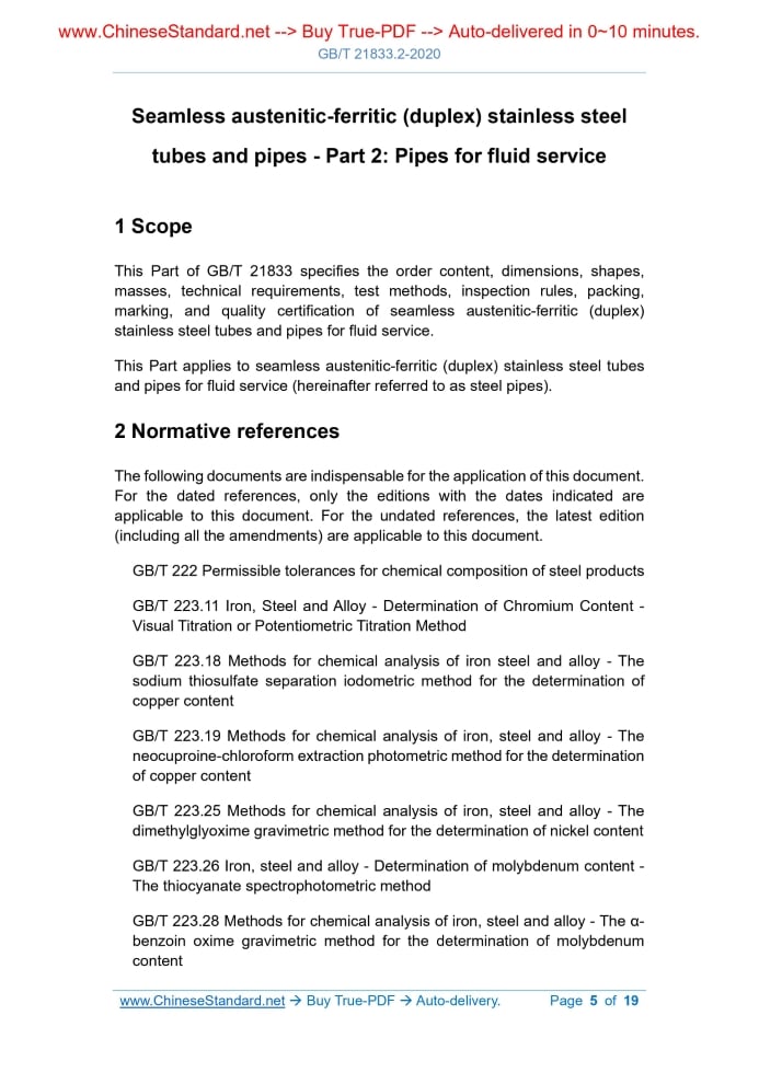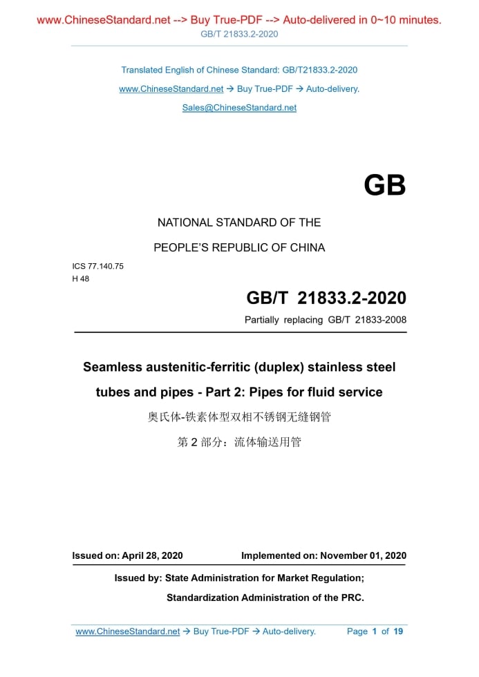 GB/T 21833.2-2020: Seamless austenitic-ferritic (duplex) stainless steel tubes and pipes - Part 2: Pipes for fluid service Delivery: 9 seconds. True-PDF full-copy in English & invoice will be downloaded + auto-delivered via email. See step-by-step procedure Status: Valid