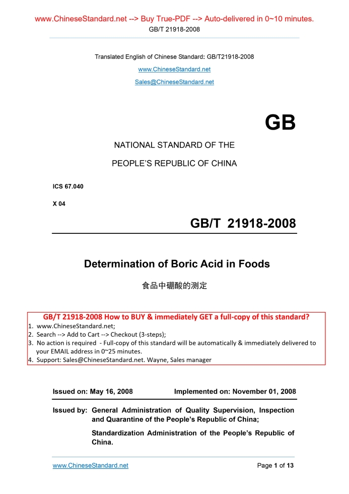 GB/T 21918-2008: Determination of boric acid in foods Delivery: 9 seconds. True-PDF full-copy in English & invoice will be downloaded + auto-delivered via email. See step-by-step procedure Status: Obsolete