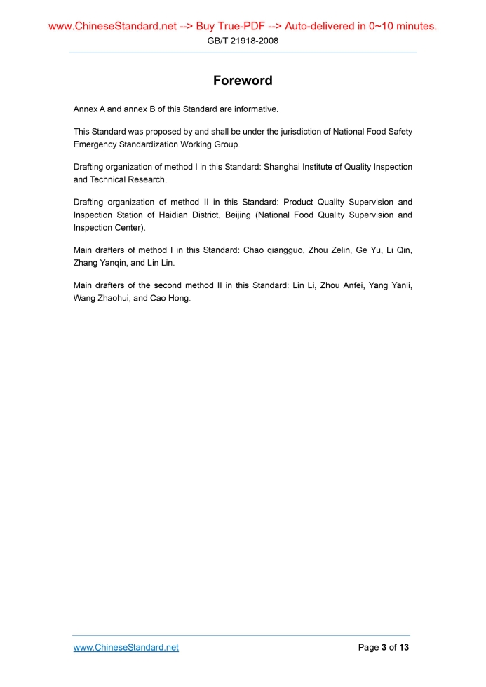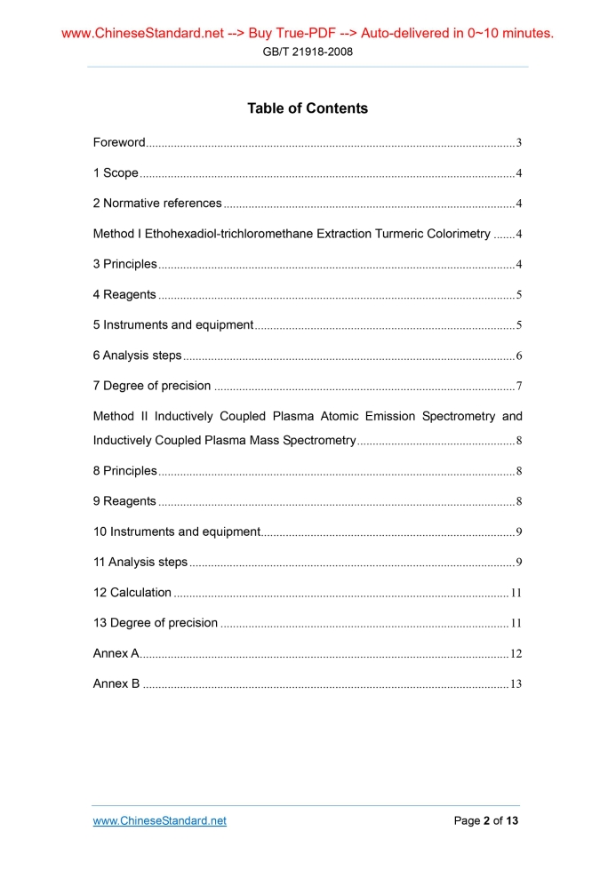 Similar standardsGB/T 21918-2008: Determination of boric acid in foods---This is an excerpt. Full copy of true-PDF in English version (including equations, symbols, images, flow-chart, tables, and figures etc.), auto-downloaded/delivered in 9 seconds, can be purchased online: https://www.ChineseStandard.net/PDF.aspx/GBT21918-2008GB NATIONAL STANDARD OF THE PEOPLE’S REPUBLIC OF CHINA ICS 67.040 X 04 Determination of Boric Acid in Foods Issued on: MAY 16, 2008 Implemented on: NOVEMBER 01, 2008 Issued by. General Administration of Quality Supervision, Inspection and Quarantine of the People’s Republic of China; Standardization Administration of the People’s Republic of China. Table of ContentsForeword ... 3 1 Scope ... 4 2 Normative references ... 4 Method I Ethohexadiol-trichloromethane Extraction Turmeric Colorimetry ... 4 3 Principles ... 4 4 Reagents ... 5 5 Instruments and equipment ... 5 6 Analysis steps ... 6 7 Degree of precision ... 7 Method II Inductively Coupled Plasma Atomic Emission Spectrometry and Inductively Coupled Plasma Mass Spectrometry ... 8 8 Principles ... 8 9 Reagents ... 8 10 Instruments and equipment ... 9 11 Analysis steps ... 9 12 Calculation ... 11 13 Degree of precision ... 11 Annex A ... 12 Annex B ... 13ForewordAnnex A and annex B of this Standard are informative. This Standard was proposed by and shall be under the jurisdiction of National Food Safety Emergency Standardization Working Group. Drafting organization of method I in this Standard. Shanghai Institute of Quality Inspection and Technical Research. Drafting organization of method II in this Standard. Product Quality Supervision and Inspection Station of Haidian District, Beijing (National Food Quality Supervision and Inspection Center). Main drafters of method I in this Standard. Chao qiangguo, Zhou Zelin, Ge Yu, Li Qin, Zhang Yanqin, and Lin Lin. Main drafters of the second method II in this Standard. Lin Li, Zhou Anfei, Yang Yanli, Wang Zhaohui, and Cao Hong. Determination of Boric Acid in Foods1 ScopeThis Standard specifies the determination method of boric acid in foods. This Standard applies to the determination of boric acid in aquatic products, meat products (e.g. meat balls, fish balls), beans, cooked wheaten food, dried bean curd sticks, traditional Chinese rice-pudding, cakes, soy sauce, and other foods. This Standard’s detection limit. 2.50 mg/kg for method I ethohexadiol-trichloromethane extraction turmeric colorimetry; 1.00 mg/kg for method II inductively coupled plasma atomic emission spectrometry (ICP-AES); 0.20 mg/kg for inductively coupled plasma mass spectrometry (ICP-MS) method.2 Normative referencesThe articles contained in the following documents have become part of this document when they are quoted herein. For the dated documents so quoted, all subsequent modifications (Including all corrections) or revisions made thereafter do not apply to this Standard. However, the parties who reach an agreement according to this Standard are encouraged to study whether the latest versions of these documents may be used. For the undated documents so quoted, the latest versions (including all modification sheets) apply to this document. GB/T 6682 Water for laboratory use; Specifications (GB/T 6682-1992, neq ISO 3696. 1987) Method I Ethohexadiol-trichloromethane Extraction Turmeric Colorimetry3 PrinciplesGather and extract boric acid in samples through ethohexadiol-trichloromethane solution; remove the impact of coexisting salts; use protonated turmeric generated from the mixture of concentrated sulfuric acid and turmeric to react with boric acid to generate red products. Shade of solution color is in direct proportion to the content of boric acid in sample, which may be determined through colorimetry. In acidic conditions, borax exists in the form of 5.5 150 mL plastic beaker. 5.6 25 mL or 50 mL lidded plastic test tube. 5.7 Vortex oscillator.6 Analysis steps6.1 Preparation of standard curve Accurately measure 0.00, 1.00, 2.00, 3.00, 4.00 and 5.00 mL of standard solutions; place into 25 mL plastic tubes; add water to 5 mL respectively. Add 1 mL of sulfuric acid (1+1) solution; oscillate to mix; then add 5.00 mL of EHD-CHCl3 solution; put the cover; put into vortex oscillator to operate for about 2 min; stand still for layering; draw under layer’s EHD-CHCl3 solution; filter through Ø7cm dried fast filter paper. Respectively take 1.00 mL of filtrate; place into 50 mL plastic tube; successively add 1.0 mL of turmeric-glacial acetic acid solution and 5 mL of concentrated sulfuric acid; oscillate uniformly; stand still for 30 min; add 25 mL of anhydrous alcohol; after standing still for 10 min, measure absorbance at 550nm with 1 cm cuvette. Take standard series boric acid amount (μg) as abscissa, and absorbance as ordinate; draw the standard curve. 6.2 Determination 6.2.1 Sample treatment Solid samples. Weigh 2.00 g~10.00 g (accurate to 0.01 g) of samples; use high-speed masher to mash; add 40 mL~60 mL of water and mix well; slowly add 2 mL of concentrated sulfuric acid drop-by-drop; apply ultrasound for 10 min to promote the dissolution and mixing. Add 5 mL of zinc acetate solution and 5 mL of potassium ferrocyanide solution; add water to a fixed volume 100 mL; use as sample solution after filtration. Take 1.00 mL~3.00 mL of sample solution according to the content of sample; place into a 25 mL plastic tube; add water to 5 mL. Add 1 mL of sulfuric acid (1 + 1) solution; oscillate to mix well. Then add 5.00 mL of EHD-CHCl3 solution; put the cover; oscillator operates for 2 min; stand still for layering; draw under layer’s EHD-CHCl3 solution; filter through Ø7cm dried fast filter paper. Liquid samples. Weigh 2.00 g~10.00 g of samples (accurate to 0.01 g); add water to a constant volume 100 mL as sample solution. For liquid samples with high protein or fat content, 5 mL of zinc acetate solution may be added to the samples; add water to a constant volume 100 mL and use it as sample sol