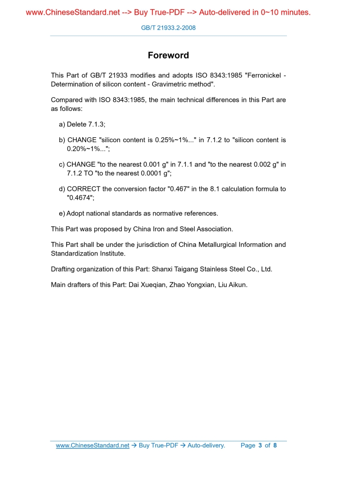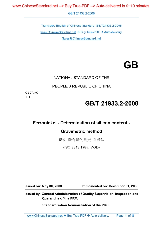 GB/T 21933.2-2008: Ferronickel -- Determination of silicon content -- Gravimetric method Delivery: 9 seconds. True-PDF full-copy in English & invoice will be downloaded + auto-delivered via email. See step-by-step procedure Status: Valid