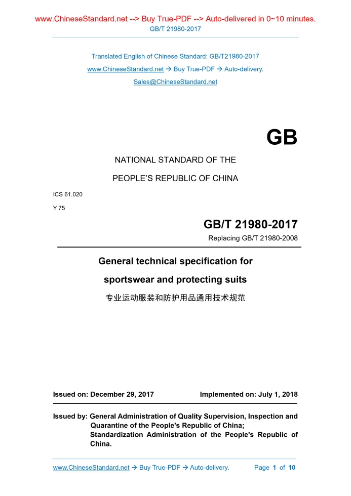 GB/T 21980-2017: General technical specification for sportswear and protecting suits Delivery: 9 seconds. True-PDF full-copy in English & invoice will be downloaded + auto-delivered via email. See step-by-step procedure Status: Valid GB/T 21980: Historical versions