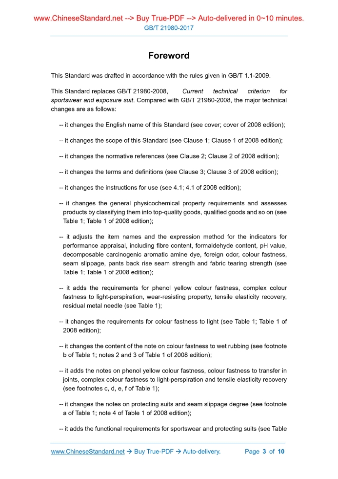 Similar standardsGB/T 21980-2017: General technical specification for sportswear and protecting suits---This is an excerpt. Full copy of true-PDF in English version (including equations, symbols, images, flow-chart, tables, and figures etc.), auto-downloaded/delivered in 9 seconds, can be purchased online: https://www.ChineseStandard.net/PDF.aspx/GBT21980-2017GB NATIONAL STANDARD OF THE PEOPLE’S REPUBLIC OF CHINA ICS 61.020 Y 75 Replacing GB/T 21980-2008 General technical specification for sportswear and protecting suits Issued on: DECEMBER 29, 2017 Implemented on: JULY 1, 2018 Issued by. General Administration of Quality Supervision, Inspection and Quarantine of the People's Republic of China; Standardization Administration of the People's Republic of China. Table of ContentsForeword ... 3 1 Scope ... 5 2 Normative references ... 5 3 Terms and definitions ... 6 4 Requirements ... 7 5 Test methods ... 9 6 Inspection rules ... 10 7 Marking, packaging, transportation and storage ... 10ForewordThis Standard was drafted in accordance with the rules given in GB/T 1.1-2009. This Standard replaces GB/T 21980-2008, Current technical criterion for sportswear and exposure suit. Compared with GB/T 21980-2008, the major technical changes are as follows. -- it changes the English name of this Standard (see cover; cover of 2008 edition); -- it changes the scope of this Standard (see Clause 1; Clause 1 of 2008 edition); -- it changes the normative references (see Clause 2; Clause 2 of 2008 edition); -- it changes the terms and definitions (see Clause 3; Clause 3 of 2008 edition); -- it changes the instructions for use (see 4.1; 4.1 of 2008 edition); -- it changes the general physicochemical property requirements and assesses products by classifying them into top-quality goods, qualified goods and so on (see Table 1; Table 1 of 2008 edition); -- it adjusts the item names and the expression method for the indicators for performance appraisal, including fibre content, formaldehyde content, pH value, decomposable carcinogenic aromatic amine dye, foreign odor, colour fastness, seam slippage, pants back rise seam strength and fabric tearing strength (see Table 1; Table 1 of 2008 edition); -- it adds the requirements for phenol yellow colour fastness, complex colour fastness to light-perspiration, wear-resisting property, tensile elasticity recovery, residual metal needle (see Table 1); -- it changes the requirements for colour fastness to light (see Table 1; Table 1 of 2008 edition); -- it changes the content of the note on colour fastness to wet rubbing (see footnote b of Table 1; notes 2 and 3 of Table 1 of 2008 edition); -- it adds the notes on phenol yellow colour fastness, colour fastness to transfer in joints, complex colour fastness to light-perspiration and tensile elasticity recovery (see footnotes c, d, e, f of Table 1); -- it changes the notes on protecting suits and seam slippage degree (see footnote a of Table 1; note 4 of Table 1 of 2008 edition); -- it adds the functional requirements for sportswear and protecting suits (see Table General technical specification for sportswear and protecting suits1 ScopeThis Standard specifies the requirements, test methods, inspection rules and marking, packaging, transportation and storage requirements for sportswear and protecting suits. This Standard applies to sportswear and protecting suits, which are made using textile fabric as the principal raw material. This Standard does not apply to the clothing for infants aged 36 months or less.2 Normative referencesThe following referenced documents are indispensable for the application of this document. For dated references, only the edition dated applies to this document. For undated references, the latest edition of the referenced documents (including all amendments) applies to this document. GB/T 3917.2, Textiles – Tear properties of fabrics – Part 2. Determination of tear force of trouser-shaped test specimens (Single tear method) GB/T 3921-2008, Textiles – Tests for colour fastness – Colour fastness to washing with soap or soap and soda GB/T 4744, Textiles – Testing and evaluation for water resistance – Hydrostatic pressure method GB/T 4745, Textile fabrics – Determination of resistance to surface wetting – Spray test GB/T 4841.3, Colour cards of standard depths for dyeing with dyestuffs 2/1, 1/3, 1/6, 1/12, 1/25 GB/T 5296.4, Instructions for use of products of consumer interest – Part 4. Textiles and apparel GB/T 8427-2008, Textiles – Tests for colour fastness – Colour fastness to artificial light. Xenon arc fading lamp test GB/T 8629-2017, Textiles – Domestic washing and drying procedures for textile testing GB/T 8630, Textiles - Determination of dimensional change in washing and drying GB/T 12704.1-2009, Textiles – Test method for water-vapour transmission of fabrics – Part 1. Desiccant method GB/T 15557, Standard terminology relating to apparel GB 18401, National general safety technical code for textile products GB/T 18830, Textiles – Evaluation for solar ultraviolet radiation protective properties GB/T 21294, Testing methods of physical and chemical performance of garments GB/T 21295, Requirements of physical and chemical performance of garments GB/T 21655.1, Textiles – Evaluation of absorption and quick-drying – Part 1. Method for combination tests GB/T 21655.2, Textiles – Evaluation of absorption and quick-drying – Part 2. Method for moisture management tests GB/T 24121, Textile products – Determination of the remains of broken sewing needle GB/T 29862, Textiles – Identification of fibre content GB/T 31127-2014, Textiles – Tests for colour fastness – Colour fastness to transfer in joints FZ/T 01034, Textiles – Test methods of the tensile elasticity for woven fabrics FZ/T 80002, Marking, packaging, transportation and storage for garments3 Terms and definitionsFor the purposes of this document, the following terms and definitions, and those defined in