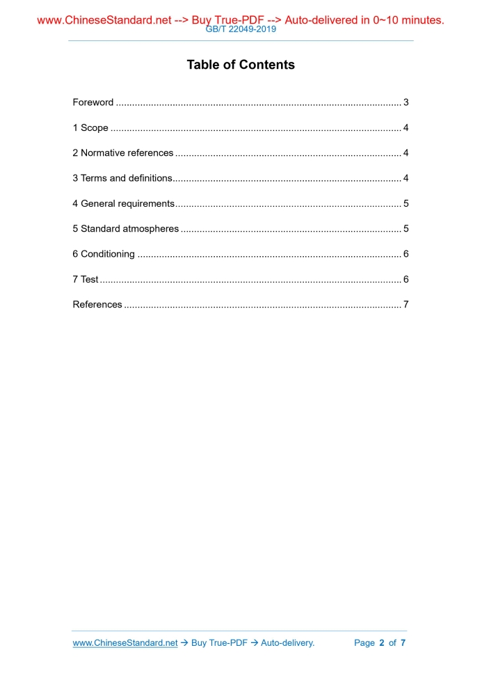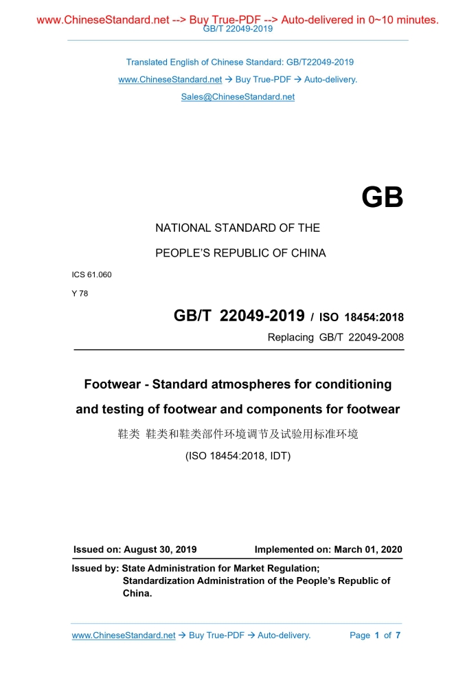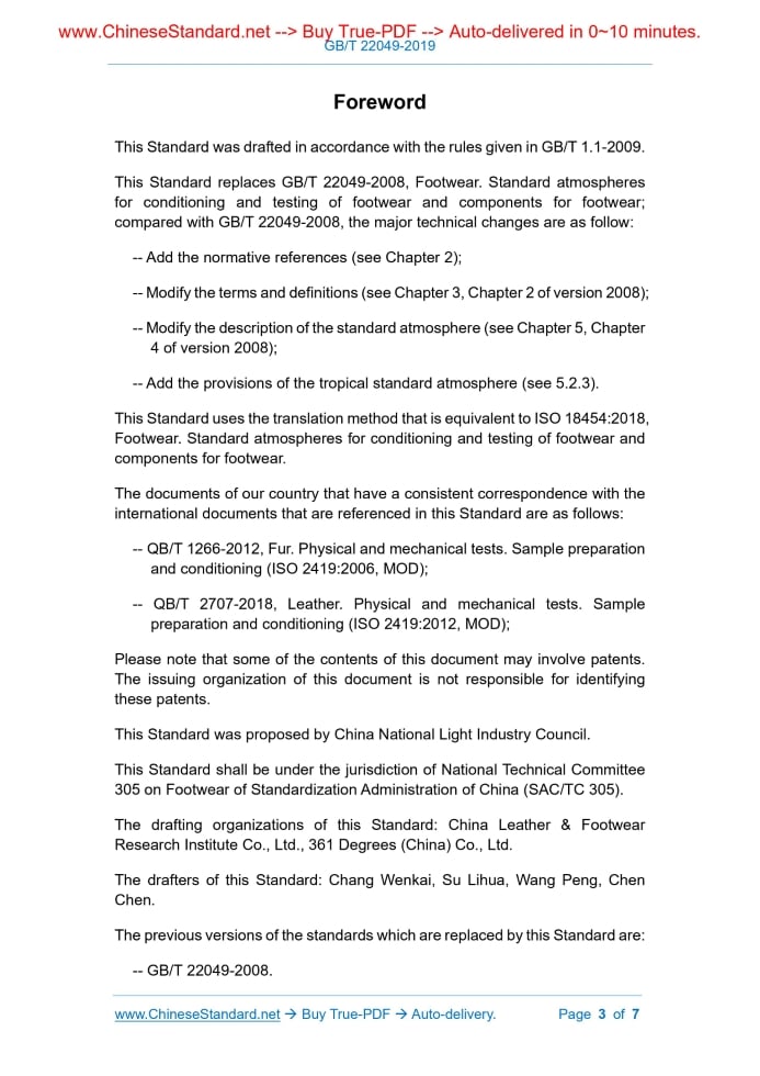 Similar standardsGB/T 22049-2019: Footwear - Standard atmospheres for conditioning and testing of footwear and components for footwear---This is an excerpt. Full copy of true-PDF in English version (including equations, symbols, images, flow-chart, tables, and figures etc.), auto-downloaded/delivered in 9 seconds, can be purchased online: https://www.ChineseStandard.net/PDF.aspx/GBT22049-2019 NATIONAL STANDARD OF THE PEOPLE’S REPUBLIC OF CHINA ICS 61.060 Y 78 GB/T 22049-2019 / ISO 18454:2018 Replacing GB/T 22049-2008 Footwear - Standard atmospheres for conditioning and testing of footwear and components for footwear (ISO 18454:2018, IDT) ISSUED ON: AUGUST 30, 2019 IMPLEMENTED ON: MARCH 01, 2020 Issued by: State Administration for Market Regulation; Standardization Administration of the People’s Republic of China. Table of ContentsForeword ... 3 1 Scope ... 4 2 Normative references ... 4 3 Terms and definitions ... 4 4 General requirements ... 5 5 Standard atmospheres ... 5 6 Conditioning ... 6 7 Test ... 6 References ... 7ForewordThis Standard was drafted in accordance with the rules given in GB/T 1.1-2009. This Standard replaces GB/T 22049-2008, Footwear. Standard atmospheres for conditioning and testing of footwear and components for footwear; compared with GB/T 22049-2008, the major technical changes are as follow: -- Add the normative references (see Chapter 2); -- Modify the terms and definitions (see Chapter 3, Chapter 2 of version 2008); -- Modify the description of the standard atmosphere (see Chapter 5, Chapter 4 of version 2008); -- Add the provisions of the tropical standard atmosphere (see 5.2.3). This Standard uses the translation method that is equivalent to ISO 18454:2018, Footwear. Standard atmospheres for conditioning and testing of footwear and components for footwear. The documents of our country that have a consistent correspondence with the international documents that are referenced in this Standard are as follows: -- QB/T 1266-2012, Fur. Physical and mechanical tests. Sample preparation and conditioning (ISO 2419:2006, MOD); -- QB/T 2707-2018, Leather. Physical and mechanical tests. Sample preparation and conditioning (ISO 2419:2012, MOD); Please note that some of the contents of this document may involve patents. The issuing organization of this document is not responsible for identifying these patents. This Standard was proposed by China National Light Industry Council. This Standard shall be under the jurisdiction of National Technical Committee 305 on Footwear of Standardization Administration of China (SAC/TC 305). The drafting organizations of this Standard: China Leather & Footwear Research Institute Co., Ltd., 361 Degrees (China) Co., Ltd. The drafters of this Standard: Chang Wenkai, Su Lihua, Wang Peng, Chen Chen. The previous versions of the standards which are replaced by this Standard are: -- GB/T 22049-2008. Footwear - Standard atmospheres for conditioning and testing of footwear and components for footwear1 ScopeThis Standard specifies the standard atmospheres for conditioning and testing the performance of footwear and components for footwear This Standard defines two standard atmospheres for conditioning and testing of footwear and components for footwear.2 Normative referencesThe following documents are indispensable for the application of this document. For dated references, only the dated version applies to this document. For undated references, the latest edition (including all amendments) applies to this document. ISO 2419, Leather - Physical and mechanical tests - Sample preparation and conditioning3 Terms and definitionsTerms and definitions determined by ISO 2419 and the following ones are applicable to this document. The ISO and IEC standardized terminology database addresses are as follows: -- ISO online browsing platform: https://www.iso.org/obp -- IEC online browsing platform: https://www.electropedia.org/ 3.1 Atmosphere Ambient conditions that are defined by parameters such as temperature and relative humidity. 3.2 Standard atmosphere The relevant parameters can be kept within the specified tolerance range; before the test, the sample is placed within the specified time. ......Source: Above contents are excerpted from the full-copy PDF -- translated/reviewed by: www.ChineseStandard.net / Wayne Zheng et al. Tips & Frequently Asked Questions:Question 1: How long will the true-PDF of English version of GB/T 22049-2019 be delivered?Answer: The full copy PDF of English version of GB/T 22049-2019 can be downloaded in 9 seconds, and it will also be emailed to you in 9 seconds (double mechanisms to ensure the delivery reliably), with PDF-invoice.Question 2: Can I share the purchased PDF of GB/T 22049-2019_English with my colleagues?Answer: Yes. The purchased PDF of GB/T 22049-2019_English will be deemed to be sold to your employer/organization who actually paid for it, including your colleagues and your employer's intranet.Question 3: Does the price include tax/VAT?Answer: Yes. Our tax invoice, downloaded/delivered in 9 seconds, includes all tax/VAT and complies with 100+ countries' tax regulations (tax exempted in 100+ countries) -- See Avoidance of Double Taxation Agreements (DTAs): List of DTAs signed between Singapore and 100+ countriesQuestion 4: Do you accept my currency other than USD?Answer: Yes. www.ChineseStandard.us -- GB/T 22049-2019 -- Click this link and select your country/currency to pay, the exact amount in your currency will be printed on the invoice. Full PDF will also be downloaded/emailed in 9 seconds.Question 5: Should I purchase the latest version GB/T 22049-2019?Answer: Yes. Unless special scenarios such as technical constraints or academic study, you should always prioritize to purchase the latest version GB/T 22049-2019 even if the enforcement date is in future. Complying with the latest version means that, by default, it also complies with all the earlier versions, technically.How to buy and download a true PDF of