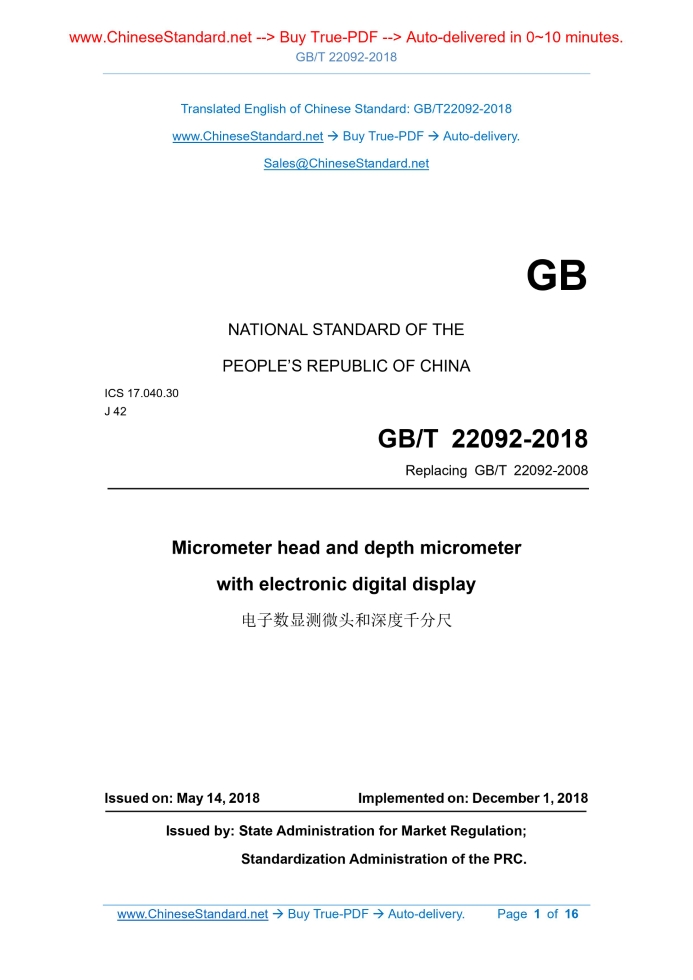 Similar standardsGB/T 22092-2018: Micrometer head and depth micrometer with electronic digital display---This is an excerpt. Full copy of true-PDF in English version (including equations, symbols, images, flow-chart, tables, and figures etc.), auto-downloaded/delivered in 9 seconds, can be purchased online: https://www.ChineseStandard.net/PDF.aspx/GBT22092-2018GB NATIONAL STANDARD OF THE PEOPLE’S REPUBLIC OF CHINA ICS 17.040.30 J 42 Replacing GB/T 22092-2008 Micrometer head and depth micrometer with electronic digital display Issued on: MAY 14, 2018 Implemented on: DECEMBER 1, 2018 Issued by. State Administration for Market Regulation; Standardization Administration of the PRC. Table of ContentsForeword ... 3 1 Scope ... 5 2 Normative references ... 5 3 Terms and definitions ... 6 4 Type and basic parameters ... 6 5 Requirements ... 8 6 Inspection methods ... 11 7 Test methods ... 14 8 Marking and packaging ... 15 Micrometer head and depth micrometer with electronic digital display1 ScopeThis Standard specifies the terms and definitions, type and basic parameters, requirements, inspection methods, test methods, marking and packaging of micrometer head and depth micrometer with electronic digital display. This Standard is applicable to the micrometer head with electronic digital display with a resolution of 0.001 mm, a range of less than or equal to 50 mm, and the depth micrometer with electronic digital display with an upper limit of measurement range of 300 mm.2 Normative referencesThe following documents are indispensable for the application of this document. For the dated references, only the editions with the dates indicated are applicable to this document. For the undated references, the latest edition (including all the amendments) are applicable to this document. GB/T 1216-2018 External micrometer GB/T 2423.3-2016 Environmental testing - Part 2. Testing method - Test Cab. Damp heat, steady state GB/T 2423.22-2012 Environmental testing - Part 2. Tests methods - Test N. Change of temperature GB/T 4208-2017 Degrees of protection provided by enclosure (IP code) GB/T 1800.2-2009 Geometrical product specifications (GPS) - Limits and fits - Part 2. Tables of standard tolerance grades and limit deviations for holes and shafts GB/T 17163-2008 Glossary of terms used in dimensional measuring instruments - General terms GB/T 17164-2008 Glossary of terms used in dimensional measuring instruments - Product terms 4.2.4 The lower limit of the measurement range of depth micrometer with electronic digital display shall be an integral multiple of 0 mm or 25 mm.5 Requirements5.1 Appearance 5.1.1 The surface of micrometer head with electronic digital display and depth micrometer with electronic digital display shall not have defects such as cracks, scratches, bumps, rust, burrs, etc. which affect the appearance and service performance. 5.1.2 The plating and coating on the surface of micrometer head with electronic digital display and depth micrometer with electronic digital display shall not have falling off and other defects such as uneven color which affect the appearance. 5.1.3 The digital display of the electronic digital display device shall be transparent, clean, free of defects such as scratches, bubbles, etc. which affect the reading. 5.2 Material 5.2.1 The base plate of depth micrometer with electronic digital display shall be made of alloy tool steel, stainless steel, or other materials with similar properties. 5.2.2 The micrometric screw and measuring rod shall be made of alloy tool steel, stainless steel, or other materials with similar properties. The measuring surface shall be inlaid with cemented carbide or other wear-resistant materials. 5.3 Interaction 5.3.1 The micrometric screw and nut, within the full range, shall be fully meshed, and the fit shall be good. There shall be no jamming and obvious axial float. 5.3.2 The fit between the smooth cylindrical portion of micrometric screw and the shaft sleeve shall be good. There shall be no obvious radial swing. 5.4 Force measuring device The micrometer head with electronic digital display and depth micrometer with electronic digital display shall be equipped with a force measuring device. The measuring force which acts on the measuring surface by the force measuring device shall be between 4 N~10 N. The change of the measuring force shall be no more than 2 N. 5.5 Locking device 5.8.3 The flatness tolerance of base plate measuring surface with a length of 50 mm of depth micrometer with electronic digital display shall not exceed 1.5 μm. The flatness tolerance of base plate measuring surface with a length of 100 mm shall not exceed 2.0 μm. 5.8.4 The perpendicularity error of the micrometric screw measuring surface of micrometer head with electronic digital display against its axis shall not be greater than 0.6 μm. 5.8.5 When the measuring surface of the measuring rod of depth micrometer with electronic digital display is flat, the parallelism tolerance between the measuring surface of measuring rod and the measuring surface of base plate shall not exceed the requirements of Table 1. 5.9 Scale mark The scale mark on micrometer head with electronic digital display and depth micrometer with electronic digital display shall be in accordance with the provisions of 5.9 in GB/T 1216-2018. 5.10 Electronic digital display device 5.10.1 Function keys. The function keys of the electronic digital display device shall be flexible and reliable. The marked symbols or image-text shall be clear and accurate in meaning. 5.10.2 Digital display. The digital display of the electronic digital display device shall be clear, complete, and free of flash jump. The word height shall not be less than 4 mm. 5.10.3 Error of division. The error of division of the electronic digital display device shall not exceed 0.002 mm. 5.10.4 Numerical drift. The numerical drift of the electronic digital display device within 1 h shall not be greater than its resolution. 5.10.5 