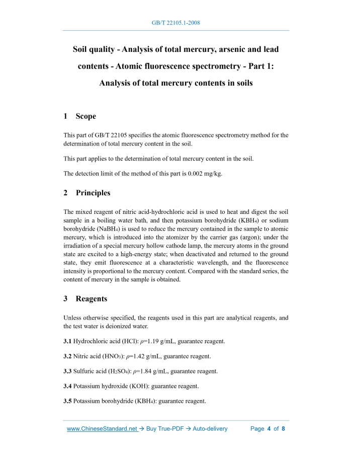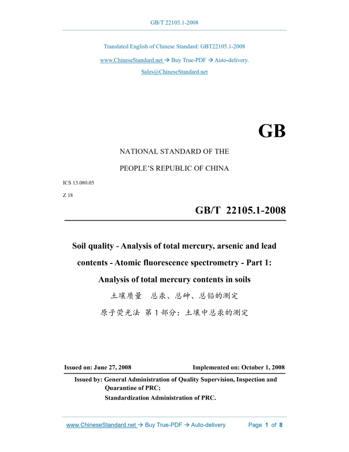 GB/T 22105.1-2008: Soil quality -- Analysis of total mercury, arsenic and lead contents -- Atomic fluorescence spectrometry -- Part 1: Analysis of total mercury contents in soils Delivery: 9 seconds. True-PDF full-copy in English & invoice will be downloaded + auto-delivered via email. See step-by-step procedure Status: Valid