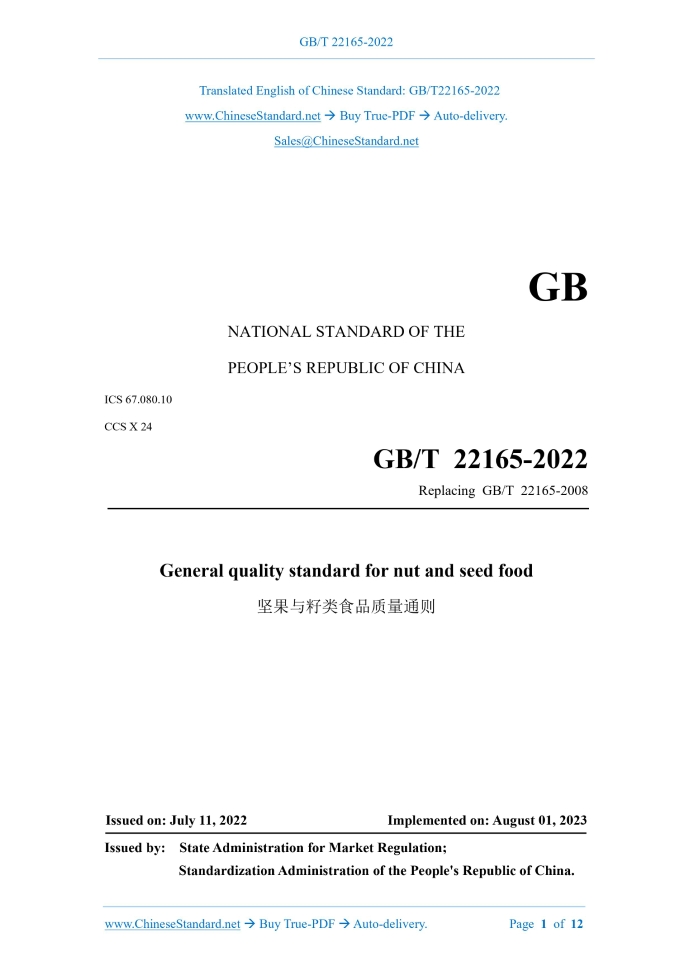 GB NATIONAL STANDARD OF THE PEOPLE’S REPUBLIC OF CHINA ICS 67.080.10 CCS X 24 Replacing GB/T 22165-2008 General quality standard for nut and seed food Issued on. JULY 11, 2022 Implemented on. AUGUST 01, 2023 Issued by. State Administration for Market Regulation; Standardization Administration of the People's Republic of China.