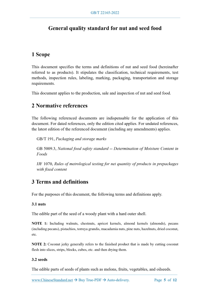 This document was drafted in accordance with the rules given in GB/T 1.1-2020 "Directives for standardization - Part 1.Rules for the structure and drafting of standardizing documents". This document replaces GB/T 22165-2008 "General standard for roasted seeds and nuts". Compared with GB/T 22165-2008, in addition to structural adjustments and editorial changes, the main technical changes are as follows. a) Changed the name of the standard was changed to "General quality standard for nut and seed food"; b) Changed the terms and definitions of nut and seed food (see 3.4 of this Edition; 3.1 of Edition 2008); c) Added the terms and definitions of nuts, seeds, kernel, spoiled kernel, injured kernel, and empty withered seed (see 3.1, 3.2, 3.3, 3.5, 3.6, and 3.7 of this Edition); d) Changed the classification (see Chapter 4 of this Edition; Chapter 4 of Edition 2008); e) Changed the sensory requirements (see 5.2 of this Edition; 5.2 of Edition 2008); f) Changed the physical and chemical requirements (see 5.3 of this Edition; 5.3 of Edition 2008); g) Deleted the hygiene indicators, food additives, and hygiene requirements for the production and processing process (see 5.4, 5.5, and 5.7 of Edition 2008); h) Changed the test methods (see 6.1, 6.2 of this Edition; 6.1, 6.2 of Edition 2008); i) Deleted the test methods for hygienic indicators (see 6.3 of Edition 2008); j) Changed the inspection rules (see 7.1, 7.2, 7.3, 7.4; 7.1, 7.2, 7.3, 7.4 of Edition 2008); k) Changed the labeling, marking, packaging, transportation and storage requirements (see 8.1.1, 8.1.3, 8.2, 8.3, 8.4 of this Edition; 8.1.1, 8.2, 8.3, 8.4 of Edition 2008). Attention is drawn to the possibility that some of the elements of this document may be the subject of patent rights. The issuing authority shall not be held responsible for identifying any or all such patent rights. This document was proposed by and shall be under the jurisdiction of China Light Industry Federation. The drafting organizations of this document. China Food Industry Association, Qia Qia Food Co., Ltd., Zhejiang Dahaoda Food Co., Ltd., Three Squirrels Co., Ltd., Fujian Bailian Industrial Co., Ltd., Ningbo Hengkang Food Co., Ltd., Xianyang Rainbow Trading Food Co., Ltd., Hangzhou Yaoshengji Food Co., Ltd., Sichuan Huiji Food Co., Ltd., California Yuanye (Bazhou City) Food Co., Ltd., Bestore Co., Ltd., Shanghai Laiyifen Co., Ltd., and Qingdao Wolong Food Co., Ltd. Main drafters of this document. Weng Yangyang, Ma Liangping, Sun Mei, Wu Shunye, Wei Benqiang, Chen Juli, Chen Yinquan, Zhang Ani, Deng Yangyong, Lyu Jingang, Chen Junxing, Yang Yinfen, Zhang Lihua, Yang Guoqing. Versions of standard substituted by this document are. -It was first published in 2008 as GB/T 22165-2008; - This is the first revision. General quality standard for nut and seed food