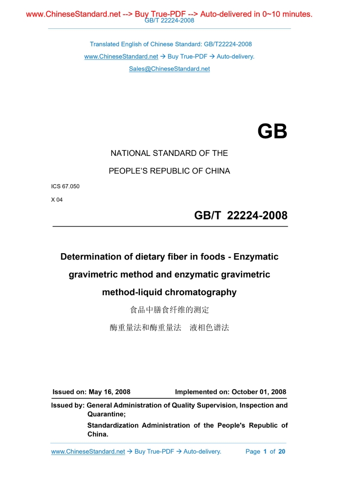GB/T 22224-2008: Determination of dietary fiber in foods -- Enzymatic gravimetric method and enzymatic gravimetric method -- Liquid chromatography Delivery: 9 seconds. True-PDF full-copy in English & invoice will be downloaded + auto-delivered via email. See step-by-step procedure Status: Valid