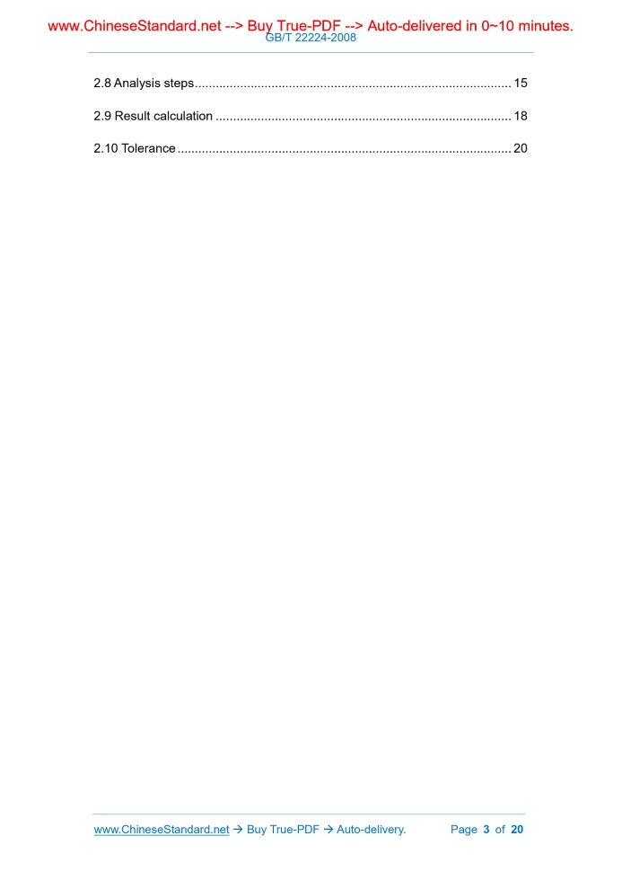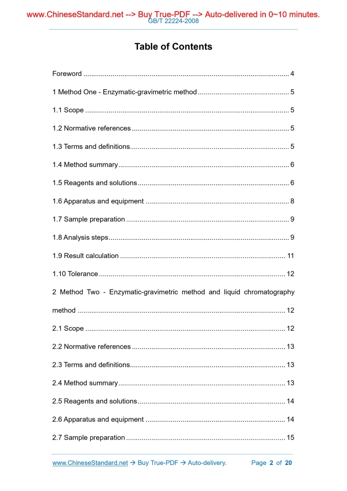 Similar standardsGB/T 22224-2008: Determination of dietary fiber in foods -- Enzymatic gravimetric method and enzymatic gravimetric method -- Liquid chromatography---This is an excerpt. Full copy of true-PDF in English version (including equations, symbols, images, flow-chart, tables, and figures etc.), auto-downloaded/delivered in 9 seconds, can be purchased online: https://www.ChineseStandard.net/PDF.aspx/GBT22224-2008 NATIONAL STANDARD OF THE PEOPLE’S REPUBLIC OF CHINA ICS 67.050 X 04 Determination of dietary fiber in foods - Enzymatic gravimetric method and enzymatic gravimetric method-liquid chromatography Issued on. MAY 16, 2008 Implemented on. OCTOBER 01, 2008 Issued by. General Administration of Quality Supervision, Inspection and Quarantine; Standardization Administration of the People's Republic of China. Table of ContentsForeword... 4 1 Method One - Enzymatic-gravimetric method... 5 1.1 Scope... 5 1.2 Normative references... 5 1.3 Terms and definitions... 5 1.4 Method summary... 6 1.5 Reagents and solutions... 6 1.6 Apparatus and equipment... 8 1.7 Sample preparation... 9 1.8 Analysis steps... 9 1.9 Result calculation... 11 1.10 Tolerance... 12 2 Method Two - Enzymatic-gravimetric method and liquid chromatography method... 12 2.1 Scope... 12 2.2 Normative references... 13 2.3 Terms and definitions... 13 2.4 Method summary... 13 2.5 Reagents and solutions... 14 2.6 Apparatus and equipment... 14 2.7 Sample preparation... 15 2.8 Analysis steps... 15 2.9 Result calculation... 18 2.10 Tolerance... 201 Method One - Enzymatic-gravimetric method1.1 Scope Method One of this Standard specifies the conditions and detailed analysis steps for the determination of total, soluble and insoluble dietary fiber in foods by enzymatic-gravimetric method. Method One of this Standard is applicable to the determination of total, soluble and insoluble dietary fiber in cereals, vegetables and fruits as well as their products. But it is not applicable to the determination of dietary fiber in foods containing low-molecular-mass resistant maltodextrin, oligofructose, galacto- oligosaccharides, polyglucose and resistant starch. 1.2 Normative references The provisions in following documents become the provisions of this Standard through reference in this Standard. For dated references, the subsequent amendments (excluding corrigendum) or revisions do not apply to this Standard, however, parties who reach an agreement based on this Standard are encouraged to study if the latest versions of these documents are applicable. 1.3 Terms and definitions For the purposes of Method One of this Standard, the following terms and definitions apply. 1.3.1 dietary fiber the sum of carbohydrates and their analogues that have anti-digestive properties, which cannot be absorbed by the human small intestine but can be partially or completely fermented in colon 1.3.2 total dietary fiber; TDF including insoluble dietary fiber (IDF) and high-molecular-mass soluble dietary fiber (SDF) that can be precipitated in ethanol 1.4 Method summary Use thermostable α-amylase, protease and amyloglucosidase to perform enzymatic digestion of the dried sample. Use ethanol to precipitate enzymatic hydrolysate. Filter. 1.5 Reagents and solutions Unless otherwise indicated, in analysis, it shall only use the confirmed analytically-pure reagent AND distilled water or deionized water or equivalent- pure water. 1.5.1 95% ethanol. 1.5.2 Thermostable α-amylase solution. CAS 9000-85-5, IUS 3.2.1.1; cannot contain glycerol as stabilizer. Store at 0°C ~ 5°C in refrigerator. 1.5.2.1 Enzyme activity representation 1.Starch is substrate. It is represented by Nelson / Somogyi reducing sugar -- 10,000 units/mL + 1,000 units/mL (1 enzyme activity unit is defined as. at 40°C, when pH6.5, the amount of enzyme required to release 1 μmol of reducing sugar per minute). 1.5.5 Pickled diatomite. CAS 68855-54-9.Take 200 g of diatomite in 600 mL of hydrochloric acid (HCl. H2O = 1.4, volume ratio). Soak overnight. Filter. Use distilled water to wash until the filtrate is neutral. Place in 525°C ± 5°C muffle furnace to burn the ash. Leave it for use. 1.5.6 2-(N-morpholino)-sulfonate ethane (MES). CAS 4432-31-9, purity >99.5%. 1.5.7 Trihydroxymethyl aminomethane (TRIS). CAS 77-86-1, purity >99%. 1.5.8 MES-TRIS buffer (0.05 mol/L). Weigh 19.52 g of MES and 12.2 g of TRIS. Use 1.7 L of distilled water to dissolve. Use 6 mol/L sodium hydroxide to adjust pH to 8.2 ± 0.1.Add water to dilute to 2 L (attention. pH is 8.2 at 24°C; pH is 8.3 at 20°C; pH is 8.1 at 28°C. Be sure to adjust pH according to the temperature. The deviation between 20°C and 28°C is corrected by interpolation method). 1.5.9 Hydrochloric acid solution (0.561 mol/L). Take 93.5 mL of 6 mol/L hydrochloric acid. Add 700 mL of water. Mix well. Use water to set volume to 1 L. 1.5.10 Petroleum ether. Boiling range is 30°C ~ 60°C. 1.5.11 Acetone. 1.5.12 Sodium hydroxide. 1.6 Apparatus and equipment 1.6.1 High-type beaker without diversion inlet. 400 mL or 600 mL. 1.6.2 Crucible. with rough sintered glass plate; the aperture is 40 µm ~ 60 µm. Ash the cleaned crucible in muffle furnace at 525°C for 6 h. Take it out when the furnace temperature reduces below 130°C. Soak in potassium dichromate lotion for 2 h. Respectively use water and distilled water to rinse clean. In the end, use 15 mL of acetone to rinse then air-dry it. 1.6.3 Vacuum solvent filter. vacuum pump or aspirator with adjustment device. 1L suction-filtration bottle of which there is a suction-filtration mouth on the side wall; there is a rubber stopper matching with the suction-filtration bottle. It is used for the suction-filtration of enzymatic hydrolysate. 1.6.4 Constant-temperature oscillating water bath. 95°C ~ 100°C. 1.6.5 Analytical balance. resolution is 0.1 mg. 1.6.6 Balance (platform scale). measuring range is 4,000 g; resolution is 0.1 g. 1.6.7 Muffle furnace. 525°C ± 5°C. 1.6.8 Oven. 105°C, 130°C ± 3°C. 1.6.9 
