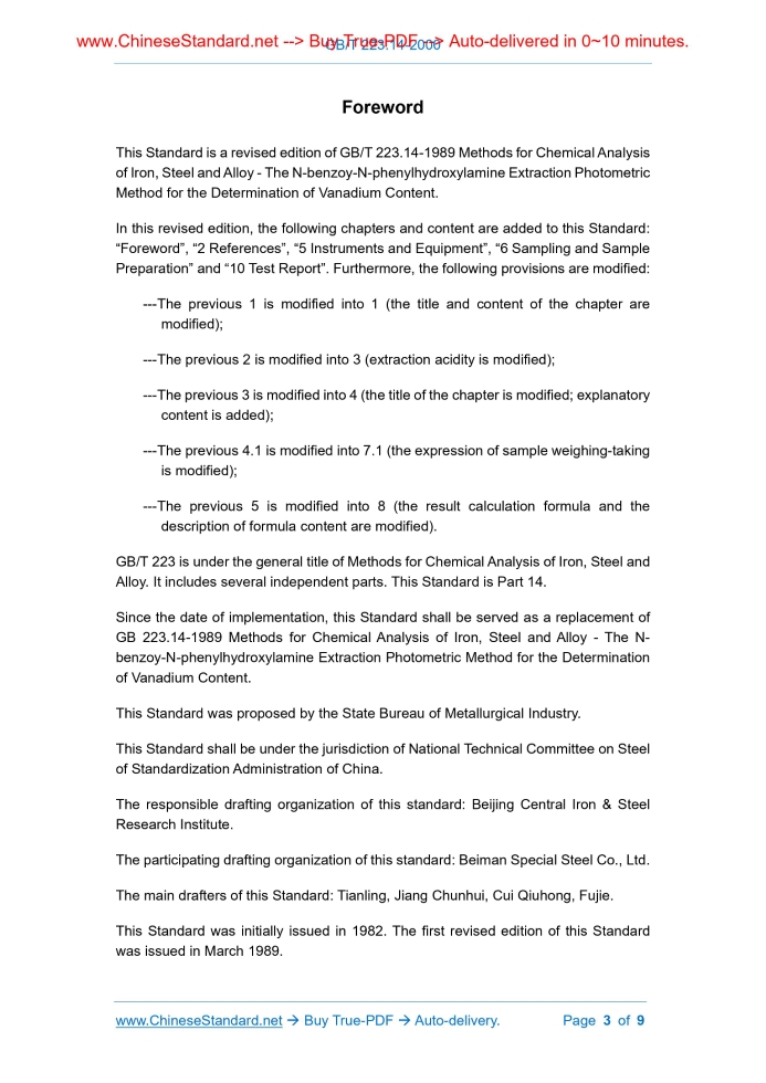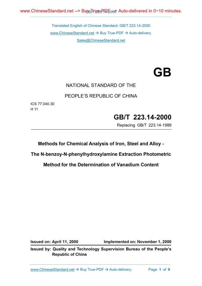 GB/T 223.14-2000: Methods for chemical analysis of iron, steel and alloy. The N-benzoyl-N-phenylhydroxylamine extraction photometric method for the determination of vanadium content Delivery: 9 seconds. True-PDF full-copy in English & invoice will be downloaded + auto-delivered via email. See step-by-step procedure GB/T 223.14: Historical versions