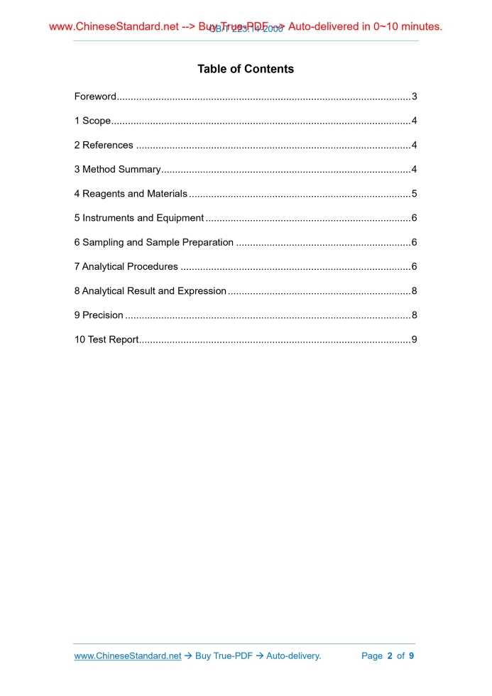 Similar standardsGB/T 223.14-2000: Methods for chemical analysis of iron, steel and alloy. The N-benzoyl-N-phenylhydroxylamine extraction photometric method for the determination of vanadium content---This is an excerpt. Full copy of true-PDF in English version (including equations, symbols, images, flow-chart, tables, and figures etc.), auto-downloaded/delivered in 9 seconds, can be purchased online: https://www.ChineseStandard.net/PDF.aspx/GBT223.14-2000 GB NATIONAL STANDARD OF THE PEOPLE’S REPUBLIC OF CHINA ICS 77.040.30 H 11 Replacing GB/T 223.14-1989 Methods for Chemical Analysis of Iron, Steel and Alloy - The N-benzoy-N-phenylhydroxylamine Extraction Photometric Method for the Determination of Vanadium Content Issued on: APRIL 11, 2000 Implemented on: NOVEMBER 1, 2000 Issued by. Quality and Technology Supervision Bureau of the People’s Republic of China Table of ContentsForeword ... 3 1 Scope ... 4 2 References ... 4 3 Method Summary ... 4 4 Reagents and Materials ... 5 5 Instruments and Equipment ... 6 6 Sampling and Sample Preparation ... 6 7 Analytical Procedures ... 6 8 Analytical Result and Expression ... 8 9 Precision ... 8 10 Test Report ... 9ForewordThis Standard is a revised edition of GB/T 223.14-1989 Methods for Chemical Analysis of Iron, Steel and Alloy - The N-benzoy-N-phenylhydroxylamine Extraction Photometric Method for the Determination of Vanadium Content. In this revised edition, the following chapters and content are added to this Standard. “Foreword”, “2 References”, “5 Instruments and Equipment”, “6 Sampling and Sample Preparation” and “10 Test Report”. Furthermore, the following provisions are modified. ---The previous 1 is modified into 1 (the title and content of the chapter are modified); ---The previous 2 is modified into 3 (extraction acidity is modified); ---The previous 3 is modified into 4 (the title of the chapter is modified; explanatory content is added); ---The previous 4.1 is modified into 7.1 (the expression of sample weighing-taking is modified); ---The previous 5 is modified into 8 (the result calculation formula and the description of formula content are modified). GB/T 223 is under the general title of Methods for Chemical Analysis of Iron, Steel and Alloy. It includes several independent parts. This Standard is Part 14. Since the date of implementation, this Standard shall be served as a replacement of GB 223.14-1989 Methods for Chemical Analysis of Iron, Steel and Alloy - The N- benzoy-N-phenylhydroxylamine Extraction Photometric Method for the Determination of Vanadium Content. This Standard was proposed by the State Bureau of Metallurgical Industry. This Standard shall be under the jurisdiction of National Technical Committee on Steel of Standardization Administration of China. The responsible drafting organization of this standard. Beijing Central Iron & Steel Research Institute. The participating drafting organization of this standard. Beiman Special Steel Co., Ltd. The main drafters of this Standard. Tianling, Jiang Chunhui, Cui Qiuhong, Fujie. This Standard was initially issued in 1982. The first revised edition of this Standard was issued in March 1989. Methods for Chemical Analysis of Iron, Steel and Alloy The N-benzoy-N-phenylhydroxylamine Extraction Photometric Method for the Determination of Vanadium Content1 ScopeThis Standard specifies the N-benzoy-N-phenylhydroxylamine extraction photometric method for the determination of vanadium content. This Standard is applicable to the determination of vanadium content in iron, steel and alloy under the range of 0.0050% (m/m) ~ 0.50% (m/m).2 ReferencesProvisions that are included in the following standards constitute the provisions of this Standard through the reference in this Standard. When this Standard was published, all the announced versions were valid. All the standards will be revised. Parties that adopt this Standard shall discuss the possibility of adopting the latest versions of the following standards. GB/T 222-1984 Method of Sampling Steel for Determination of Chemical Composition and Permissible Variations for Product Analysis GB/T 6379-1986 Precision of Test Methods Determination of Repeatability and Reproducibility for a Standard Test Method by Interlaboratory Tests3 Method SummaryAfter dissolving test piece with acid, in the medium of sulfuric acid-phosphoric acid, use potassium permanganate to oxidize vanadium and pentavalent at room temperature. Add tantalum reagent-trichloromethane solution; extract the complex of vanadium into trichloromethane. Then, measure the absorbance at the wavelength of 530 nm. Interference determination of color developing solution that contains over 1 mg of molybdenum and titanium. when hydrochloric acid concentration in the extract rises to 6 mol/L, the permissible amount of molybdenum can be raised to 2.5 mg. Use sulfuric acid-hydrogen peroxide solution to rinse the organic phase, then, the permissible amount of titanium can be increased to 5 mg. 8 mL of sulfuric acid (4.5) and 8 mL of phosphoric acid (4.7); continue to heat it up, evaporate it, till it emits smoke. At this moment, if there is carbide that is not damaged, add drops of nitric acid (4.4), then, re-evaporate it, till it emits smoke. Repeat this step till carbide is completely damaged. Wait till it is slightly cooled down, then, add 50 mL of water; heat it up to dissolve salt, then, cool it down to room temperature. Transfer it into a 100 mL volumetric flask; use water to dilute to the constant volume, then, mix it up. When there is precipitation, start dry filtration. 7.3.2 Oxidization of vanadium 7.3.2.1 Transfer-take 10.00 mL of test solution (7.3.1), place it in a 60 mL separating funnel. Add 1 mL of copper solution (4.8); shake it while adding drops of potassium permanganate solution (4.9), till it manifests steady red; maintain for 2 ~ 3 min. 7.3.2.2 Add 2 mL of uric acid solution (4.10); shake it continuously while adding drops of sodium nitrite 