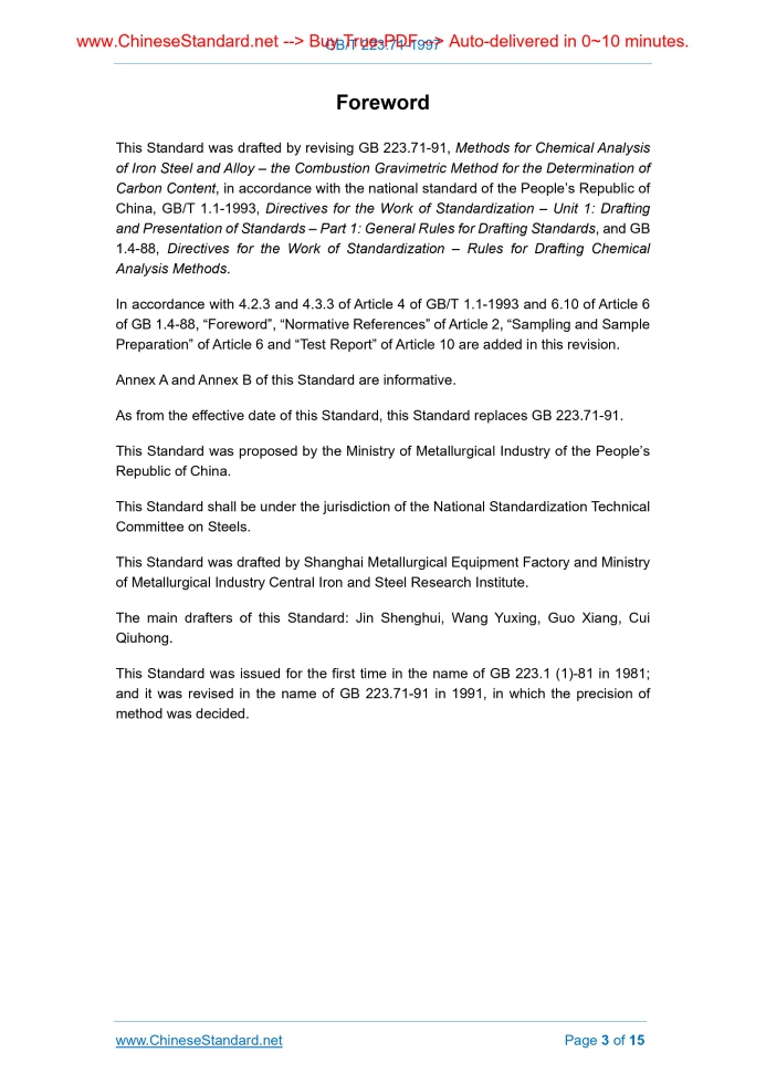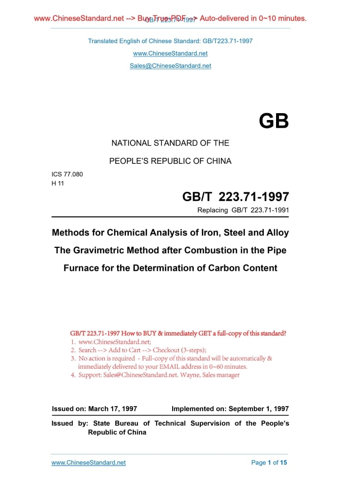 GB/T 223.71-1997: Methods for chemical analysis of iron, steel and alloy The gravimetric method after combustion in the pipe furnace for the determination of carbon content Delivery: 9 seconds. True-PDF full-copy in English & invoice will be downloaded + auto-delivered via email. See step-by-step procedure GB/T 223.71: Historical versions