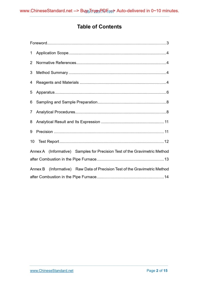 Similar standardsGB/T 223.71-1997: Methods for chemical analysis of iron, steel and alloy The gravimetric method after combustion in the pipe furnace for the determination of carbon content---This is an excerpt. Full copy of true-PDF in English version (including equations, symbols, images, flow-chart, tables, and figures etc.), auto-downloaded/delivered in 9 seconds, can be purchased online: https://www.ChineseStandard.net/PDF.aspx/GBT223.71-1997 GB NATIONAL STANDARD OF THE PEOPLE’S REPUBLIC OF CHINA ICS 77.080 H 11 Replacing GB/T 223.71-1991 Methods for Chemical Analysis of Iron, Steel and Alloy The Gravimetric Method after Combustion in the Pipe Furnace for the Determination of Carbon Content Issued on: MARCH 17, 1997 Implemented on: SEPTEMBER 1, 1997 Issued by. State Bureau of Technical Supervision of the People’s Republic of China Table of ContentsForeword ... 3 1 Application Scope ... 4 2 Normative References ... 4 3 Method Summary ... 4 4 Reagents and Materials ... 4 5 Apparatus ... 6 6 Sampling and Sample Preparation ... 8 7 Analytical Procedures ... 8 8 Analytical Result and Its Expression ... 11 9 Precision ... 11 10 Test Report ... 12 Annex A (Informative) Samples for Precision Test of the Gravimetric Method after Combustion in the Pipe Furnace ... 13 Annex B (Informative) Raw Data of Precision Test of the Gravimetric Method after Combustion in the Pipe Furnace ... 14ForewordThis Standard was drafted by revising GB 223.71-91, Methods for Chemical Analysis of Iron Steel and Alloy – the Combustion Gravimetric Method for the Determination of Carbon Content, in accordance with the national standard of the People’s Republic of China, GB/T 1.1-1993, Directives for the Work of Standardization – Unit 1. Drafting and Presentation of Standards – Part 1. General Rules for Drafting Standards, and GB 1.4-88, Directives for the Work of Standardization – Rules for Drafting Chemical Analysis Methods. In accordance with 4.2.3 and 4.3.3 of Article 4 of GB/T 1.1-1993 and 6.10 of Article 6 of GB 1.4-88, “Foreword”, “Normative References” of Article 2, “Sampling and Sample Preparation” of Article 6 and “Test Report” of Article 10 are added in this revision. Annex A and Annex B of this Standard are informative. As from the effective date of this Standard, this Standard replaces GB 223.71-91. This Standard was proposed by the Ministry of Metallurgical Industry of the People’s Republic of China. This Standard shall be under the jurisdiction of the National Standardization Technical Committee on Steels. This Standard was drafted by Shanghai Metallurgical Equipment Factory and Ministry of Metallurgical Industry Central Iron and Steel Research Institute. The main drafters of this Standard. Jin Shenghui, Wang Yuxing, Guo Xiang, Cui Qiuhong. This Standard was issued for the first time in the name of GB 223.1 (1)-81 in 1981; and it was revised in the name of GB 223.71-91 in 1991, in which the precision of method was decided. Methods for Chemical Analysis of Iron, Steel and Alloy The Gravimetric Method after Combustion in the Pipe Furnace for the Determination of Sulfur Content1 Application ScopeThis Standard specifies the gravimetric method after combustion in the pipe furnace for the determination of sulfur content. This Standard applies to the determination of carbon content of 0.10% (m/m) ~ 5.00% (m/m) in iron, steel, high temperature alloy and precision alloy.2 Normative ReferencesThe provisions in following documents become the provisions of this Standard through reference in this Standard. All editions shown are effective when this Standard is issued. All standards will be revised, however, parties who reach an agreement based on this Standard are encouraged to study if the latest versions of the following standards are applicable. GB 222-84, Method of Sampling Steel for Determination of Chemical Composition and Permissible Variations for Product Analysis GB 6379-86, Precision of Test Methods – Determination of Repeatability and Reproducibility for a Standard Test Method by Interlaboratory Tests3 Method SummaryTest sample and fluxing agent burn in a pipe furnace at high temperature (1 250°C ~ 1 350°C) by pumping in oxygen; carbon is fully oxidized into carbon dioxide. After removing sulphur dioxide, use the soda asbestos absorption flask of a known mass to absorb the carbon dioxide in the mixed gas. Weigh the increment of the absorption flask and calculated the carbon content of test sample based on the increment.4 Reagents and Materials4.1 Oxygen of purity not lower than 99.5% (m/m). If the content of organic impurities in oxygen is suspected, add one oxidation catalyst [copper oxide (II) or platinum] pipe heated to the temperature over 450°C for treatment before the purification equipment (5.1). 4.2 Solvent which is applicable to washing the grease or dirt on the surface of samples, such as acetone. 4.3 Magnesium perchlorate [Mg(ClO4)] of grain size 0.7 mm ~ 1.2 mm. 4.4 Fluxing agents, such as granular tin, copper wire, copper oxide, iron powder and vanadium pentoxide, whose carbon content shall be less than 0.002% (m/m). 4.5 Active manganese dioxide, which is granular. If there is no active manganese dioxide of appropriate grade, it may be prepared in accordance with the following method. In order to prepare about 50 g of active manganese dioxide, dissolve 200 g of manganese sulfate tetrahydrate (MnSO4·4H2O) to 2.5 L of water in a 4-L beaker, use ammonium hydroxide (ρ 0.90 g/mL) to adjust to alkalinity, add 1 L of a newly-prepared ammonium persulfate solution (225 g/L), heat the solution to boiling, continue boiling for 10 min, and constantly add ammonium hydroxide to keep the ammoniacal nature of the solution during the heating and boiling period and to make the precipitations fall. If the supernatant liquid is not clear or the precipitation does not fall rapidly, add 50 mL ~ 100 mL of the ammonium persulfate solution (225 g/L) more, boil for 10 min and keep