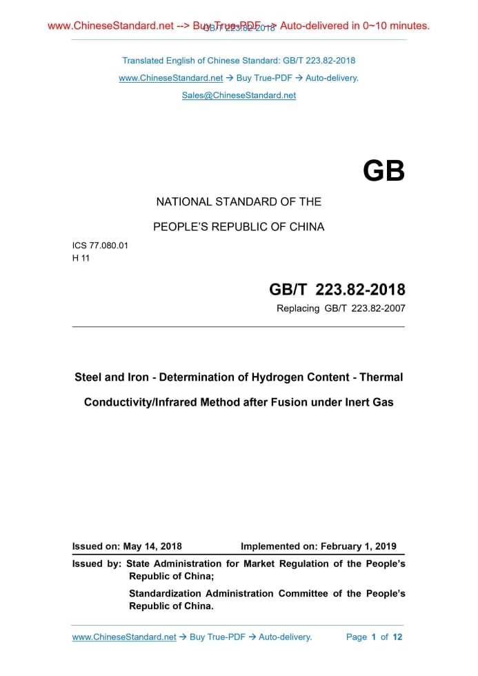 GB/T 223.82-2018: Steel and Iron - Determination of Hydrogen Content - Thermal Conductivity/Infrared Method after Fusion under Inert Gas Delivery: 9 seconds. True-PDF full-copy in English & invoice will be downloaded + auto-delivered via email. See step-by-step procedure Status: Valid GB/T 223.82: Historical versions
