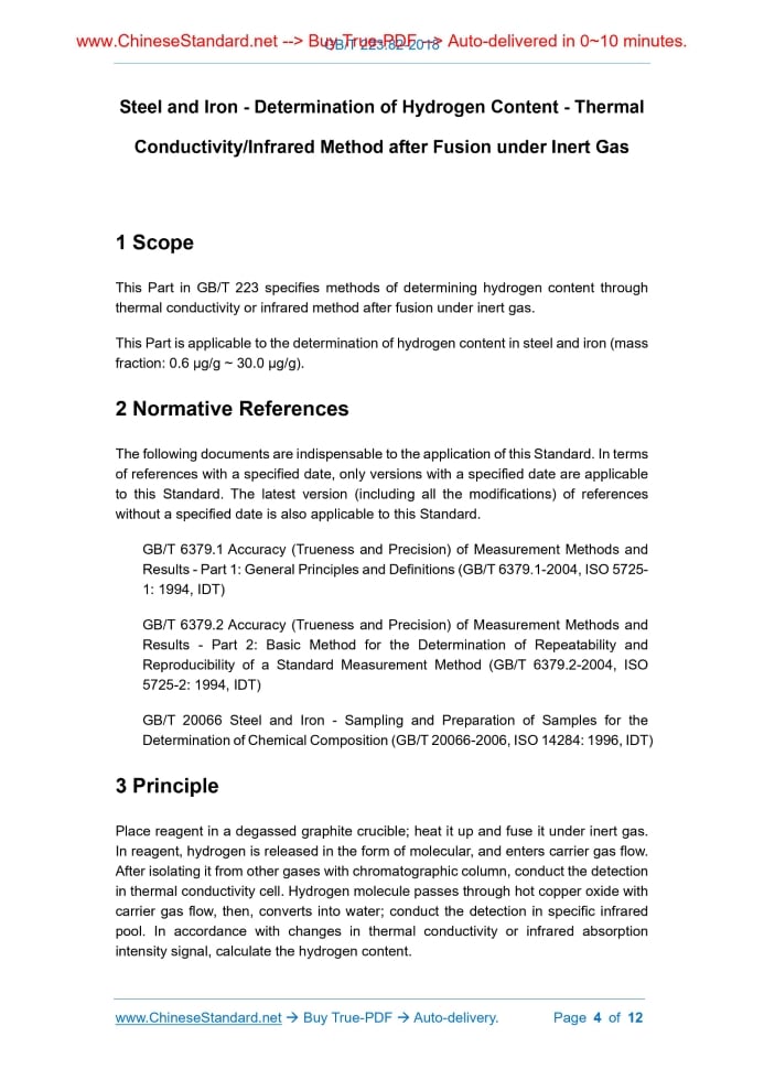 Similar standardsGB/T 223.82-2018: Steel and Iron - Determination of Hydrogen Content - Thermal Conductivity/Infrared Method after Fusion under Inert Gas---This is an excerpt. Full copy of true-PDF in English version (including equations, symbols, images, flow-chart, tables, and figures etc.), auto-downloaded/delivered in 9 seconds, can be purchased online: https://www.ChineseStandard.net/PDF.aspx/GBT223.82-2018 GB NATIONAL STANDARD OF THE PEOPLE’S REPUBLIC OF CHINA ICS 77.080.01 H 11 Replacing GB/T 223.82-2007 Steel and Iron - Determination of Hydrogen Content - Thermal Conductivity/Infrared Method after Fusion under Inert Gas Issued on. MAY 14, 2018 Implemented on. FEBRUARY 1, 2019 Issued by. State Administration for Market Regulation of the People’s Republic of China; Standardization Administration Committee of the People’s Republic of China. Table of ContentsForeword... 3 1 Scope... 4 2 Normative References... 4 3 Principle... 4 4 Reagents and Materials... 5 5 Instruments... 5 6 Sampling and Sample Preparation... 5 7 Analytical Procedures... 7 8 Result Calculation... 9 9 Precision... 10 10 Test Report... 10 Appendix A (informative appendix)... 11ForewordThis is No. 82 part of GB/T 223. This Part is drafted in accordance with stipulations in GB/T 1.1-2009. This Part is drafted as a replacement of GB/T 223.82-2007 Steel and Iron - Determination of Hydrogen Content - Inert Gas Impulse Fusion Heat Conductivity Method. In comparison with GB/T 223.82-2007, there are the following main changes to the content. ---The name of the Standard is modified; ---The range of determination is modified; ---The content of infrared method is added to detection; ---The content of ultrasonic cleaning, powdered sample and crumbed sample is added to sampling and preparation of sample; ---The content of single-point calibration and multi-point calibration is added to calibration; ---“7 Analytical Procedure”, previous “5.2 Instrument Preparation”, “7 Calibration” and “8 Measurement” are added to Chapter 7; ---Formula of repeatability limit and reproducibility limit in “9 Precision” is modified. This Part is proposed by China Iron and Steel Association. This Part is summarized by National Technical Committee 183 on Steel Standardization (SAC/TC 183). This Standard is drafted by. Institute of Metal Research, Chinese Academy of Sciences, Central Iron & Steel Research Institute, BAOSTEEL Co., Ltd., Wuhan Iron and Steel Company Limited, Shanghai MEISHAN Iron & Steel Co., Ltd., ANSTEEL Research Institute of Iron & Steel of Pangang Group Research Institute Co., Ltd., ANSTEEL Group, BAOSTEEL Special Steel Co., Ltd., SHOUGANG JINGTANG United Iron & Steel Co., Ltd., BAOSTEEL Special Steel Shaoguan Co., Ltd., NCS Testing Technology Co., Ltd. The main drafters of this Part include. Zhu Yuejin, Jiang Zhimin, Li Sujuan, Sun Mingyue, Luo Qianhua, Wang Hongjing, Zheng Mingyue, Xu Fanghu. The issuing of the previous versions of the standard replaced by this Part is listed below. ---GB/T 223.82-2007. Steel and Iron - Determination of Hydrogen Content - Thermal Conductivity/Infrared Method after Fusion under Inert Gas1 ScopeThis Part in GB/T 223 specifies methods of determining hydrogen content through thermal conductivity or infrared method after fusion under inert gas. This Part is applicable to the determination of hydrogen content in steel and iron (mass fraction. 0.6 μg/g ~ 30.0 μg/g).2 Normative ReferencesThe following documents are indispensable to the application of this Standard. In terms of references with a specified date, only versions with a specified date are applicable to this Standard. The latest version (including all the modifications) of references without a specified date is also applicable to this Standard. GB/T 6379.1 Accuracy (Trueness and Precision) of Measurement Methods and Results - Part 1.General Principles and Definitions (GB/T 6379.1-2004, ISO 5725- 1.1994, IDT) GB/T 6379.2 Accuracy (Trueness and Precision) of Measurement Methods and Results - Part 2.Basic Method for the Determination of Repeatability and Reproducibility of a Standard Measurement Method (GB/T 6379.2-2004, ISO 5725-2.1994, IDT) GB/T 20066 Steel and Iron - Sampling and Preparation of Samples for the Determination of Chemical Composition (GB/T 20066-2006, ISO 14284.1996, IDT)3 PrinciplePlace reagent in a degassed graphite crucible; heat it up and fuse it under inert gas. In reagent, hydrogen is released in the form of molecular, and enters carrier gas flow. After isolating it from other gases with chromatographic column, conduct the detection in thermal conductivity cell.4 Reagents and Materials4.1 High-purity carrier gas (purity. ≥ 99.99%). argon, nitrogen or helium, depends on instrument manufacturer’s recommendation. 4.2 Power gas, nitrogen, argon or compressed air; oil and water content < 0.5%; flammable gas is prohibited. 4.3 Carbon tetrachloride, acetone or ether (analytical purity). 4.4 Anhydrous magnesium perchlorate (granular reagent). 4.7 Graphite (electrode) crucible, disposable, made of high-purity graphite. 4.8 Hydrogen standard substance/standard sample in steel (iron).5 InstrumentsInert gas fusion - thermal conductivity or infrared hydrogen detection analyzer, including pulsed graphite electrode furnace, analytical airflow impurity removal system, auxiliary purification system and thermal conductivity cell or infrared pool hydrogen determination system.6 Sampling and Sample Preparation6.1 General Requirements Sampling and preparation of sample shall comply with stipulations in GB/T 20066. 6.2 Pre-furnace Sampling and Sample Preparation Pre-furnace sampling shall adopt exclusive sampling devices. Before adopting a new pre-furnace sampling method or a new sampling device, its reliability and availability shall be evaluated; an evaluation report shall be issued for the record. 6.3 Sampling and Sample Preparation on Steel Ingot or Profile In terms of forged or casted workpiece, the mode of saw