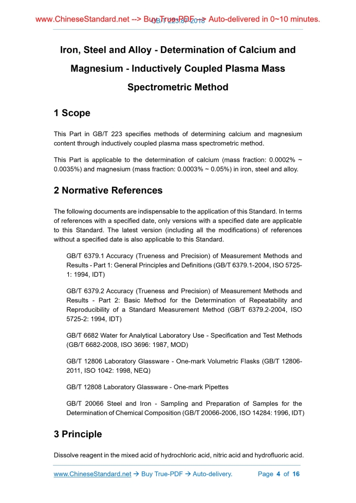 Similar standardsGB/T 223.87-2018: Iron, Steel and Alloy - Determination of Calcium and Magnesium - Inductively Coupled Plasma Mass Spectrometric Method---This is an excerpt. Full copy of true-PDF in English version (including equations, symbols, images, flow-chart, tables, and figures etc.), auto-downloaded/delivered in 9 seconds, can be purchased online: https://www.ChineseStandard.net/PDF.aspx/GBT223.87-2018 GB NATIONAL STANDARD OF THE PEOPLE’S REPUBLIC OF CHINA ICS 77.080.01 H 11 Iron, Steel and Alloy - Determination of Calcium and Magnesium - Inductively Coupled Plasma Mass Spectrometric Method Issued on: MAY 14, 2018 Implemented on: FEBRUARY 1, 2019 Issued by. State Administration for Market Regulation of the People’s Republic of China; Standardization Administration Committee of the People’s Republic of China. Table of ContentsForeword ... 3 1 Scope ... 4 2 Normative References ... 4 3 Principle ... 4 4 Reagents ... 5 5 Instruments and Equipment ... 7 6 Sampling and Sample Preparation ... 8 7 Experimental Procedures ... 8 8 Result Calculation ... 11 9 Precision ... 11 10 Test Report ... 12 Appendix A (informative appendix)... 13 Appendix B (informative appendix) ... 14 Iron, Steel and Alloy - Determination of Calcium and Magnesium - Inductively Coupled Plasma Mass Spectrometric Method1 ScopeThis Part in GB/T 223 specifies methods of determining calcium and magnesium content through inductively coupled plasma mass spectrometric method. This Part is applicable to the determination of calcium (mass fraction. 0.0002% ~ 0.0035%) and magnesium (mass fraction. 0.0003% ~ 0.05%) in iron, steel and alloy.2 Normative ReferencesThe following documents are indispensable to the application of this Standard. In terms of references with a specified date, only versions with a specified date are applicable to this Standard. The latest version (including all the modifications) of references without a specified date is also applicable to this Standard. GB/T 6379.1 Accuracy (Trueness and Precision) of Measurement Methods and Results - Part 1. General Principles and Definitions (GB/T 6379.1-2004, ISO 5725- 1.1994, IDT) GB/T 6379.2 Accuracy (Trueness and Precision) of Measurement Methods and Results - Part 2. Basic Method for the Determination of Repeatability and Reproducibility of a Standard Measurement Method (GB/T 6379.2-2004, ISO 5725-2.1994, IDT) GB/T 6682 Water for Analytical Laboratory Use - Specification and Test Methods (GB/T 6682-2008, ISO 3696. 1987, MOD) GB/T 12806 Laboratory Glassware - One-mark Volumetric Flasks (GB/T 12806- 2011, ISO 1042.1998, NEQ) GB/T 12808 Laboratory Glassware - One-mark Pipettes GB/T 20066 Steel and Iron - Sampling and Preparation of Samples for the Determination of Chemical Composition (GB/T 20066-2006, ISO 14284.1996, IDT)3 PrincipleDissolve reagent in the mixed acid of hydrochloric acid, nitric acid and hydrofluoric acid. If necessary, adopt perchloric acid to generate fumes. After dilution, import the sample solution into inductively coupled plasma mass spectrometer with a peristaltic pump. During the operation of the inductively coupled plasma mass spectrometer, measure the mass spectrometry signal intensity of the element. Conduct matrix matching of calibration blank, calibration solution, and main elements in the sample to be tested, and acid adopted for reagent decomposition. Adopt internal standard to compensate the instrument’s drifting effect and matrix effect.4 ReagentsUnless it is otherwise indicated, high-purity reagent (mass fraction of calcium and magnesium < 0.0001%) or reagent with equivalent purity, and first-grade water stipulated in GB/T 6682 shall be adopted in analysis. If the requirements cannot be satisfied, use an acid purification unit (5.3) to purify the reagents. 4.1 Hydrochloric acid, = 1.19 g/mL. 4.2 Nitric acid, = 1.42 g/mL. 4.3 Hydrofluoric acid, = 1.19 g/mL. 4.4 Perchloric acid, = 1.67 g/mL. 4.5 Calcium standard stock solution, 1,000 μg/mL. Weigh-take 2.4972 g of calcium carbonate (mass fraction ≥ 99.99%) that is already dried at 110 °C for 1 h and cooled down to room temperature in a dryer. Place it in 400 mL beaker; add 100 mL of hydrochloric acid (1+1) to dissolve it. After cooling it down, transfer it into 1,000 mL volumetric flask. Use water to dilute to the constant volume; thoroughly mix it. 1 mL of this solution contains 1,000 μg of calcium. 4.6 Magnesium standard stock solution, 1,000 μg/mL. Weigh-take 1.6582 g of magnesium oxide (mass fraction ≥ 99.99%) that is already burnt at 850 °C for 30 min and cooled down to room temperature in a dryer. Place it in 400 mL beaker; add 100 mL of hydrochloric acid (1+1). After heating it up and dissolving it, cool it down to room temperature; transfer it into 1,000 mL volumetric flask. Use water to dilute to the constant volume; thoroughly mix it. 1 mL of this solution contains 1,000 μg of magnesium. 4.7 Mixed standard solution of calcium and magnesium 4.7.1 Mixed standard solution of calcium and magnesium, 100 μg/mL. 7.2 Blank Test Conduct blank test in accordance with the sample. 7.3 Determination 7.3.1 Preparation of sample solution In terms of carbon steel and low-alloy steel sample. place the sample (7.1) in 100 mL quartz beaker. Add 10 mL of water and 5 mL of nitric acid (4.2) [add 0.5 mL of hydrofluoric acid (4.3) to high-silicon sample], heat it up till it boils. After eliminating nitrogen oxide, take it down; cool it down, then, transfer it into 100 mL plastic volumetric flask; add 1.0 mL of internal standard solution of scandium (4.8.3). Use water to dilute to the constant volume, then, thoroughly mix it for later determination. In terms of high-carbon steel and alloy steel sample. place the sample (7.1) in 100 mL quartz beaker. Add 3 mL of hydrochloric acid (4.1) and 1 mL of HNO3 (4.2); use heating plate to heat it up till it boils. Add 2 mL of perchloric acid (4.4), heat it up till it begins to fume and stable perchloric acid fume reflux is formed around t