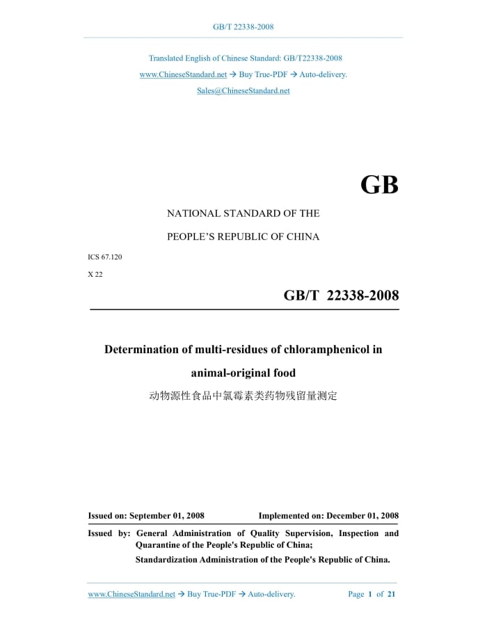 GB/T 22338-2008: Determination of multi-residues of chloramphenicol in animal-original food Delivery: 9 seconds. True-PDF full-copy in English & invoice will be downloaded + auto-delivered via email. See step-by-step procedure Status: Valid