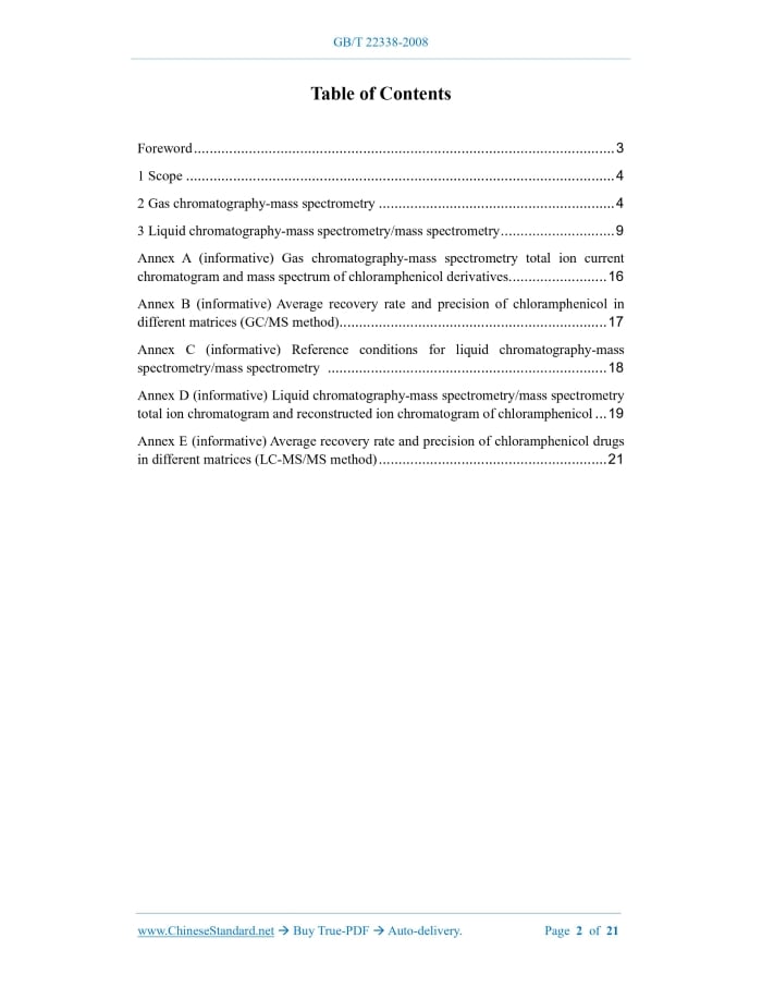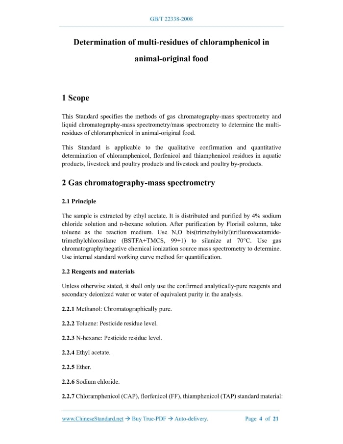 Similar standardsGB/T 22338-2008: Determination of multi-residues of chloramphenicol in animal-original food---This is an excerpt. Full copy of true-PDF in English version (including equations, symbols, images, flow-chart, tables, and figures etc.), auto-downloaded/delivered in 9 seconds, can be purchased online: https://www.ChineseStandard.net/PDF.aspx/GBT22338-2008GB NATIONAL STANDARD OF THE PEOPLE’S REPUBLIC OF CHINA ICS 67.120 X 22 Determination of multi-residues of chloramphenicol in animal-original food Issued on. SEPTEMBER 01, 2008 Implemented on. DECEMBER 01, 2008 Issued by. General Administration of Quality Supervision, Inspection and Quarantine of the People's Republic of China; Standardization Administration of the People's Republic of China. Table of ContentsForeword... 3 1 Scope... 4 2 Gas chromatography-mass spectrometry... 4 3 Liquid chromatography-mass spectrometry/mass spectrometry... 9 Annex A (informative) Gas chromatography-mass spectrometry total ion current chromatogram and mass spectrum of chloramphenicol derivatives... 16 Annex B (informative) Average recovery rate and precision of chloramphenicol in different matrices (GC/MS method)... 17 Annex C (informative) Reference conditions for liquid chromatography-mass spectrometry/mass spectrometry... 18 Annex D (informative) Liquid chromatography-mass spectrometry/mass spectrometry total ion chromatogram and reconstructed ion chromatogram of chloramphenicol... 19 Annex E (informative) Average recovery rate and precision of chloramphenicol drugs in different matrices (LC-MS/MS method)... 21ForewordAnnex A, Annex B, Annex C, Annex D and Annex E of this Standard are all informative. This document was proposed by General Administration of Quality Supervision, Inspection and Quarantine of the People's Republic of China. This document shall be under the jurisdiction of the National Certification and Accreditation Administration Commission. The drafting organizations of this document. China Academy of Inspection and Quarantine, Shandong Entry-Exit Inspection and Quarantine Bureau of the People's Republic of China. Main drafters of this document. Qiu Yueming, Lin Liming, Li Peng, Zhang Hongwei, Zhao Haixiang, Dong Yiyang, Cai Huixia, Xie Mengxia, Wang Liping, Kong Ying. Determination of multi-residues of chloramphenicol in animal-original food1 ScopeThis Standard specifies the methods of gas chromatography-mass spectrometry and liquid chromatography-mass spectrometry/mass spectrometry to determine the multi- residues of chloramphenicol in animal-original food. This Standard is applicable to the qualitative confirmation and quantitative determination of chloramphenicol, florfenicol and thiamphenicol residues in aquatic products, livestock and poultry products and livestock and poultry by-products.2 Gas chromatography-mass spectrometry2.1 Principle The sample is extracted by ethyl acetate. It is distributed and purified by 4% sodium chloride solution and n-hexane solution. After purification by Florisil column, take toluene as the reaction medium. Use N,O bis(trimethylsilyl)trifluoroacetamide- trimethylchlorosilane (BSTFA+TMCS, 99+1) to silanize at 70°C. Use gas chromatography/negative chemical ionization source mass spectrometry to determine. Use internal standard working curve method for quantification. 2.2 Reagents and materials Unless otherwise stated, it shall only use the confirmed analytically-pure reagents and secondary deionized water or water of equivalent purity in the analysis. 2.2.1 Methanol. Chromatographically pure. 2.2.2 Toluene. Pesticide residue level. 2.2.3 N-hexane. Pesticide residue level. 2.2.4 Ethyl acetate. 2.2.5 Ether. 2.2.6 Sodium chloride. 2.2.13 Derivatization reagent. N, O bis (trimethylsilyl) trifluoroacetamide- trimethylchlorosilane (BSTFA+TMCS, 99+1). 2.2.14 Solid phase extraction column. Florisil column (6.0mL, 1.0g). 2.3 Instruments and equipment 2.3.1 Gas chromatography/mass spectrometer. equipped with chemical ionization source (CI). 2.3.2 Tissue masher. 2.3.3 Solid phase extraction device. 2.3.4 Oscillator. 2.3.5 Rotary evaporator. 2.3.6 Vortex mixer. 2.3.7 Centrifuge. 2.3.8 Incubator. 2.4 Determination steps 2.4.1 Extraction Weigh 10g (accurate to 0.01g) of the crushed tissue sample into a 50mL stoppered centrifuge tube. Add 1.0mL of internal standard solution (2.2.11) and 30mL of ethyl acetate. Shake for 30min. Centrifuge at 4000r/min for 2min. Transfer the supernatant to a round bottom flask. Use 30mL of ethyl acetate to extract the residue one more time. Combine the extracts. Conduct rotary evaporation at 35 ℃ to 1mL ~ 2mL, for purification. 2.4.2 Purification 2.4.4 Determination 2.4.4.1 Gas chromatography-mass spectrometry conditions 2.4.4.4 Quantitation Use m/z466 (m-CAP and CAP), 339 (FF) and 409 (TAP) as quantitative ions. The response values of chloramphenicol derivatives in the sample solution shall be within the linear range determined by the instrument. Under the above chromatographic conditions (2.4.4.1), the reference retention time of m-CAP, CAP, FF, TAP standard substance derivatives is about 11.4min, 11.8min, 12.6min, 13.6min. For the total ion chromatogram and mass spectrum of chloramphenicol derivatives, see Figure A.1, Figure A.2 in Annex A. 2.4.5 Parallel experiment According to the above steps, carry out parallel test determination on the same specimen. 2.4.6 Blank experiment Carry out according to the above-mentioned determination steps except that no specimen is added. 2.5 Result calculation The result is calculated according to formula (1).3 Liquid chromatography-mass spectrometry/mass spectrometry3.1 Principle For residues of chloramphenicol, thiamphenicol and florfenicol in different animal- original food, use acetonitrile, ethyl acetate-ether or ethyl acetate to respectively extract. The extract is purified with a solid phase extraction cartridge. 3.2 Reagents and materials Unless otherwise stated, it shall only use the confirmed analytically-pure reagents and