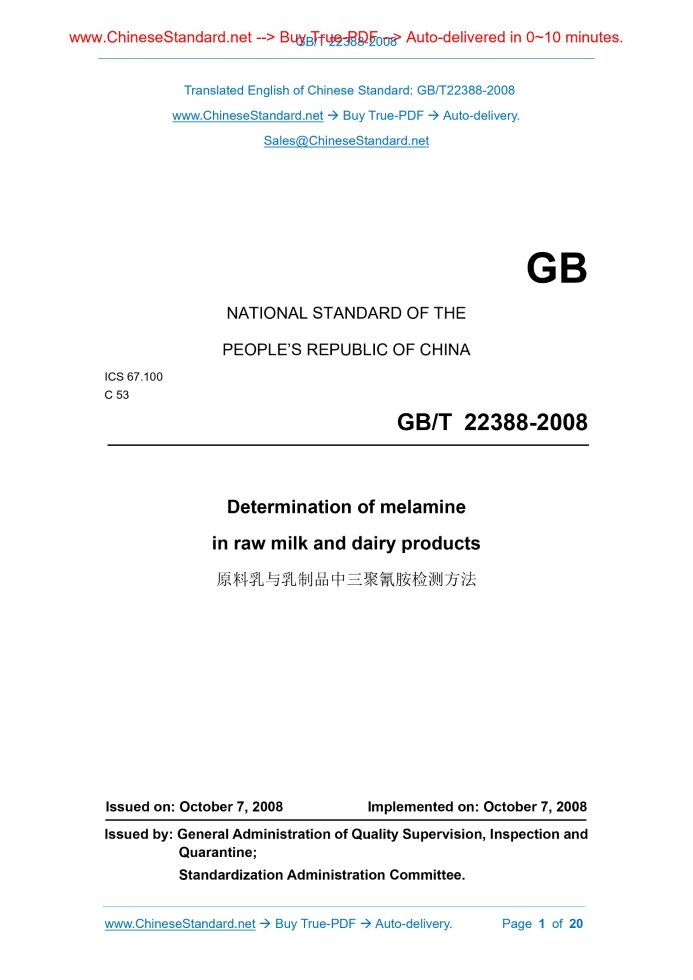 GB/T 22388-2008: Determination of melamine in raw milk and dairy products Delivery: 9 seconds. True-PDF full-copy in English & invoice will be downloaded + auto-delivered via email. See step-by-step procedure Status: Valid