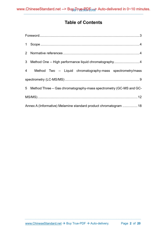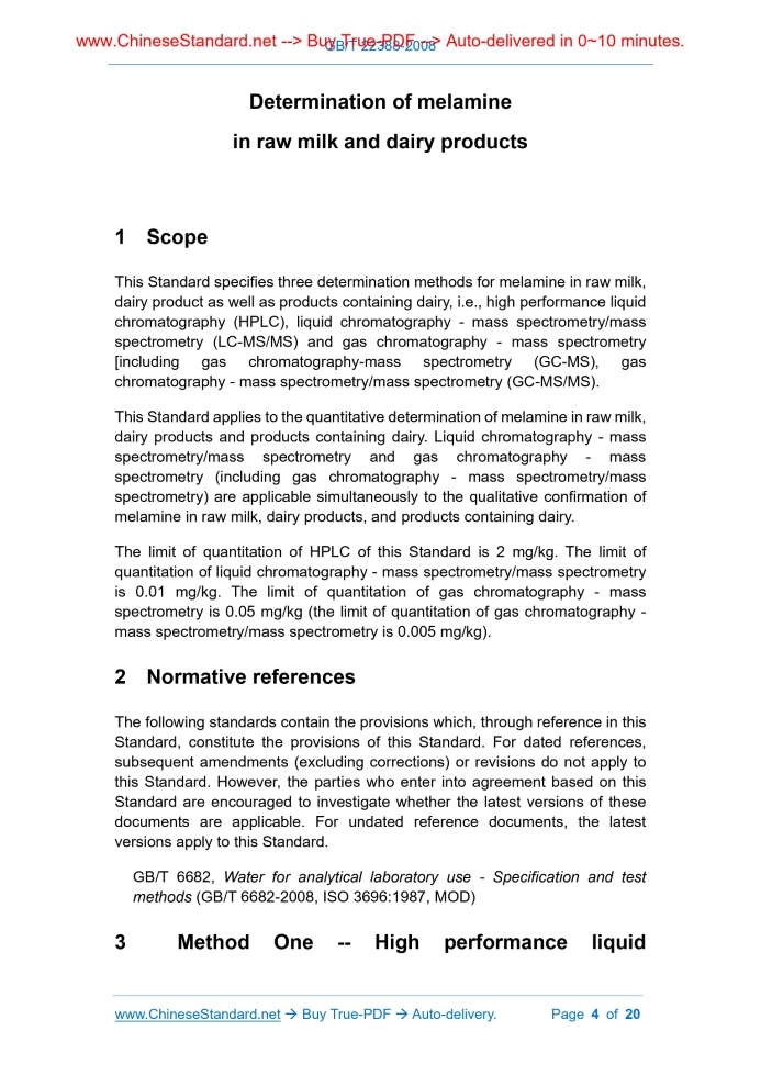 Similar standardsGB/T 22388-2008: Determination of melamine in raw milk and dairy products---This is an excerpt. Full copy of true-PDF in English version (including equations, symbols, images, flow-chart, tables, and figures etc.), auto-downloaded/delivered in 9 seconds, can be purchased online: https://www.ChineseStandard.net/PDF.aspx/GBT22388-2008GB NATIONAL STANDARD OF THE PEOPLE’S REPUBLIC OF CHINA ICS 67.100 C 53 Determination of melamine in raw milk and dairy products Issued on. OCTOBER 7, 2008 Implemented on. OCTOBER 7, 2008 Issued by. General Administration of Quality Supervision, Inspection and Quarantine; Standardization Administration Committee. Table of ContentsForeword... 3 1 Scope... 4 2 Normative references... 4 3 Method One -- High performance liquid chromatography... 4 4 Method Two -- Liquid chromatography-mass spectrometry/mass spectrometry (LC-MS/MS)... 9 5 Method Three -- Gas chromatography-mass spectrometry (GC-MS and GC- MS/MS)... 12 Annex A (Informative) Melamine standard product chromatogram... 181 ScopeThis Standard specifies three determination methods for melamine in raw milk, dairy product as well as products containing dairy, i.e., high performance liquid chromatography (HPLC), liquid chromatography - mass spectrometry/mass spectrometry (LC-MS/MS) and gas chromatography - mass spectrometry [including gas chromatography-mass spectrometry (GC-MS), gas chromatography - mass spectrometry/mass spectrometry (GC-MS/MS). This Standard applies to the quantitative determination of melamine in raw milk, dairy products and products containing dairy. Liquid chromatography - mass spectrometry/mass spectrometry and gas chromatography - mass spectrometry (including gas chromatography - mass spectrometry/mass spectrometry) are applicable simultaneously to the qualitative confirmation of melamine in raw milk, dairy products, and products containing dairy. The limit of quantitation of HPLC of this Standard is 2 mg/kg. The limit of quantitation of liquid chromatography - mass spectrometry/mass spectrometry is 0.01 mg/kg. The limit of quantitation of gas chromatography - mass spectrometry is 0.05 mg/kg (the limit of quantitation of gas chromatography - mass spectrometry/mass spectrometry is 0.005 mg/kg).2 Normative referencesThe following standards contain the provisions which, through reference in this Standard, constitute the provisions of this Standard. For dated references, subsequent amendments (excluding corrections) or revisions do not apply to this Standard. However, the parties who enter into agreement based on this Standard are encouraged to investigate whether the latest versions of these documents are applicable. For undated reference documents, the latest versions apply to this Standard. GB/T 6682, Water for analytical laboratory use - Specification and test methods (GB/T 6682-2008, ISO 3696.1987, MOD)3 Method One -- High performance liquid chromatography3.1 Principle Extract sample with trichloroacetic acid solution-acetonitrile. After purification by cation exchange solid phase extraction column, determine by high performance liquid chromatography; quantify by external standard method. 3.2 Reagents and materials Unless otherwise specified, all reagents are analytically pure, and water is grade one according to GB/T 6682. 3.3 Instruments and equipment 3.3.1 High performance liquid chromatography (HPLC) instrument. equipped with UV Detector or diode array detector. 3.3.2 Analytical balance. resolution is 0.0001 g and 0.01 g. 3.5 High performance liquid chromatography determination 3.5.1 HPLC reference conditions 3.5.2 Drawing of standard curve Use mobile phase to dilute the melamine standard stock solution grade by grade to obtain the standard working solutions with concentrations of 0.8, 2, 20, 40, 80 μg/mL. Test the concentration from low to high. With peak area- concentration, obtain the standard curve regression equation. See Figure A.1 in Annex A for HPLC chromatogram of matrix matching melamine sample. 3.7 Method limit of quantification The limit of quantification of this Method is 2 mg/kg. 3.8 Rate of recovery In the concentration range of 2mg/kg ~ 10mg/kg, the recovery rate is between 80% ~ 110%, and the relative standard deviation is less than 10%. 3.9 Allowable difference The absolute difference between two independent determinations obtained under repeatability conditions must not exceed 10% of the arithmetic mean.4 Method Two -- Liquid chromatography-mass spectrometry/mass spectrometry (LC-MS/MS)4.1 Principle Extract sample with trichloroacetic acid solution. After purification by cation exchange solid phase extraction column, determine by liquid chromatography- mass spectrometry/mass spectrometry; quantify by external standard method. 4.2 Reagents and materials Unless otherwise specified, all reagents are analytically pure, and water is grade one according to GB/T 6682. 4.3 Instruments and equipment 4.3.1 Liquid chromatography-mass spectrometry/mass spectrometry (LC- MS/MS) instrument. equipped with electron spray ionization (ESI). 4.3.2 Others same with 3.3. 4.4 Sample processing 4.4.1 Extraction 4.4.2 Purification Transfer the liquid to be purified in 4.4.1 to the solid phase extraction column (3.2.13). Wash sequentially with 3 mL of water and 3 mL of methanol. After pumping to near dryness, elute with 6 mL of ammoniated methanol solution (3.2.9). 4.5 Liquid chromatography-mass spectrometry/mass spectrometry determination 4.5.1 LC reference conditions 4.5.3 Drawing of standard curve Take blank sample and process it according to 4.4.Use the sample solution obtained to dilute the melamine standard stock solution (3.2.12) grade by grade to obtain the standard working solutions with concentrations of 0.01, 0.05, 0.1, 0.2, 0.5 μg/mL. 4.5.4 Quantitative determination The melamine response in the sample to be tested shall be within the linear range of the standard curve. When it exceeds the linear range, the injection analysis shall be performed after dil