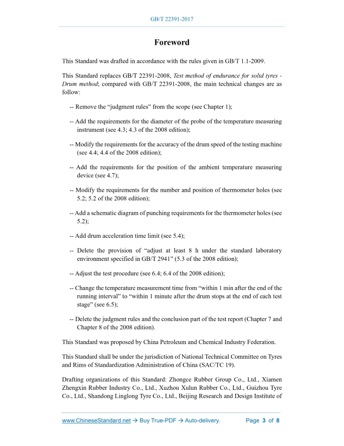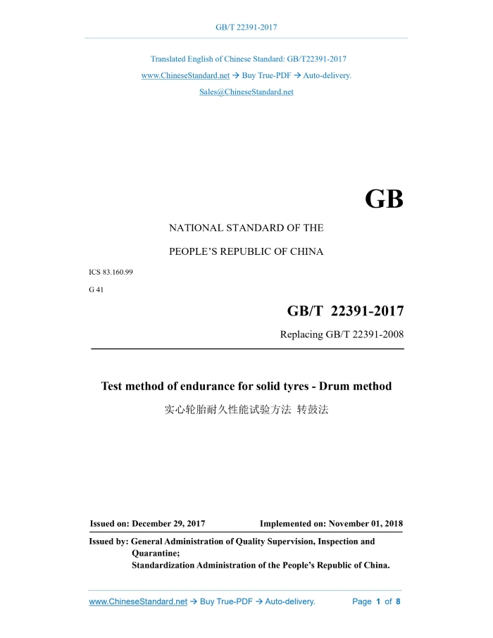 Similar standardsGB/T 22391-2017: Test method of endurance for solid tyres -- Drum method---This is an excerpt. Full copy of true-PDF in English version (including equations, symbols, images, flow-chart, tables, and figures etc.), auto-downloaded/delivered in 9 seconds, can be purchased online: https://www.ChineseStandard.net/PDF.aspx/GBT22391-2017GB NATIONAL STANDARD OF THE PEOPLE’S REPUBLIC OF CHINA ICS 83.160.99 G 41 Replacing GB/T 22391-2008 Test method of endurance for solid tyres - Drum method ISSUED ON: DECEMBER 29, 2017 IMPLEMENTED ON: NOVEMBER 01, 2018 Issued by: General Administration of Quality Supervision, Inspection and Quarantine; Standardization Administration of the People’s Republic of China. Table of ContentsForeword ... 3 1 Scope ... 5 2 Normative references ... 5 3 Terms and definitions ... 5 4 Test equipment and accuracy ... 5 5 Test conditions ... 6 6 Test steps ... 7 7 Test report ... 8ForewordThis Standard was drafted in accordance with the rules given in GB/T 1.1-2009. This Standard replaces GB/T 22391-2008, Test method of endurance for solid tyres - Drum method; compared with GB/T 22391-2008, the main technical changes are as follow: -- Remove the “judgment rules” from the scope (see Chapter 1); -- Add the requirements for the diameter of the probe of the temperature measuring instrument (see 4.3; 4.3 of the 2008 edition); -- Modify the requirements for the accuracy of the drum speed of the testing machine (see 4.4; 4.4 of the 2008 edition); -- Add the requirements for the position of the ambient temperature measuring device (see 4.7); -- Modify the requirements for the number and position of thermometer holes (see 5.2; 5.2 of the 2008 edition); -- Add a schematic diagram of punching requirements for the thermometer holes (see 5.2); -- Add drum acceleration time limit (see 5.4); -- Delete the provision of “adjust at least 8 h under the standard laboratory environment specified in GB/T 2941” (5.3 of the 2008 edition); -- Adjust the test procedure (see 6.4; 6.4 of the 2008 edition); -- Change the temperature measurement time from “within 1 min after the end of the running interval” to “within 1 minute after the drum stops at the end of each test stage” (see 6.5); -- Delete the judgment rules and the conclusion part of the test report (Chapter 7 and Chapter 8 of the 2008 edition). This Standard was proposed by China Petroleum and Chemical Industry Federation. This Standard shall be under the jurisdiction of National Technical Committee on Tyres and Rims of Standardization Administration of China (SAC/TC 19). Drafting organizations of this Standard: Zhongce Rubber Group Co., Ltd., Xiamen Zhengxin Rubber Industry Co., Ltd., Xuzhou Xulun Rubber Co., Ltd., Guizhou Tyre Co., Ltd., Shandong Linglong Tyre Co., Ltd., Beijing Research and Design Institute of Test method of endurance for solid tyres - Drum method1 ScopeThis Standard specifies the terms and definitions, test equipment and accuracy, test conditions, test procedures and test reports for the test of endurance for solid tyres. This Standard applies to new solid tyres.2 Normative referencesThe following referenced documents are indispensable for the application of this document. For dated references, only the edition cited applies to this document. For undated references, the latest edition (including any amendment) applies to this document. GB/T 6326, Tyre terms and definitions GB/T 10823, Size designation dimensions and load capacity of solid tyres for pneumatic tyres rims GB/T 16622, Size designation, dimensions and load capacity for pressed-on solid tyres3 Terms and definitionsTerms and definitions determined by GB/T 6326 are applicable to this document.4 Test equipment and accuracy4.1 The outer diameter of the test drum is 1 700 mm ± 17 mm. 4.2 The test surface of the test drum shall be a smooth steel surface, and the surface width shall be greater than or equal to the total section width of the test tyre. 4.3 The temperature measuring instrument shall be a needle thermometer with digital display, the accuracy of the thermometer shall be ±0.1 °C, and the diameter of the probe shall be 1 mm ~ 3 mm smaller than the thermometer hole. 4.4 The speed of the drum of the testing machine shall meet the test requirements, and its speed accuracy shall be ±0.2 km/h. ......Source: Above contents are excerpted from the full-copy PDF -- translated/reviewed by: www.ChineseStandard.net / Wayne Zheng et al. Tips & Frequently Asked Questions:Question 1: How long will the true-PDF of English version of GB/T 22391-2017 be delivered?Answer: The full copy PDF of English version of GB/T 22391-2017 can be downloaded in 9 seconds, and it will also be emailed to you in 9 seconds (double mechanisms to ensure the delivery reliably), with PDF-invoice.Question 2: Can I share the purchased PDF of GB/T 22391-2017_English with my colleagues?Answer: Yes. The purchased PDF of GB/T 22391-2017_English will be deemed to be sold to your employer/organization who actually paid for it, including your colleagues and your employer's intranet.Question 3: Does the price include tax/VAT?Answer: Yes. Our tax invoice, downloaded/delivered in 9 seconds, includes all tax/VAT and complies with 100+ countries' tax regulations (tax exempted in 100+ countries) -- See Avoidance of Double Taxation Agreements (DTAs): List of DTAs signed between Singapore and 100+ countriesQuestion 4: Do you accept my currency other than USD?Answer: Yes. www.ChineseStandard.us -- GB/T 22391-2017 -- Click this link and select your country/currency to pay, the exact amount in your currency will be printed on the invoice. Full PDF will also be downloaded/emailed in 9 seconds.Question 5: Should I purchase the latest version GB/T 22391-2017?Answer: Yes. Unless special scenarios such as technical constraints or academic study, you should always prioritize to purchase the latest version GB/T 22391-2017 even if the enforcement date is in future. Complying with the lat