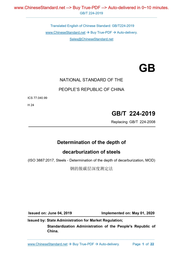 GB/T 224-2019: Determination of the depth of decarburization of steels Delivery: 9 seconds. True-PDF full-copy in English & invoice will be downloaded + auto-delivered via email. See step-by-step procedure Status: Valid GB/T 224: Historical versions