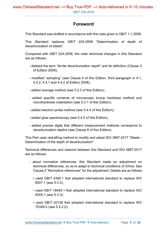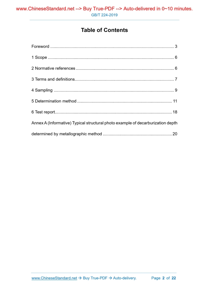 Similar standardsGB/T 224-2019: Determination of the depth of decarburization of steels---This is an excerpt. Full copy of true-PDF in English version (including equations, symbols, images, flow-chart, tables, and figures etc.), auto-downloaded/delivered in 9 seconds, can be purchased online: https://www.ChineseStandard.net/PDF.aspx/GBT224-2019NATIONAL STANDARD OF THE PEOPLE’S REPUBLIC OF CHINA ICS 77.040.99 H 24 Replacing GB/T 224-2008 Determination of the depth of decarburization of steels (ISO 3887:2017, Steels - Determination of the depth of decarburization, MOD) ISSUED ON: JUNE 04, 2019 IMPLEMENTED ON: MAY 01, 2020 Issued by: State Administration for Market Regulation; Standardization Administration of the People's Republic of China. Table of ContentsForeword ... 3 1 Scope ... 6 2 Normative references ... 6 3 Terms and definitions ... 7 4 Sampling ... 9 5 Determination method ... 11 6 Test report ... 18 Annex A (Informative) Typical structural photo example of decarburization depth determined by metallographic method ... 20ForewordThis Standard was drafted in accordance with the rules given in GB/T 1.1-2009. This Standard replaces GB/T 224-2008 “Determination of depth of decarburization of steels”. Compared with GB/T 224-2008, the main technical changes in this Standard are as follows: - deleted the term “ferrite decarburization depth” and its definition (Clause 3 of Edition 2008); - modified “sampling” (see Clause 4 of this Edition, third paragraph in 4.1, 4.2.2, 4.4.1 and 4.4.2 of Edition 2008); - added average method (see 5.2.3 of this Edition); - added specific contents of microscopic knoop hardness method and microhardness indentation (see 5.3.1 of this Edition); - added electron probe method (see 5.4.4 of this Edition); - added glow spectroscopy (see 5.4.5 of this Edition); - added precise digits that different measurement methods correspond to decarburization depths (see Clause 6 of this Edition). This Part uses redrafting method to modify and adopt ISO 3887:2017 “Steels - Determination of the depth of decarburization”. Technical differences and reasons between this Standard and ISO 3887:2017 are as follows: - about normative references, this Standard made an adjustment on technical differences, so as to adapt to technical conditions of China. See Clause 2 “Normative references” for the adjustment. Details are as follows: • used GB/T 4340.1 that adopted international standard to replace ISO 6507-1 (see 5.3.3); • used GB/T 18449.1 that adopted international standard to replace ISO 4545-1 (see 5.3.3); • used GB/T 20126 that adopted international standard to replace ISO 15349-2 (see 5.4.2.2); Determination of the depth of decarburization of steels1 ScopeThis Standard specifies requirements for sampling, determination method and test report of steel decarburization. This Standard is applicable to measuring depths of decarburization of steel (blank) and its parts.2 Normative referencesThe following referenced documents are indispensable for the application of this document. For dated references, only the edition cited applies. For undated references, the latest edition of the referenced document (including any amendments) applies. GB/T 4336, Carbon and low-alloy steel - Determination of multi-element contents - Spark discharge atomic emission spectrometric method (routine method) GB/T 4340.1, Metallic materials - Vickers hardness test - Part 1: Test method (GB/T 4340.1-2009, ISO 6507-1:2005, MOD) GB/T 13298, Inspection methods of microstructure for metals GB/T 15247, Microbeam analysis - Electron probe microanalysis - Guidelines for determining the carbon content of steels using calibration curve method (GB/T 15247-2008, ISO 16592:2006, IDT) GB/T 18449.1, Metallic materials - Knoop hardness test - Part 1: Test method (GB/T 18449.1-2009, ISO 4545-1:2005, MOD) GB/T 19502, Surface chemical analysis - Glow discharge optical emission spectrometry (GD-OSE) - Introduction to use (GB/T 19502-2004, ISO 14707:2000, IDT) GB/T 20126, Unalloyed steel - Determination of low carbon content - Part 2: Infrared absorption method after combustion in an induction furnace (with preheating) (GB/T 20126-2006, ISO 15349-2:1999, IDT) GB/T 22368, Low-alloy steel - Determination of multi-element contents - Glow discharge optical emission spectrometry (Routine method) GB/T 30067, Standard terminology relating to metallography ISO 9556, Steel and iron - Determination of total carbon content - Infrared absorption method after combustion in an induction furnace ISO 14594, Microbeam analysis - Electron probe microanalysis - Guidelines for the determination of experimental parameters for wavelength dispersive spectroscopy3 Terms and definitionsFor the purposes of this document, the terms and definitions defined in GB/T 30067 as well as the followings apply. 3.1 decarburization Loss of carbon on steel surface. Such loss of carbon includes: a) partial decarburization: carbon content on surface of steel sample is reduced below carbon content of substrate, and is greater than solid solution limit of carbon in ferrite at room temperature; b) complete decarburization: is also called as ferrite decarburization; surface carbon content of sample is lower than maximum solid solubility of carbon in ferrite; only ferrite exists. NOTE: Complete decarburization described in b) has only ferrite structure. It shall use metallographic method to determine. 3.2 depth of functional decarburization Distance from sample surface to point of specified carbon content or point of hardness level. Specified carbon content or hardness level shall be based on that use performance is not affected by decarburization (for example, minimum carbon content specified in product standard). 3.3 depth of total decarburization Distance from sample surface to the point of which carbon content is equal to substrate carbon content. It is equal to the sum of partial decarburization and complete decarburization. See Figure 1 for d