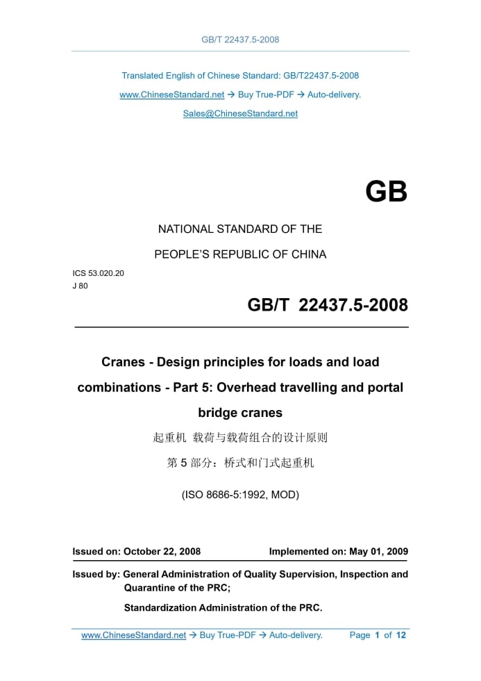 GB/T 22437.5-2008: Cranes -- Design principles for loads and load combinations -- Part 5: Overhead traveling and portal bridge cranes Delivery: 9 seconds. True-PDF full-copy in English & invoice will be downloaded + auto-delivered via email. See step-by-step procedure Status: Obsolete GB/T 22437.5: Historical versions