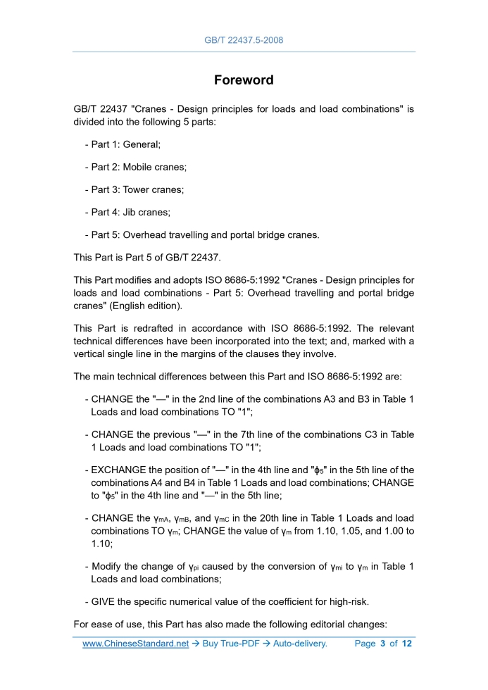 Similar standardsGB/T 22437.5-2008: Cranes -- Design principles for loads and load combinations -- Part 5: Overhead traveling and portal bridge cranes---This is an excerpt. Full copy of true-PDF in English version (including equations, symbols, images, flow-chart, tables, and figures etc.), auto-downloaded/delivered in 9 seconds, can be purchased online: https://www.ChineseStandard.net/PDF.aspx/GBT22437.5-2008 GB NATIONAL STANDARD OF THE PEOPLE’S REPUBLIC OF CHINA ICS 53.020.20 J 80 Cranes - Design principles for loads and load combinations - Part 5.Overhead travelling and portal bridge cranes (ISO 8686-5.1992, MOD) Issued on: OCTOBER 22, 2008 Implemented on: MAY 01, 2009 Issued by. General Administration of Quality Supervision, Inspection and Quarantine of the PRC; Standardization Administration of the PRC. Table of ContentsForeword... 3 1 Scope... 5 2 Normative references... 5 3 Terms and definitions... 5 4 Symbols... 6 5 Application of ϕi factors... 6 6 Hoisting classes... 9 7 Combination of acceleration effects... 10ForewordGB/T 22437 "Cranes - Design principles for loads and load combinations" is divided into the following 5 parts. - Part 1.General; - Part 2.Mobile cranes; - Part 3.Tower cranes; - Part 4.Jib cranes; - Part 5.Overhead travelling and portal bridge cranes. This Part is Part 5 of GB/T 22437. This Part modifies and adopts ISO 8686-5.1992 "Cranes - Design principles for loads and load combinations - Part 5.Overhead travelling and portal bridge cranes" (English edition). This Part is redrafted in accordance with ISO 8686-5.1992.The relevant technical differences have been incorporated into the text; and, marked with a vertical single line in the margins of the clauses they involve. The main technical differences between this Part and ISO 8686-5.1992 are. - CHANGE the "—" in the 2nd line of the combinations A3 and B3 in Table 1 Loads and load combinations TO "1"; - CHANGE the previous "—" in the 7th line of the combinations C3 in Table 1 Loads and load combinations TO "1"; - EXCHANGE the position of "—" in the 4th line and "ϕ5" in the 5th line of the combinations A4 and B4 in Table 1 Loads and load combinations; CHANGE to "ϕ5" in the 4th line and "—" in the 5th line; - CHANGE the γmA, γmB, and γmC in the 20th line in Table 1 Loads and load combinations TO γm; CHANGE the value of γm from 1.10, 1.05, and 1.00 to 1.10; - Modify the change of γpi caused by the conversion of γmi to γm in Table 1 Loads and load combinations; - GIVE the specific numerical value of the coefficient for high-risk. For ease of use, this Part has also made the following editorial changes. Cranes - Design principles for loads and load combinations - Part 5.Overhead travelling and portal bridge cranes1 ScopeThis Part of GB/T 22437 establishes the application of GB/T 22437.1 to overhead travelling and portal bridge cranes as defined in GB/T 6974.1, and gives specific values for the factors to be used.2 Normative referencesThe following documents contain provisions which, through reference in this Part of GB/T 22437, constitute provisions of this Part. For the dated references, their subsequent amendments (excluding corrections) or revisions do not apply to this Part. However, the parties who enter into agreement based on this Part are encouraged to investigate whether the latest editions of these documents are applicable. For undated reference documents, the latest editions apply to this Part. GB/T 5905-1986 Cranes - Test code and procedures (idt ISO 4310.1981) GB/T 6974.1 Crane - Vocabulary - Part 1.General (GB/T 6974.1-2008, ISO 4306-1.2007, IDT) GB/T 10183 Cranes - Overhead travelling cranes and portal bridge cranes - Tolerances for cranes manufacture and tracks laying (GB/T 10183-2005, ISO 8306.1985, IDT) GB/T 22437.1-2008 Cranes - Design principles for loads and load combinations - Part 1.General (ISO 8686-1.1989, MOD) ISO 4302 Cranes - Wind load assessment3 Terms and definitionsThe terms and definitions established in GB/T 22437.1-2008 apply to this Part of GB/T 22437.4 SymbolsThe symbols used in this Part are in accordance with the provisions in GB/T 22437.1-2008.5 Application of ϕi factors5.1 The ϕi factors for dynamic effects which are used for load combinations are given in Table 1. 5.2 The numerical values for different ϕi factors are given in Table 2. ......Source: Above contents are excerpted from the full-copy PDF -- translated/reviewed by: www.ChineseStandard.net / Wayne Zheng et al. |
