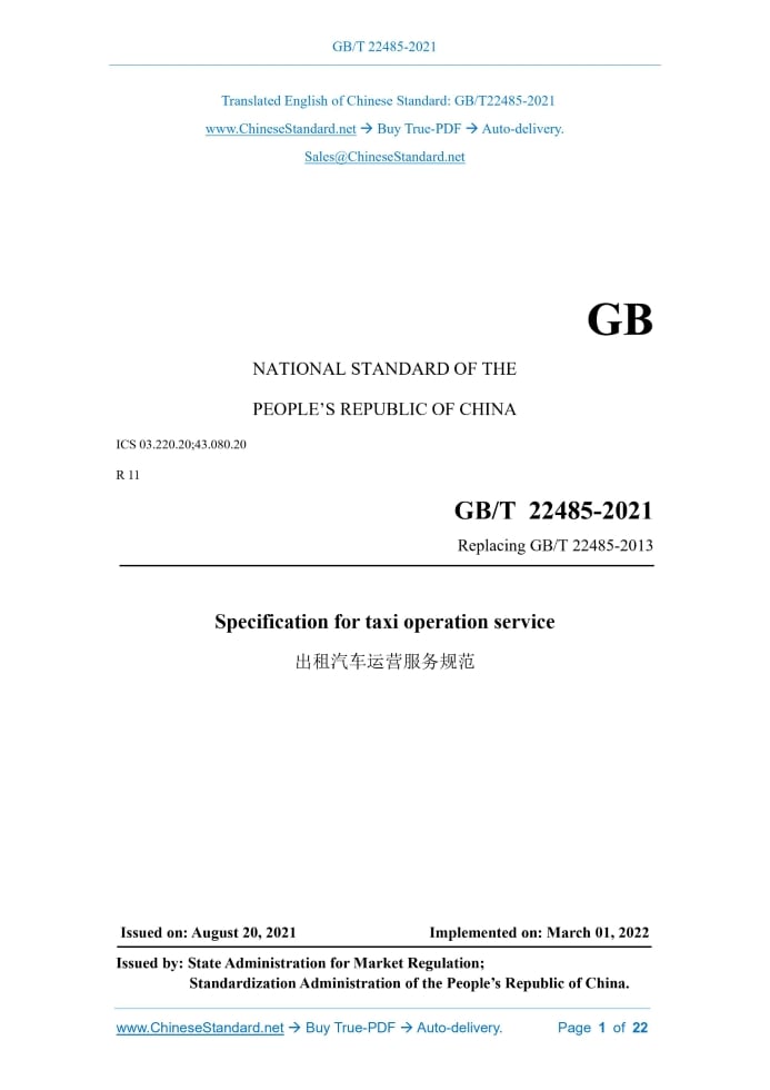 GB/T 22485-2021: Specification for taxi operation service Delivery: 9 seconds. True-PDF full-copy in English & invoice will be downloaded + auto-delivered via email. See step-by-step procedure Status: Valid GB/T 22485: Historical versions
