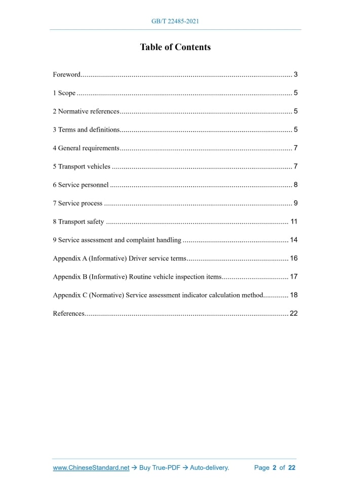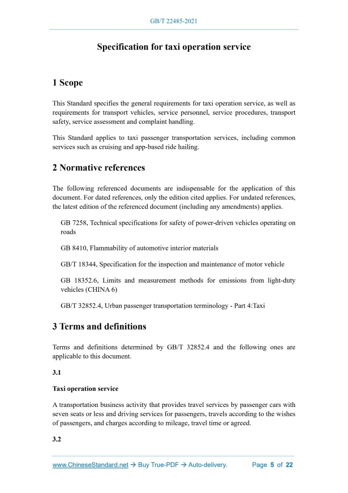 Similar standardsGB/T 22485-2021: Specification for taxi operation service---This is an excerpt. Full copy of true-PDF in English version (including equations, symbols, images, flow-chart, tables, and figures etc.), auto-downloaded/delivered in 9 seconds, can be purchased online: https://www.ChineseStandard.net/PDF.aspx/GBT22485-2021NATIONAL STANDARD OF THE PEOPLE’S REPUBLIC OF CHINA ICS 03.220.20;43.080.20 R 11 Replacing GB/T 22485-2013 Specification for taxi operation service ISSUED ON: AUGUST 20, 2021 IMPLEMENTED ON: MARCH 01, 2022 Issued by: State Administration for Market Regulation; Standardization Administration of the People’s Republic of China. Table of ContentsForeword ... 3 1 Scope ... 5 2 Normative references ... 5 3 Terms and definitions... 5 4 General requirements ... 7 5 Transport vehicles ... 7 6 Service personnel ... 8 7 Service process ... 9 8 Transport safety ... 11 9 Service assessment and complaint handling ... 14 Appendix A (Informative) Driver service terms ... 16 Appendix B (Informative) Routine vehicle inspection items ... 17 Appendix C (Normative) Service assessment indicator calculation method ... 18 References ... 22 Specification for taxi operation service1 ScopeThis Standard specifies the general requirements for taxi operation service, as well as requirements for transport vehicles, service personnel, service procedures, transport safety, service assessment and complaint handling. This Standard applies to taxi passenger transportation services, including common services such as cruising and app-based ride hailing.2 Normative referencesThe following referenced documents are indispensable for the application of this document. For dated references, only the edition cited applies. For undated references, the latest edition of the referenced document (including any amendments) applies. GB 7258, Technical specifications for safety of power-driven vehicles operating on roads GB 8410, Flammability of automotive interior materials GB/T 18344, Specification for the inspection and maintenance of motor vehicle GB 18352.6, Limits and measurement methods for emissions from light-duty vehicles (CHINA 6) GB/T 32852.4, Urban passenger transportation terminology - Part 4:Taxi3 Terms and definitionsTerms and definitions determined by GB/T 32852.4 and the following ones are applicable to this document. 3.1 Taxi operation service A transportation business activity that provides travel services by passenger cars with seven seats or less and driving services for passengers, travels according to the wishes of passengers, and charges according to mileage, travel time or agreed. 3.2 Cruising taxi operation service A business activity where a taxi, with seven seats or less, can cruise on the road to solicit passengers, wait for passengers at the site, paint and install taxi signs, provide passengers with travel services, drive according to the wishes of passengers, and charge according to the mileage and time. Note: Including car-hailing, on-call service, site service and other service methods. 3.3 App-based ride hailing operation service Enterprises build a service platform based on Internet technology, accept booking requests from car-hailing people through the network service platform, use qualified vehicles and drivers, and provide taxi service business activities such as not cruising on the road to solicit customers, waiting for customers on the site, etc. 3.4 Service personnel A person who directly or indirectly provides taxi services to passengers or ride-hailers. Note: Including drivers and personnel of enterprise management, dispatch service, site service, complaint handling, etc. 3.5 Service quality Characterization of the degree of quality of taxi service. 3.6 Enterprise service quality and credit assessment A comprehensive assessment of the management system, safe operation, operation service and social responsibility of taxi operators in a certain assessment period. 3.7 Taxi driver service quality and credit assessment A comprehensive assessment of taxi drivers' compliance with laws and regulations, safe production, business behavior and operation services in taxi services in a certain assessment period. 5.2 Requirements for vehicle appearance 5.2.1 The appearance of the vehicle body shall meet the following requirements: a) The appearance of the vehicle body shall be clean and in good condition. The front and rear lights inside and outside the vehicle shall be complete and functional. b) The tire covers shall be complete and in good condition. The doors shall function normally. c) The window glass shall be well sealed, clean and bright, without obstructions, and the lifting function shall be effective. The glass wipers shall function normally. 5.2.2 The compartment shall be clean and hygienic, free of sundries and odors; the interior of the compartment shall meet the following requirements: a) The instrument display shall be in good condition; b) No items unrelated to operation shall be placed on the instrument panel and rear windshield window sill; c) Sun visors and vanity mirrors shall be in good condition. 5.2.3 Vehicle accessories shall meet the following requirements: a) The seat shall be firm without collapse; b) The front seats shall be moved back and forth, and the backrest inclination shall be adjustable; c) Safety belts and buckles shall be complete and effective; d) The seat cover, headrest cover and foot pad shall be complete and neat. 5.2.4 The luggage compartment shall be clean, with effective lighting and good opening device. Cleaning items shall be placed in an orderly manner and not exposed to passengers. The space in the luggage compartment for passengers to place luggage items shall not be less than two-thirds of the luggage compartment. 5.2.5 Advertisements shall be posted and painted as required, and service signs shall not be blocked. The compartment video equipment can be switched on and off according to the wishes of the passengers.6 Service 
