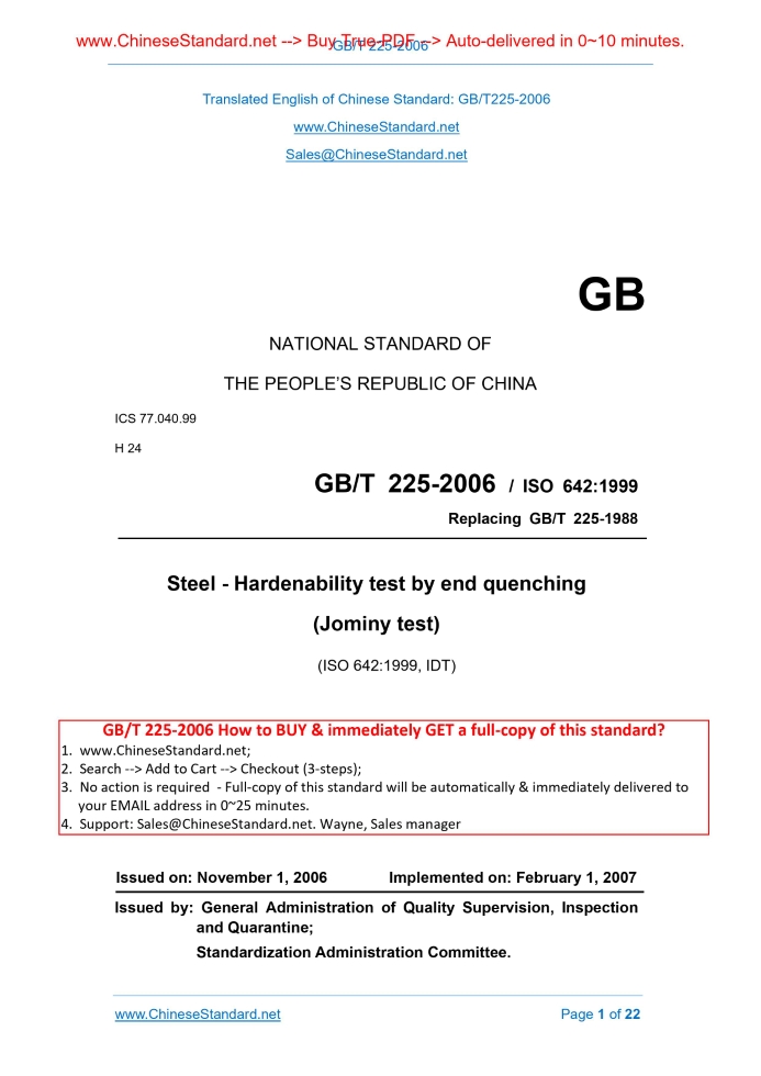 GB/T 225-2006: Steel -- Hardenability test by end quenching (Jominy test) Delivery: 9 seconds. True-PDF full-copy in English & invoice will be downloaded + auto-delivered via email. See step-by-step procedure Status: Valid GB/T 225: Historical versions