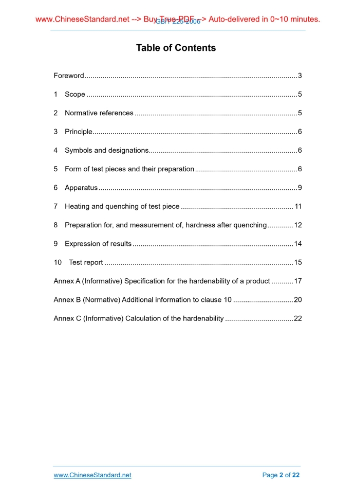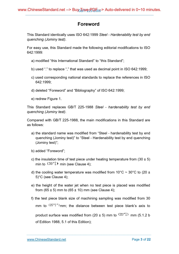 Similar standardsGB/T 225-2006: Steel -- Hardenability test by end quenching (Jominy test)---This is an excerpt. Full copy of true-PDF in English version (including equations, symbols, images, flow-chart, tables, and figures etc.), auto-downloaded/delivered in 9 seconds, can be purchased online: https://www.ChineseStandard.net/PDF.aspx/GBT225-2006GB NATIONAL STANDARD OF THE PEOPLE’S REPUBLIC OF CHINA ICS 77.040.99 H 24 GB/T 225-2006 / ISO 642.1999 Replacing GB/T 225-1988 Steel - Hardenability test by end quenching (Jominy test) (ISO 642.1999, IDT) Issued on: NOVEMBER 1, 2006 Implemented on: FEBRUARY 1, 2007 Issued by. General Administration of Quality Supervision, Inspection and Quarantine; Standardization Administration Committee. Table of ContentsForeword ... 3 1 Scope ... 5 2 Normative references ... 5 3 Principle... 6 4 Symbols and designations... 6 5 Form of test pieces and their preparation ... 6 6 Apparatus ... 9 7 Heating and quenching of test piece ... 11 8 Preparation for, and measurement of, hardness after quenching ... 12 9 Expression of results ... 14 10 Test report ... 15 Annex A (Informative) Specification for the hardenability of a product ... 17 Annex B (Normative) Additional information to clause 10 ... 20 Annex C (Informative) Calculation of the hardenability ... 22ForewordThis Standard identically uses ISO 642.1999 Steel - Hardenability test by end quenching (Jominy test). For easy use, this Standard made the following editorial modifications to ISO 642.1999. a) modified “this International Standard” to “this Standard”; b) used “.” to replace “,” that was used as decimal point in ISO 642.1999; c) used corresponding national standards to replace the references in ISO 642.1999; d) deleted “Foreword” and “Bibliography” of ISO 642.1999; e) redrew Figure 1. This Standard replaces GB/T 225-1988 Steel - hardenability test by end quenching (Jominy test). Compared with GB/T 225-1988, the main modifications in this Standard are as follows. a) the standard name was modified from “Steel - hardenability test by end quenching (Jominy test)” to “Steel - Hardenability test by end quenching (Jominy test)”; b) added “Foreword”; c) the insulation time of test piece under heating temperature from (30 ± 5) min to min (see Clause 4); d) the cooling water temperature was modified from 10°C ~ 30°C to (20 ± 5)°C (see Clause 4); e) the height of the water jet when no test piece is placed was modified from (65 ± 5) mm to (65 ± 10) mm (see Clause 4); f) the test piece blank size of machining sampling was modified from 30 mm to mm; the distance between test piece blank’s axis to product surface was modified from (20 ± 5) mm to mm (5.1.2 b of Edition 1988, 5.1 of this Edition); g) the sampling method was modified FROM sampling method according to test material size TO forging and machining; deleted 5.1.5 and 5.1.6 of GB/T 225-1988; added sampling provisions on continuous casting products (see 5.1 of this Edition); h) the insulation time at normalizing temperature was modified from 30 min ~ 60 min to min (5.2.3 of Edition 1988, 5.3 of this Edition); i) deleted specific requirements for the roughness of the circumferential and end faces of the test piece in Figure 2 (see Figure 2); j) deleted the provisions on indentation point stagger arrangement; added the provisions on indentation point position accuracy ±0.10 mm (8.3.1 b of Edition 1988, 8.4.1.2 of this Edition); k) self-tempering testing acid was modified to one type (8.1.3 of Edition 1988, 8.2 of this Edition); l) Annex A of GB/T 225-1988 was adjusted to Annex B; added informative Annex A, Annex C. Annex A, Annex B and Annex C of this Standard are informative. This Standard was proposed by China Iron and Steel Industry Association. This Standard shall be under the jurisdiction of National Technical Committee on Steel of Standardization Administration of China. Main drafting organizations of this Standard. Baoshan Iron and Steel Co., Ltd. Special Steel Branch, Metallurgical Industry Information Standards Institute, Beijing Shougang Special Steel Co., Ltd., Iron and Steel Research Institute. Main drafters of this Standard. Li Xiaodong, Luan Yan, Yu Xinxia, Wang Guimin, Sun Shiqiu. Versions of standard substituted by this Standard are. - GB/T 225-1963, GB/T 225-1988. Steel - Hardenability test by end quenching (Jominy test)1 ScopeThis Standard specifies a method for determining the hardenability of steel by end quenching (Jominy test) by using a test piece 25 mm in diameter and 100 mm long. NOTE By agreement and for a defined field of application, the test described in this Standard may be replaced by the calculation of the Jominy curve in accordance with an accepted mathematical mode! (see annex C). In case of dispute, the test shall be earned out.2 Normative referencesThe following standards contain the provisions which, through reference in this Standard, constitute the provisions of this Standard. For dated references, subsequent amendments (excluding corrections) or revisions do not apply to this Standard. However, the parties who enter into agreement based on this Standard are encouraged to investigate whether the latest versions of these documents are applicable. For undated reference documents, the latest versions apply to this Standard. GB/T 230.1, Metallic Rockwell hardness test - Part 1. Test method (scales A, B, C, D, E, F, G, H, K, N, T) [GB/T 230.1-2004, ISO 6508-1.1999, Metallic materials - Rockwell hardness test - Part 1. Test method (scales A, B, C, D, E, F, G, K, N, T), MOD] GB/T 230.2, Metallic Rockwell hardness test - Part2. Verification and calibration of hardness testers (scales A, B, C, D, E, F, G, H, K, N, T) [GB/T 230.2-2002, ISO 6508-2.1999, Metallic materials - Rockwell hardness test - Part 2. Verification and calibration of testing machines (scales A, B, C, D, E, F, G, K, N, T), MOD] GB/T 230.3, Metallic materials - Rockwell hardness test - Part 3. Calibration of referen