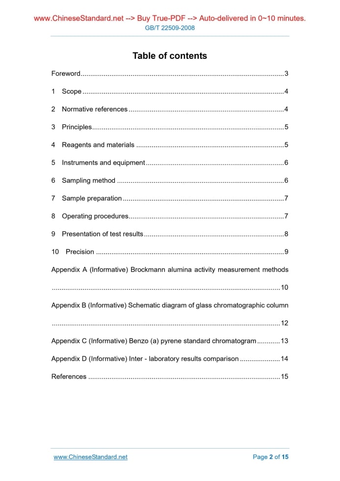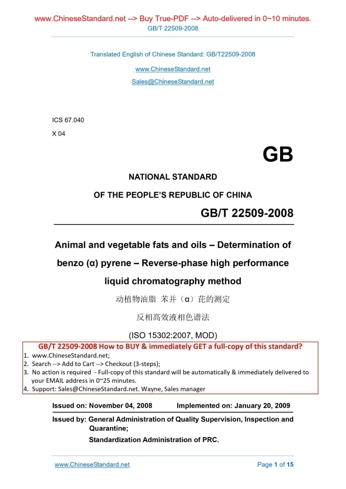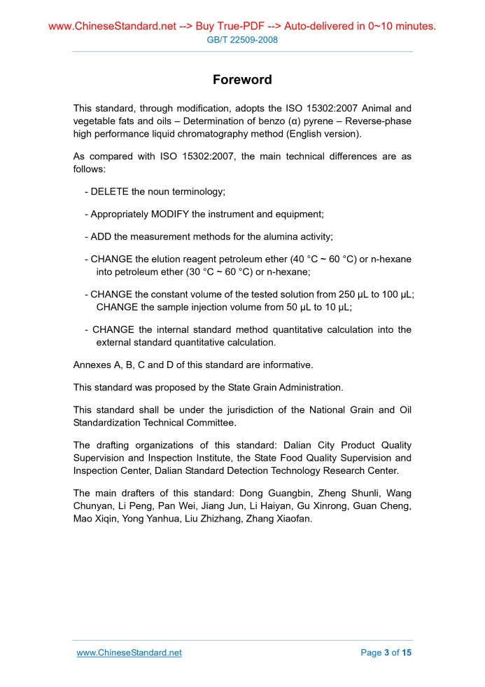 Similar standardsGB/T 22509-2008: Animal and vegetable fats and oils -- Determination of benzo(a)pyrene -- Reverse-phase high performance liquid chromatography method---This is an excerpt. Full copy of true-PDF in English version (including equations, symbols, images, flow-chart, tables, and figures etc.), auto-downloaded/delivered in 9 seconds, can be purchased online: https://www.ChineseStandard.net/PDF.aspx/GBT22509-2008 ICS 67.040 X 04 GB NATIONAL STANDARD OF THE PEOPLE’S REPUBLIC OF CHINA Animal and vegetable fats and oils – Determination of benzo (α) pyrene – Reverse-phase high performance liquid chromatography method (ISO 15302.2007, MOD) Issued on: NOVEMBER 04, 2008 Implemented on: JANUARY 20, 2009 Issued by. General Administration of Quality Supervision, Inspection and Quarantine; Standardization Administration of PRC. Table of ContentsForeword ... 3 1 Scope ... 4 2 Normative references ... 4 3 Principles ... 5 4 Reagents and materials ... 5 5 Instruments and equipment ... 6 6 Sampling method ... 6 7 Sample preparation ... 7 8 Operating procedures ... 7 9 Presentation of test results ... 8 10 Precision ... 9 Appendix A (Informative) Brockmann alumina activity measurement methods ... 10 Appendix B (Informative) Schematic diagram of glass chromatographic column ... 12 Appendix C (Informative) Benzo (a) pyrene standard chromatogram ... 13 Appendix D (Informative) Inter - laboratory results comparison ... 14 References ... 15ForewordThis standard, through modification, adopts the ISO 15302.2007 Animal and vegetable fats and oils – Determination of benzo (α) pyrene – Reverse-phase high performance liquid chromatography method (English version). As compared with ISO 15302.2007, the main technical differences are as follows. - DELETE the noun terminology; - Appropriately MODIFY the instrument and equipment; - ADD the measurement methods for the alumina activity; - CHANGE the elution reagent petroleum ether (40 °C ~ 60 °C) or n-hexane into petroleum ether (30 °C ~ 60 °C) or n-hexane; - CHANGE the constant volume of the tested solution from 250 μL to 100 μL; CHANGE the sample injection volume from 50 μL to 10 μL; - CHANGE the internal standard method quantitative calculation into the external standard quantitative calculation. Annexes A, B, C and D of this standard are informative. This standard was proposed by the State Grain Administration. This standard shall be under the jurisdiction of the National Grain and Oil Standardization Technical Committee. The drafting organizations of this standard. Dalian City Product Quality Supervision and Inspection Institute, the State Food Quality Supervision and Inspection Center, Dalian Standard Detection Technology Research Center. The main drafters of this standard. Dong Guangbin, Zheng Shunli, Wang Chunyan, Li Peng, Pan Wei, Jiang Jun, Li Haiyan, Gu Xinrong, Guan Cheng, Mao Xiqin, Yong Yanhua, Liu Zhizhang, Zhang Xiaofan. Animal and vegetable fats and oils – Determination of benzo(α)pyrene – Reverse-phase high performance liquid chromatography method1 ScopeThis standard specifies the principles, reagents and materials, apparatus and equipment, sampling method, sample preparation, operation procedures, test results presentation, precision and so on for the determination of benzo (a) pyrene in animal and vegetable fats and oils through the reverse-phase high performance liquid chromatography method. This standard applies to animal and vegetable fats and oils. The minimum detection limit of this standard method is 0.1 μg/kg. The measurement range of this standard is 0.1 μg/kg ~ 50 μg/kg.2 Normative referencesThe provisions in following documents become the provisions of this standard through reference in this Standard. For the dated references, the subsequent amendments (excluding corrections) or revisions do not apply to this standard; however, parties who reach an agreement based on this standard are encouraged to study if the latest versions of these documents are applicable. For undated references, the latest edition of the referenced document applies. GB/T 6379.2 Accuracy (trueness and precision) of measurement methods and results - Part 2. Basic methods for the determination of repeatability and reproducibility of a standard measurement method (GB/T 6379.2-2004, ISO 5725-2.1994, IDT); GB/T 6682 Water for analytical laboratory use – Specification and test methods (GB/T 6682-2008, ISO 3696.1987, MOD); GB/T 15687 Oils and fats – Preparation of test sample (GB/T 15687-1995, eqv ISO 661.1989) 4.9 benzo (a) pyrene standard sample. CAS No.. 50-32-8, AND its purity is not less than 99.0%. Warning - benzo (a) pyrene is a known carcinogen, so during measurement it shall pay special attention to safety protection. The measurement shall be conducted in a fume hood, AND the operator shall wear gloves and minimize exposure. 4.10 Benzo (a) pyrene standard stock solution. accurately WEIGH 12.5 mg of benzo (a) pyrene (4.9); PLACE it into a 25 mL volumetric flask; USE toluene (4.6) to dissolve AND make it reach to volume. The content of benzo (a) pyrene in this solution is about 0.5 mg/mL. PRESERVE it at 4 °C in dark, which can maintain stable for at least 6 months. 4.11 Standard working solution. USE the benzo (a) pyrene standard stock solution (4.10) to respectively prepare two kinds of standard solutions, the benzo (a) pyrene content of which is about 0.2 μg/mL and 0.01 μg/mL respectively .5 Instruments and equipment5.1 Glass column (SEE Appendix B). equipped with sintered glass mats and Teflon taps. 5.2 Constant temperature water bath. 5.3 Rotary evaporator. 5.4 HPLC. If auto-samplers are used, the sample loop should be rinsed with acetonitrile in the sequence. 5.5 Glass vial. Approximately 1 mL with a sealable lid.6 Sampling methodThe samples received by the laboratory shall be representative, AND the samples shall not be damaged or altered during transport and storage. This standard does not specify the sampling method,