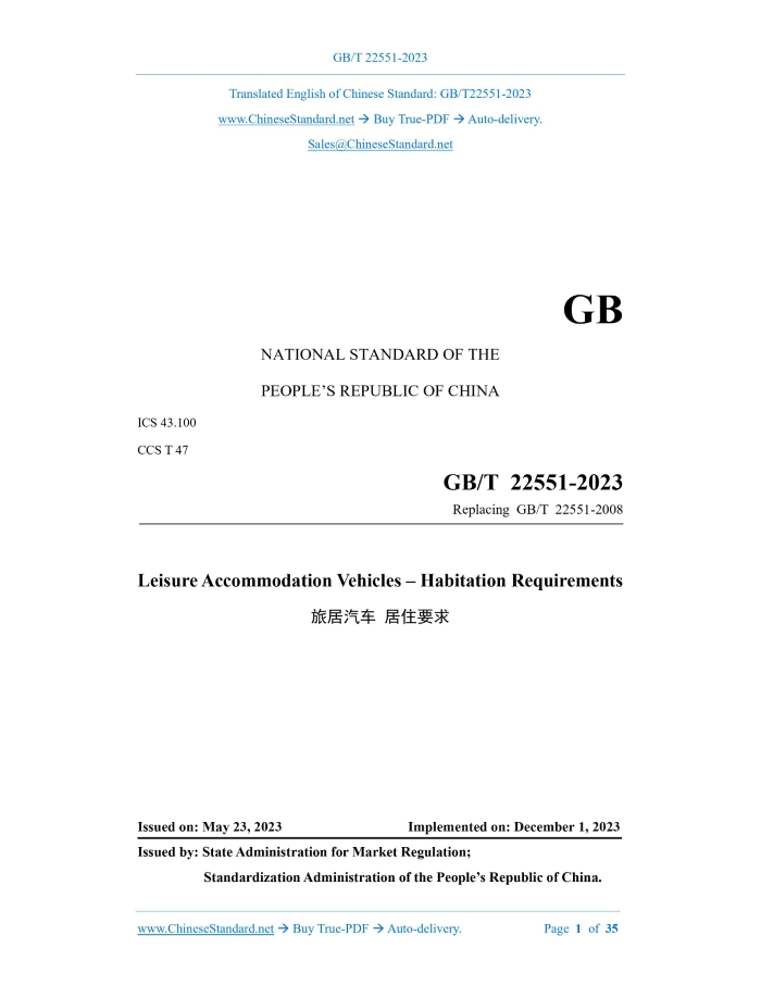 GB/T 22551-2023: Leisure accommodation vehicles - Habitation requirements Delivery: 9 seconds. True-PDF full-copy in English & invoice will be downloaded + auto-delivered via email. See step-by-step procedure Status: Valid GB/T 22551: Historical versions