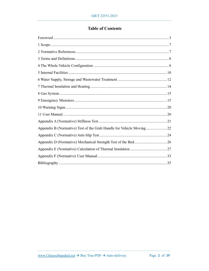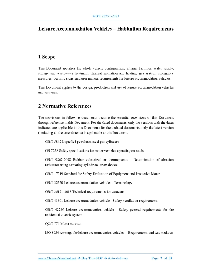Similar standardsGB/T 22551-2023: Leisure accommodation vehicles - Habitation requirements---This is an excerpt. Full copy of true-PDF in English version (including equations, symbols, images, flow-chart, tables, and figures etc.), auto-downloaded/delivered in 9 seconds, can be purchased online: https://www.ChineseStandard.net/PDF.aspx/GBT22551-2023GB NATIONAL STANDARD OF THE PEOPLE’S REPUBLIC OF CHINA ICS 43.100 CCS T 47 Replacing GB/T 22551-2008 Leisure Accommodation Vehicles – Habitation Requirements ISSUED ON: MAY 23, 2023 IMPLEMENTED ON: DECEMBER 1, 2023 Issued by: State Administration for Market Regulation; Standardization Administration of the People’s Republic of China. Table of ContentsForeword ... 3 1 Scope ... 7 2 Normative References ... 7 3 Terms and Definitions ... 8 4 The Whole Vehicle Configuration ... 8 5 Internal Facilities ... 10 6 Water Supply, Storage and Wastewater Treatment ... 12 7 Thermal Insulation and Heating ... 14 8 Gas System ... 15 9 Emergency Measures ... 15 10 Warning Signs ... 20 11 User Manual ... 20 Appendix A (Normative) Stiffness Test ... 21 Appendix B (Normative) Test of the Grab Handle for Vehicle Moving ... 22 Appendix C (Normative) Anti-Slip Test ... 24 Appendix D (Normative) Mechanical Strength Test of the Bed ... 26 Appendix E (Normative) Calculation of Thermal Insulation ... 27 Appendix F (Normative) User Manual ... 33 Bibliography ... 35 Leisure Accommodation Vehicles – Habitation Requirements1 ScopeThis Document specifies the whole vehicle configuration, internal facilities, water supply, storage and wastewater treatment, thermal insulation and heating, gas system, emergency measures, warning signs, and user manual requirements for leisure accommodation vehicles. This Document applies to the design, production and use of leisure accommodation vehicles and caravans.2 Normative ReferencesThe provisions in following documents become the essential provisions of this Document through reference in this Document. For the dated documents, only the versions with the dates indicated are applicable to this Document; for the undated documents, only the latest version (including all the amendments) is applicable to this Document. GB/T 5842 Liquefied petroleum steel gas cylinders GB 7258 Safety specifications for motor vehicles operating on roads GB/T 9867-2008 Rubber vulcanized or thermoplastic - Determination of abrasion resistance using a rotating cylindrical drum device GB/T 17219 Standard for Safety Evaluation of Equipment and Protective Mater GB/T 22550 Leisure accommodation vehicles - Terminology GB/T 36121-2018 Technical requirements for caravans GB/T 41601 Leisure accommodation vehicle - Safety ventilation requirements GB/T 42289 Leisure accommodation vehicle - Safety general requirements for the residential electric system QC/T 776 Motor caravan ISO 8936 Awnings for leisure accommodation vehicles – Requirements and test methods3 Terms and DefinitionsFor the purposes of this Document, the terms and definitions given in GB 7258 and GB/T 22550 apply.4 The Whole Vehicle Configuration4.1 Capacity of bed The bed capacity of a leisure accommodation vehicle shall be consistent with the number of beds provided (including fixed beds and movable beds), and the number of beds and their layout shall be indicated in the user manual. 4.2 Stiffness When the caravan supports all its supporting devices on the ground in a stationary state, conduct a stiffness test on any supporting device in accordance with the method specified in Appendix A. The doors and windows of the caravan shall not deform in such a way that it is difficult to open. 4.3 Supporting device Caravan shall be equipped with four supporting devices, one at each corner. The supporting device shall be telescopic and height-adjustable. Each supporting device shall be able to withstand a load of no less than 25% of the maximum total design mass of the caravan when extended. The front supporting device of the caravan semi-trailer shall be able to withstand a load of no less than 50% of the maximum total design mass of the caravan. When the supporting device is used, one or more wheels of the caravan shall not be lifted off the ground unless the user manual specifically states that the supporting device is used for this purpose. Suitable operating tools for height adjustment shall be provided. The load capacity of the supporting device shall be stated in the user manual. 4.4 Grab handle for vehicle moving A caravan with a total mass less than or equal to 2000kg shall be equipped with 4 grab handles for vehicle moving, one at the front and rear of each side. If the maximum allowable total mass of the caravan does not exceed 750kg, it only needs to be equipped with one grab handle for vehicle moving at the front on the left and right sides. The horizontal operating space of each grab handle for vehicle moving shall be no less than 30mm × 120mm. The grab handle for caravan moving shall be tested in accordance with Appendix B. After the test, the grab handle for caravan moving and its fixing device shall not be permanently deformed or loose. 4.5 Entrance steps 4.5.1 Height 4.8 Sunroof and side windows When the leisure accommodation vehicle is driving, the sunroof, side windows and their accessories shall not become loose, and screens and sunshades shall be installed on the inside. 4.9 Awnings If a leisure accommodation vehicle is equipped with an awning, it shall meet the requirements of ISO 8936; and its installation and use shall meet the requirements of the manufacturer's technical documents. 4.10 Electrical equipment The electrical appliances and supporting equipment of a leisure accommodation vehicle shall meet the requirements of GB/T 42289. 4.11 Ventilation The ventilation system of the leisure accommodation vehicles shall meet the requirements of GB/T 41601. Bathrooms, stove areas, and gas cylinder storage rooms shall be equipped with ventilation devices or exhaust outlets. Ventilation dev