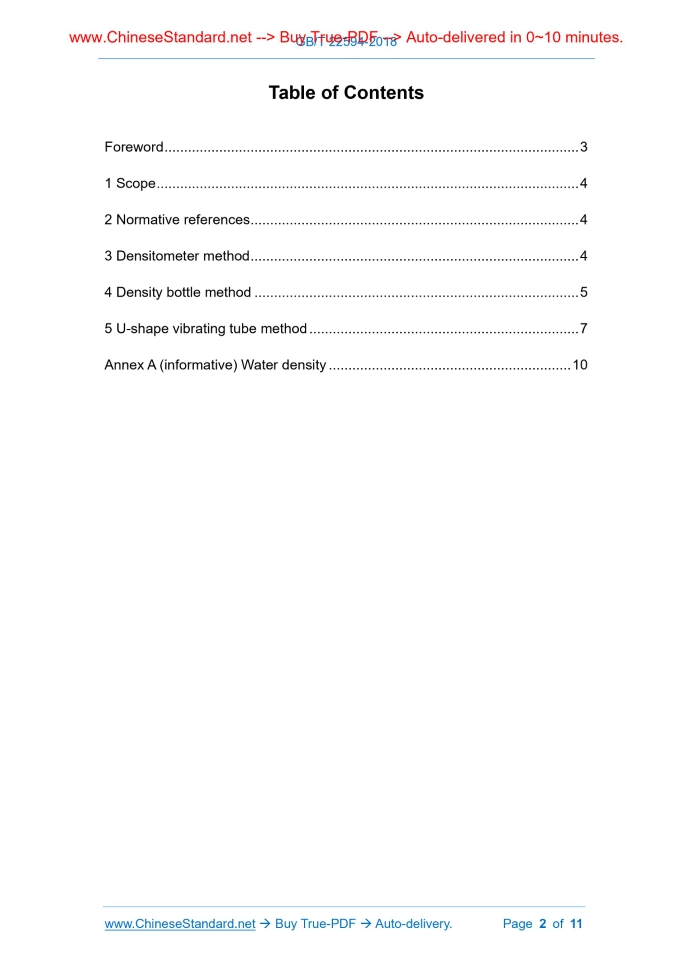 Similar standardsGB/T 22594-2018: Water treatment chemicals - General rules for determination of density---This is an excerpt. Full copy of true-PDF in English version (including equations, symbols, images, flow-chart, tables, and figures etc.), auto-downloaded/delivered in 9 seconds, can be purchased online: https://www.ChineseStandard.net/PDF.aspx/GBT22594-2018GB NATIONAL STANDARD OF THE PEOPLE’S REPUBLIC OF CHINA ICS 71.040.40 G 76 Replacing GB/T 22594-2008 Water treatment chemicals – General rules for determination of density Issued on: JUNE 7, 2018 Implemented on: JANUARY 1, 2019 Issued by. State Administration for Market Regulation; Standardization Administration Committee. Table of ContentsForeword ... 3 1 Scope ... 4 2 Normative references ... 4 3 Densitometer method ... 4 4 Density bottle method ... 5 5 U-shape vibrating tube method ... 7 Annex A (informative) Water density ... 10ForewordThis Standard was drafted in accordance with the rules given in GB/T 1.1-2009. This Standard replaces GB/T 22594-2008 “Water treatment reagent - General rules for the determination of density”. Compared with GB/T 22594-2008, in addition to the editorial modifications, the main technical changes are as follows. - added U-shape vibrating tube method (see Clause 5). This Standard was proposed by China Petroleum and Chemical Industry Federation. This Standard shall be under the jurisdiction of Subcommittee on Water Treatment Agent of National Technical Committee on Chemistry of Standardization Administration of China (SAC/TC 63/SC 5). The drafting organizations of this Standard. Zhejiang Shuizhiyin Testing Co., Ltd., Guangzhou Special Pressure Equipment Testing Institute, METTLER TOLEDO Instruments (Shanghai) Co., Ltd., Henan Qingshuiyuan Technology Co., Ltd., Shenzhen Junnuo Testing Co., Ltd., CNOOC Tianjin Chemical Research and Design Institute Co., Ltd., Shijiazhuang Zhiyuan Environmental Protection Technology Co., Ltd., China Petroleum & Chemical Corporation Beijing Beihua Institute Yanshan Branch, Tianjin Zhengda Technology Co., Ltd., Chongqing University. Main drafters of this Standard. Yu Minghua, Yin Zongjie, Chen Jianxia, Yang Haixing, Peng Jiana, Bai Ying, Li Yongguang, Fan Dayong, Zhang Quan, Zheng Huaili. Version of standard substituted by this Standard is. - GB/T 22594-2008. Water treatment chemicals - General rules for determination of density1 ScopeThis Standard specifies general methods for density determination of water treatment chemicals. This Standard is applicable to the density determination of water treatment chemicals.2 Normative referencesThe following referenced documents are indispensable for the application of this document. For dated references, only the edition cited applies. For undated references, the latest edition of the referenced document (including any amendments) applies. GB/T 6682, Water for analytical laboratory use - Specification and test methods3 Densitometer method3.1 Method summary The density of the liquid is read by the depth at which the densitometer is submerged in the equilibrium state of the sample to be tested. 3.2 Equipment and instruments 3.2.1 Densitometer. the division value is 0.001 g/cm3. 3.2.2 Glass measuring cylinder. 250mL ~ 500mL. 3.2.3 Constant temperature water bath. temperature control at (20±0.1)°C. 3.3 Test steps 3.3.1 Determination of density at constant temperature (20°C). slowly inject the sample to be tested into a clean, dry cylinder without bubbles; place the measuring cylinder in a constant temperature water bath at (20±0.1)°C. After Warning -- The reagent ammonium persulfate used in this method is a strong oxidant, which is irritating and corrosive. Avoid inhalation or contact with eyes and skin when using. If contact occurs, rinse immediately with plenty of water. If it is serious, seek medical attention immediately. 5.2.1 General rules The reagents and water used in this method, unless otherwise specified, only use analytical reagents and grade three water in accordance with GB/T 6682. 5.2.2 Ammonium persulfate solution Weigh 0.8 g of ammonium persulfate. Dilute to 100mL with water and shake well. 5.2.3 Standard sample 5.2.3.1 Air. air density value = 1.293 × (actual pressure/standard physical atmospheric pressure) × (273.15/actual absolute temperature). At 20°C, an atmospheric pressure, the air density value is 0.001205 g/cm3. 5.2.3.2 Water. grade 2 water in accordance with GB/T 6682; or standard water sample purchased of commercially available density. At 20°C, the water density value is 0.9982057 g/cm3. See Annex A for density values of water at different temperatures. 5.3 Equipment and instruments 5.3.1 U-shape vibrating tube densitometer (referred to as densitometer). accuracy is ±0.001 g/cm3; temperature accuracy is ±0.1°C. 5.4 Instrument preparation 5.4.1 Selection of washing solvent Select volatile solvents according to the nature of the sample to be tested. Generally, water, acetone, absolute ethanol, etc. are commonly used. 5.4.2 Cleaning U-shape tube 5.4.2.1 Clean the U-shape tube with washing solvent and dry it with clean dry air. 5.4.2.2 When a precipitate appears in the U-shape tube, it is injected into the U-shape tube with ammonium persulfate solution. After draining the ammonium persulfate solution, it is washed with water, washed with a water-miscible washing solvent, and then dried with clean dry air. ......Source: Above contents are excerpted from the full-copy PDF -- translated/reviewed by: www.ChineseStandard.net / Wayne Zheng et al. Tips & Frequently Asked Questions:Question 1: How long will the true-PDF of English version of GB/T 22594-2018 be delivered?Answer: The full copy PDF of English version of GB/T 22594-2018 can be downloaded in 9 seconds, and it will also be emailed to you in 9 seconds (double mechanisms to ensure the delivery reliably), with PDF-invoice.Question 2: Can I share the purchased PDF of GB/T 22594-2018_English with my colleagues?Answer: Yes. The purchased PDF 