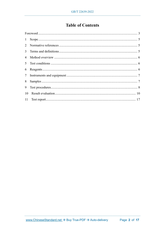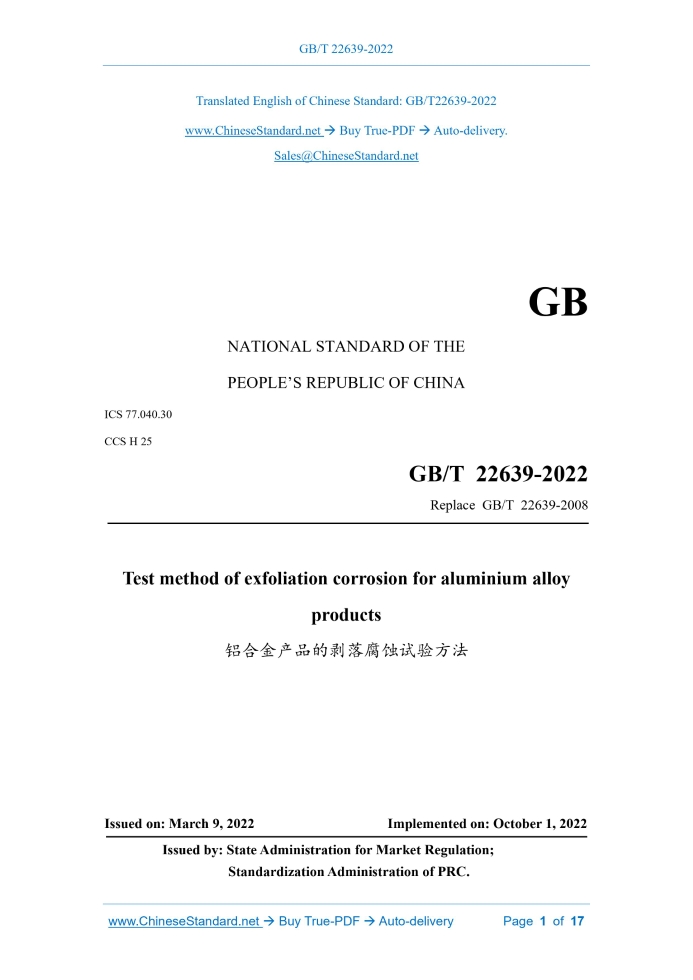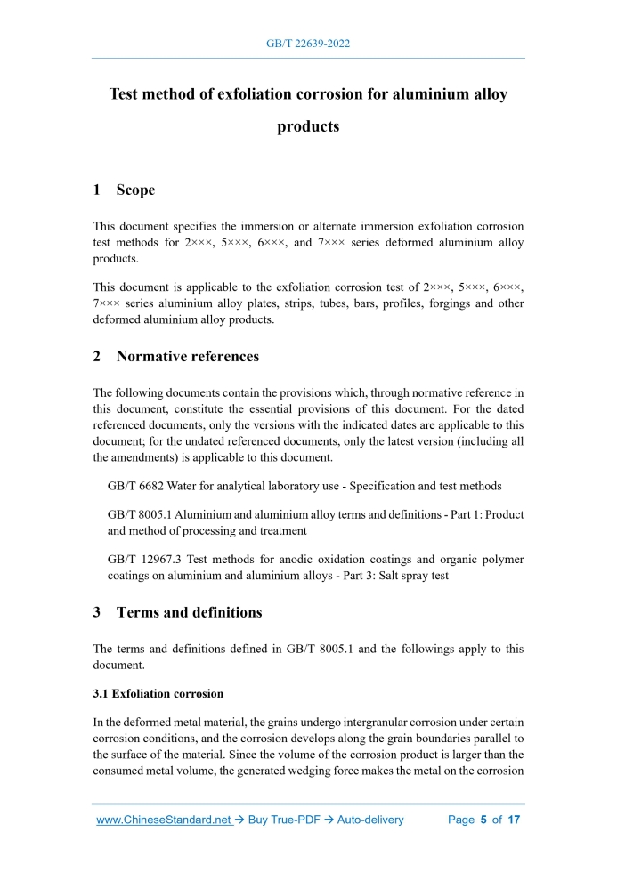 Similar standardsGB/T 22639-2022: Test method of exfoliation corrosion for aluminium alloy products---This is an excerpt. Full copy of true-PDF in English version (including equations, symbols, images, flow-chart, tables, and figures etc.), auto-downloaded/delivered in 9 seconds, can be purchased online: https://www.ChineseStandard.net/PDF.aspx/GBT22639-2022NATIONAL STANDARD OF THE PEOPLE’S REPUBLIC OF CHINA ICS 77.040.30 CCS H 25 Replace GB/T 22639-2008 Test method of exfoliation corrosion for aluminium alloy products ISSUED ON: MARCH 9, 2022 IMPLEMENTED ON: OCTOBER 1, 2022 Issued by: State Administration for Market Regulation; Standardization Administration of PRC. Table of ContentsForeword ... 3 1 Scope ... 5 2 Normative references ... 5 3 Terms and definitions ... 5 4 Method overview ... 6 5 Test conditions ... 6 6 Reagents ... 6 7 Instruments and equipment ... 7 8 Samples ... 7 9 Test procedures ... 8 10 Result evaluation ... 10 11 Test report ... 17 Test method of exfoliation corrosion for aluminium alloy products1 ScopeThis document specifies the immersion or alternate immersion exfoliation corrosion test methods for 2×××, 5×××, 6×××, and 7××× series deformed aluminium alloy products. This document is applicable to the exfoliation corrosion test of 2×××, 5×××, 6×××, 7××× series aluminium alloy plates, strips, tubes, bars, profiles, forgings and other deformed aluminium alloy products.2 Normative referencesThe following documents contain the provisions which, through normative reference in this document, constitute the essential provisions of this document. For the dated referenced documents, only the versions with the indicated dates are applicable to this document; for the undated referenced documents, only the latest version (including all the amendments) is applicable to this document. GB/T 6682 Water for analytical laboratory use - Specification and test methods GB/T 8005.1 Aluminium and aluminium alloy terms and definitions - Part 1: Product and method of processing and treatment GB/T 12967.3 Test methods for anodic oxidation coatings and organic polymer coatings on aluminium and aluminium alloys - Part 3: Salt spray test3 Terms and definitionsThe terms and definitions defined in GB/T 8005.1 and the followings apply to this document. 3.1 Exfoliation corrosion In the deformed metal material, the grains undergo intergranular corrosion under certain corrosion conditions, and the corrosion develops along the grain boundaries parallel to the surface of the material. Since the volume of the corrosion product is larger than the consumed metal volume, the generated wedging force makes the metal on the corrosion product lift up or peel off layer by layer and then form a type of laminar corrosion.4 Method overviewBy visual inspection (or an inspection under a microscope), the corrosion of the samples after the following test shall be rated according to the degree of corrosion: - Immersion test: Fully immerse the sample in the test solution at the set temperature for the specified test time, observe the corrosion degree of the sample and rate it. This method is suitable for the evaluation of exfoliation corrosion susceptibility of lithium-free aluminium alloys (lithium is an impurity element); - Alternate immersion test: Place the sample in a corrosion environment with the set spray, drying and humid heat cycle for the specified test time, observe the corrosion degree of the sample and rate it. This method is suitable for the evaluation of exfoliation corrosion susceptibility of lithium-containing aluminium alloys (lithium is an alloying element).5 Test conditionsThe ambient temperature of the immersion test shall not be higher than the test temperature. The ambient temperature of the alternate immersion test shall be 23 ℃±5 ℃, and the relative humidity shall be less than 75%.6 ReagentsWarning - The personnel using this document shall have practical experience in formal laboratory work. This document does not indicate all possible safety issues. The user is responsible for taking appropriate safety and health measures and ensuring compliance with the conditions stipulated by relevant national laws and regulations. Unless otherwise specified, only use reagents confirmed to be analytical reagents and the water that can meet the requirements of Grade III water specified in GB/T 6682. 6.1 Nitric acid solution (8+2). 6.2 Test solution for 2××× series (lithium-free), 6××× series and 7××× series aluminium alloys: Dissolve 234 g of sodium chloride and 50 g of potassium nitrate in water, add 6.7 mL of nitric acid, stir evenly, and dilute with water to 1000 mL. This solution contains 4.0 mol of sodium chloride, 0.5 mol of potassium nitrate and 0.1 mol of nitric acid, and the pH value of this solution is about 0.4. Note: The test solution without added nitric acid can be stored for a short time. 6.3 Test solution for 5××× series (lithium-free) aluminium alloy: Dissolve 53.5 g of ammonium chloride, 20.0 g of ammonium nitrate and 1.8 g of ammonium tartrate in a small amount of water, stir evenly, and dilute with water to 990 mL (or use a commercially available special reagent that does not contain a hydrogen peroxide reagent); heat the test solution to the test temperature, add 10 mL of hydrogen peroxide (30%; if the concentration cannot be determined, it shall be verified before use), and then stir evenly. This solution contains 1.0 mol of ammonium chloride, 0.25 mol of ammonium nitrate, 0.01 mol of ammonium tartrate and 0.09 mol of hydrogen peroxide, and the pH value of this solution is 5.2~5.4. 6.4 Test solution for lithium-containing aluminium alloy: Dissolve 50 g of sodium chloride in 950 mL of water, and adjust the pH of this solution to 2.8~3.0 with a glacial acetic acid solution (1+1).7 Instruments and equipment7.1 Conduction thermostat device: The temperature control accuracy shall be ±1 ℃. The test solution container (with a lid) and the sample