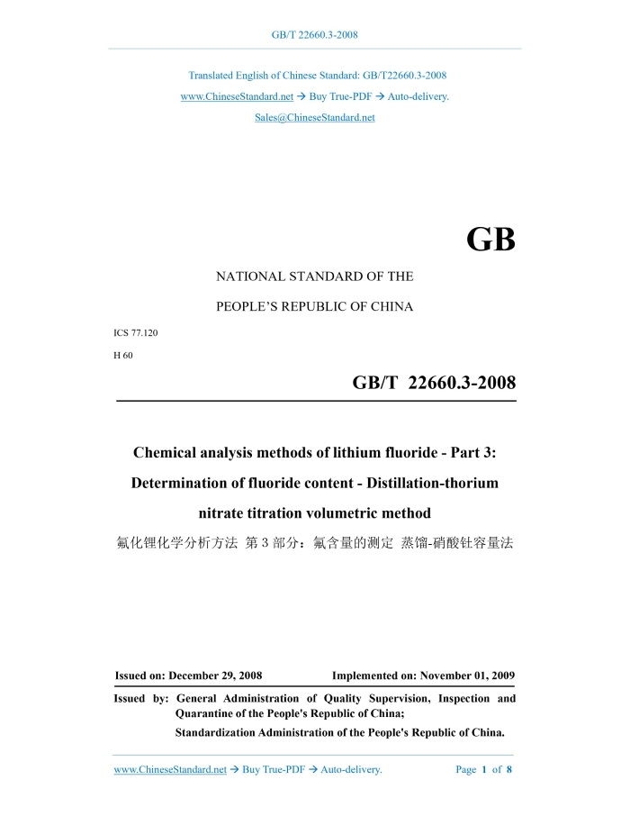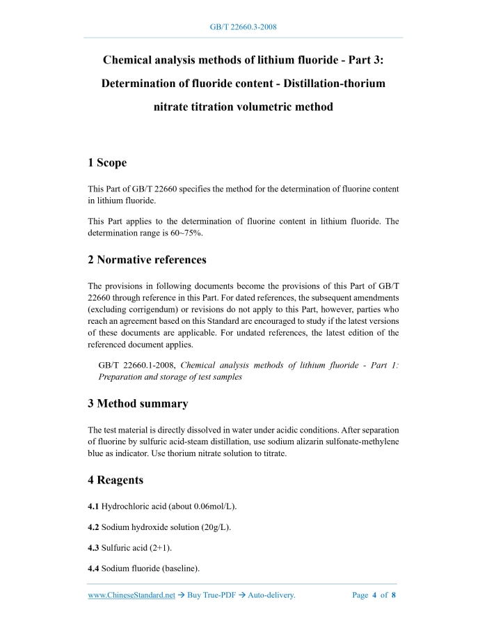 GB/T 22660.3-2008: Chemical analysis methods of lithium fluoride -- Part 3: Determination of fluoride content -- Distillation-thorium nitrate titration volumetric method Delivery: 9 seconds. True-PDF full-copy in English & invoice will be downloaded + auto-delivered via email. See step-by-step procedure Status: Valid