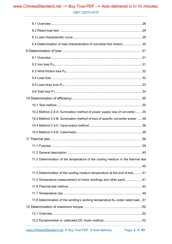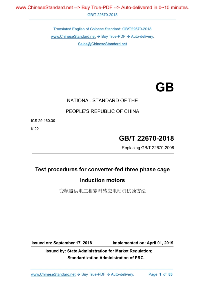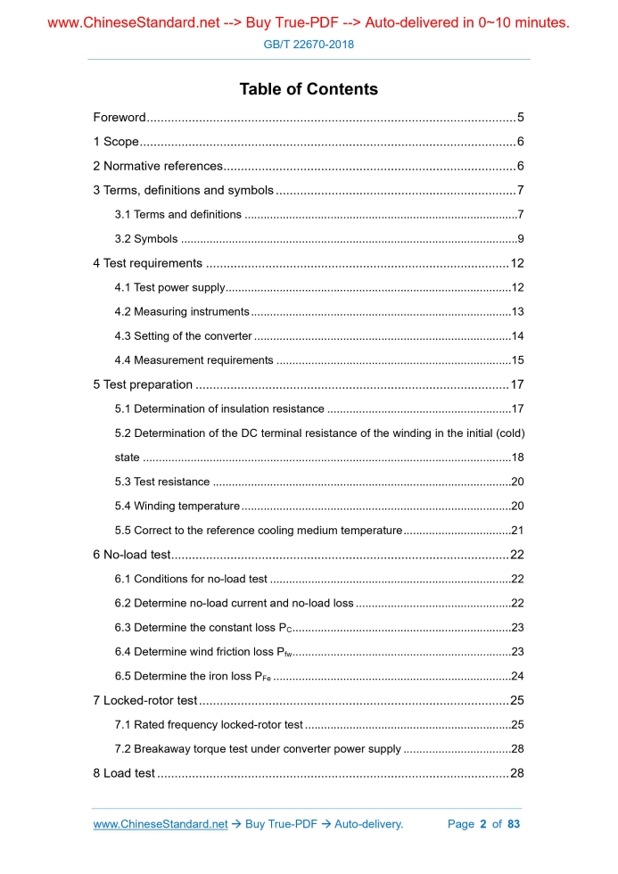 Similar standardsGB/T 22670-2018: Test procedures for converter-fed three phase cage induction motors---This is an excerpt. Full copy of true-PDF in English version (including equations, symbols, images, flow-chart, tables, and figures etc.), auto-downloaded/delivered in 9 seconds, can be purchased online: https://www.ChineseStandard.net/PDF.aspx/GBT22670-2018GB NATIONAL STANDARD OF THE PEOPLE’S REPUBLIC OF CHINA ICS 29.160.30 K 22 Replacing GB/T 22670-2008 Test procedures for converter-fed three phase cage induction motors Issued on. SEPTEMBER 17, 2018 Implemented on. APRIL 01, 2019 Issued by. State Administration for Market Regulation; Standardization Administration of PRC. Table of ContentsForeword... 5 1 Scope... 6 2 Normative references... 6 3 Terms, definitions and symbols... 7 4 Test requirements... 12 5 Test preparation... 17 6 No-load test... 22 7 Locked-rotor test... 25 8 Load test... 28 9 Determination of loss... 31 10 Determination of efficiency... 35 11 Thermal test... 39 12 Determination of maximum torque... 52 13 Determination of minimum torque... 56 14 Other tests... 58 Appendix A (Normative) Correction method of instrument loss and error... 66 Appendix B (Normative) Correction of dynamometer’s torque reading... 72 Appendix C (Informative) Measurement of slip rate of induction motor... 74 Appendix D (Informative) Linear regression analysis... 76 Appendix E (Informative) Output voltage of converter for test... 781 ScopeThis standard specifies the test requirements, pre-test preparation, no-load test, locked-rotor test, load test, determination of loss and efficiency, thermal test, maximum torque and minimum torque test for converter-fed three-phase cage induction motors. This standard applies to converter-fed three-phase cage induction motors. This standard does not apply to traction motors.2 Normative referencesThe following documents are essential to the application of this document. For the dated documents, only the versions with the dates indicated are applicable to this document; for the undated documents, only the latest version (including all the amendments) are applicable to this standard. GB/T 755-2008 Rating and performance of rotating motor GB/T 1032-2012 Test procedures for three-phase induction motors GB/T 10068-2008 Mechanical vibration of certain machines with shaft heights 56 mm and higher - Measurement, evaluation and limits of vibration severity GB/T 10069.1-2006 Measurement of airborne noise emitted by rotating electrical machines and the noise limits - Part 1.Method for the measurement of airborne noise emitted by rotating electrical machines GB/T 18039.4-2017 Electromagnetic compatibility - Environment - Compatibility levels in industrial plants for low-frequency conducted disturbances GB/T 21211-2017 Equivalent loading and superposition techniques - Indirect testing to determine temperature rise of rotating electrical machines3 Terms, definitions and symbols3.1 Terms and definitions The terms and definitions as defined in GB/T 755-2008, GB/T 1032-2012, GB/T 32877-2016 as well as the following terms and definitions apply to this document. 3.2 Symbols The following symbols and units apply to this document. cosφ - Power factor. f - Frequency, in hertz (Hz). fN - Rated frequency of the motor, in hertz (Hz). fr - The maximum frequency of the measuring device, in hertz (Hz). fsw - Switching frequency, in Hertz (Hz). fMot - The fundamental frequency of the motor, in Hertz (Hz). I - Stator line current, in ampere (A). I0 - No-load line current, in ampere (A). IK - Current of the locked-rotor line, in amperes (A). IN - Rated current, in ampere (A). K1 - The reciprocal of the temperature coefficient of resistance of the conductor material at 0 °C.4 Test requirements4.1 Test power supply 4.1.1 Sine wave test power supply According to the requirements specified in 4.2 of GB/T 1032-2012. 4.1.2 Converter power supply The performance of the motor is closely related to the characteristics of the converter. The motor shall be powered by a suitable frequency converter and be tested under the same carrier frequency. 4.2 Measuring instruments For AC motors, unless otherwise specified in this standard, it shall use the arithmetic average of the three-phase line current and line voltage. 4.3 Setting of the converter 4.3.1 Overview For the test converter used in all test methods, the converter parameters shall be set according to the requirements of this standard. If a combination of a specific frequency converter and a motor is used in the test, for this specific application, the parameters of the frequency converter shall be set according to the specific application. The selected parameter settings shall be recorded in the test report. 4.4 Measurement requirements 4.4.1 Voltage measurement The signal wire of the measuring terminal voltage shall be connected to the motor terminal. If this connection is not allowed on site, the error caused by this shall be calculated and the reading shall be corrected. Take the arithmetic average of the three-phase voltage to calculate the motor performance. 4.4.4 Torque measurement The load test shall be carried out with a torque measuring instrument of appropriate specifications. In addition to the locked-rotor test, the measurement of the maximum torque and the minimum torque, the torque sensor has at least 0.2 accuracy level; the minimum torque measured shall not be less than 10% of the nominal torque of the torque sensor. The higher the accuracy level of the sensor, the corresponding expansion of the allowable torque range. 4.4.5 Measurement of speed and frequency The instrument for measuring frequency shall have an accuracy of ±0.1% of full scale. The accuracy of the speed measuring instrument shall be within 0.1 r/min. 4.4.6 Operating procedures In any test, when reading a series of gradually increasing or decreasing data, it shall be noted that the sequence of operations of increasing or decreasing shall not be changed, to a