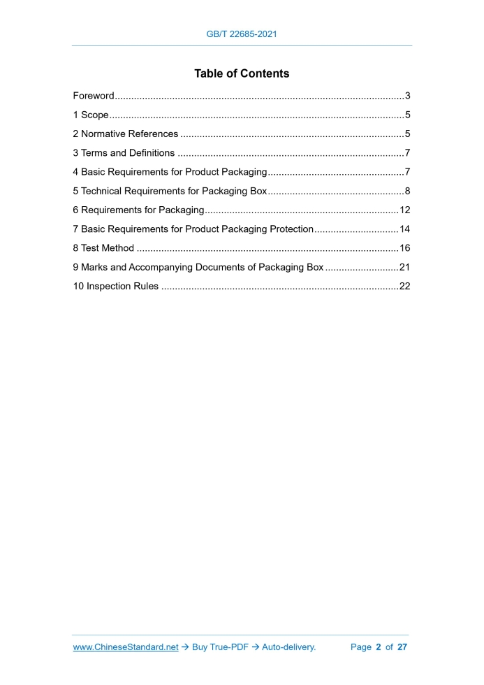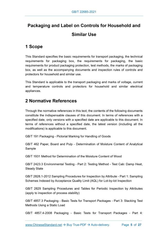 Similar standardsGB/T 22685-2021: Packaging and label on controls for household and similar use---This is an excerpt. Full copy of true-PDF in English version (including equations, symbols, images, flow-chart, tables, and figures etc.), auto-downloaded/delivered in 9 seconds, can be purchased online: https://www.ChineseStandard.net/PDF.aspx/GBT22685-2021GB NATIONAL STANDARD OF THE PEOPLE’S REPUBLIC OF CHINA ICS 97.120 CCS K 32 Replacing GB/T 22685-2008 Packaging and Label on Controls for Household and Similar Use ISSUED ON: MAY 21, 2021 IMPLEMENTED ON: DECEMBER 1, 2021 Issued by: State Administration for Market Regulation; Standardization Administration of the People’s Republic of China. Table of ContentsForeword ... 3 1 Scope ... 5 2 Normative References ... 5 3 Terms and Definitions ... 7 4 Basic Requirements for Product Packaging ... 7 5 Technical Requirements for Packaging Box ... 8 6 Requirements for Packaging ... 12 7 Basic Requirements for Product Packaging Protection ... 14 8 Test Method ... 16 9 Marks and Accompanying Documents of Packaging Box ... 21 10 Inspection Rules ... 22 Packaging and Label on Controls for Household and Similar Use1 ScopeThis Standard specifies the basic requirements for transport packaging, the technical requirements for packaging box, the requirements for packaging, the basic requirements for product packaging protection, test methods, the marks of packaging box, as well as the accompanying documents and inspection rules of controls and protectors for household and similar use. This Standard is applicable to the transport packaging and marks of voltage, current and temperature controls and protectors for household and similar electrical appliances.2 Normative ReferencesThrough the normative references in this text, the contents of the following documents constitute the indispensable clauses of this document. In terms of references with a specified date, only versions with a specified date are applicable to this document. In terms of references without a specified date, the latest version (including all the modifications) is applicable to this document. GB/T 191 Packaging - Pictorial Marking for Handling of Goods GB/T 462 Paper, Board and Pulp - Determination of Moisture Content of Analytical Sample GB/T 1931 Method for Determination of the Moisture Content of Wood GB/T 2423.3 Environmental Testing - Part 2: Testing Method - Test Cab: Damp Heat, Steady State GB/T 2828.1-2012 Sampling Procedures for Inspection by Attribute - Part 1: Sampling Schemes Indexed by Acceptance Quality Limit (AQL) for Lot-by-lot Inspection GB/T 2829 Sampling Procedures and Tables for Periodic Inspection by Attributes (apply to inspection of process stability) GB/T 4857.3 Packaging - Basic Tests for Transport Packages - Part 3: Stacking Test Methods Using a Static Load GB/T 4857.4-2008 Packaging - Basic Tests for Transport Packages - Part 4:3 Terms and DefinitionsWhat is defined in GB/T 31269, and the following terms and definitions are applicable to this document. 3.1 Heat Preservation Carton Heat preservation carton is a fiberboard box made of PS board (polystyrene) as the main material, together with aluminum foil and kraft paper, and with the functions of cold resistance, heat resistance and heat preservation. 3.2 Zipper Carton Zipper carton is a fiberboard box that adopts super hard corrugated and tear-open design, which cannot be restored after opening. 3.3 Waterproof Carton Waterproof carton is a fiberboard box coated with polyolefin, polycarbonate, polyamide, polyester and molten paraffin on the surface of the fiberboard, which can prevent the penetration of external water droplets.4 Basic Requirements for Product Packaging4.1 Products shall be qualified in the inspection, and have complete accessories and spare parts, instruction manual and certificate (or product warranty), and with proper protection and related packaging work before proceeding to the outer packaging. 4.2 The packaging materials shall be dry and tidy. The packaging materials in direct contact with the product shall have no corrosive effect or other adverse effects on the product. 4.3 The packaging environment shall be dry, clean and free of detrimental media. Product packaging shall be carried out at room temperature, with a relative humidity not greater than 85%. 4.4 Product packaging shall comply with the principles of firmness, economic efficiency and aesthetics. 4.5 Product packaging shall adopt different packaging forms, packaging materials and protection methods in accordance with product characteristics, and storage, transportation, loading and unloading conditions to achieve compact, well-protected, safe and reliable packaging. 4.6 From the date of shipment, under normal storage and transportation conditions, h---the height of the packaging box itself, expressed in (cm); S---the bottom area of the packaging box, expressed in (cm2). 5.2 Wooden Box 5.2.1 Requirements for materials The materials of the wooden box shall comply with the following requirements: a) The moisture content of the materials shall be 23% ~ 30%; b) The wood shall manifest no phenomenon of decay, mildew, water collapse, damage or whole-piece sandwiching; the defects of the wood shall not affect the strength of its structure; c) The mass of the plywood shall be selected in accordance with the stipulations of GB/T 9846 and GB/T 19536; d) The fiberboard shall be selected in accordance with the stipulations of GB/T 12626 (all parts); e) The particleboard shall be selected in accordance with the stipulations of GB/T 4897; f) For wooden boxes with an outer packaging mass of over 25 kg, the thickness of the boxboard shall not be less than 12 mm; g) The wood packaging materials for export products need to be fumigated and insect-proof in accordance with the stipulations. 5.2.2 Requirements for box-nailing The box-nailing shall comply with the following requirements: a) In accordance with the size and material strength of the boxbo
