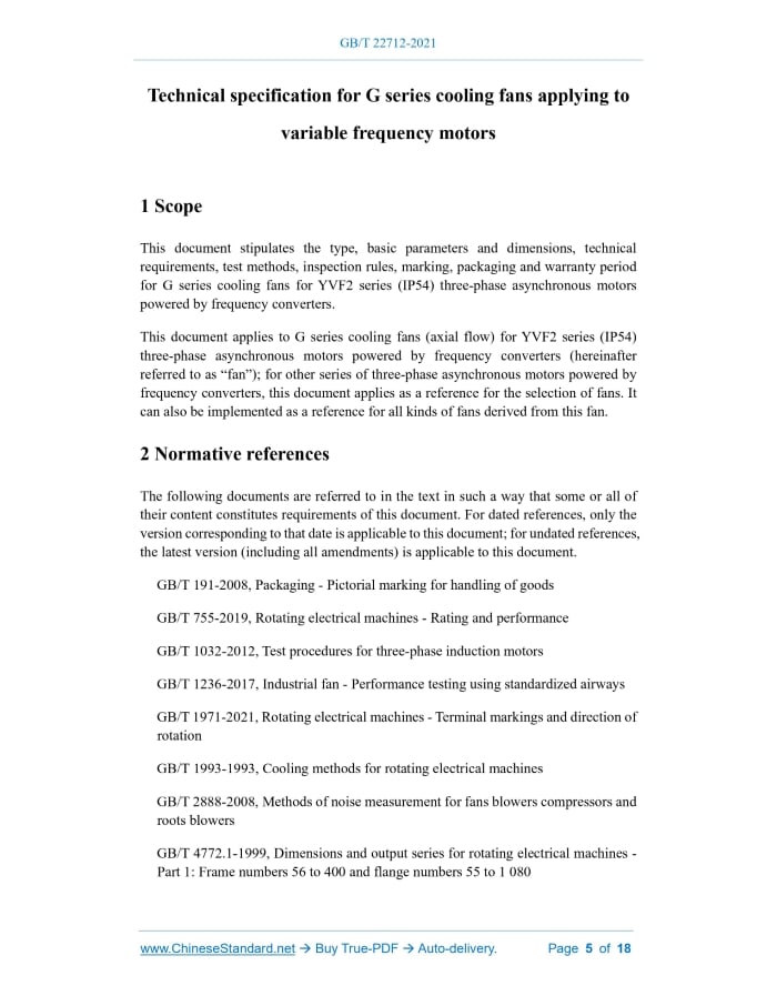 Similar standardsGB/T 22712-2021: Technical specification for G series cooling fans applying to variable frequency motors---This is an excerpt. Full copy of true-PDF in English version (including equations, symbols, images, flow-chart, tables, and figures etc.), auto-downloaded/delivered in 9 seconds, can be purchased online: https://www.ChineseStandard.net/PDF.aspx/GBT22712-2021 GB NATIONAL STANDARD OF THE PEOPLE’S REPUBLIC OF CHINA ICS 29.160.30 CCS K 22 Replacing GB/T 22712-2008 Technical specification for G series cooling fans applying to variable frequency motors ISSUED ON: OCTOBER 11, 2021 IMPLEMENTED ON: MAY 01, 2022 Issued by: State Administration for Market Regulation; Standardization Administration of the People’s Republic of China. Table of ContentsForeword ... 3 1 Scope ... 5 2 Normative references ... 5 3 Terms and definitions ... 6 4 Types, basic parameters and dimensions ... 6 5 Technical requirements ... 9 6 Test methods ... 14 7 Inspection rules ... 14 8 Marking, packaging and warranty period ... 16 Technical specification for G series cooling fans applying to variable frequency motors1 ScopeThis document stipulates the type, basic parameters and dimensions, technical requirements, test methods, inspection rules, marking, packaging and warranty period for G series cooling fans for YVF2 series (IP54) three-phase asynchronous motors powered by frequency converters. This document applies to G series cooling fans (axial flow) for YVF2 series (IP54) three-phase asynchronous motors powered by frequency converters (hereinafter referred to as “fan”); for other series of three-phase asynchronous motors powered by frequency converters, this document applies as a reference for the selection of fans. It can also be implemented as a reference for all kinds of fans derived from this fan.2 Normative referencesThe following documents are referred to in the text in such a way that some or all of their content constitutes requirements of this document. For dated references, only the version corresponding to that date is applicable to this document; for undated references, the latest version (including all amendments) is applicable to this document. GB/T 191-2008, Packaging - Pictorial marking for handling of goods GB/T 755-2019, Rotating electrical machines - Rating and performance GB/T 1032-2012, Test procedures for three-phase induction motors GB/T 1236-2017, Industrial fan - Performance testing using standardized airways GB/T 1971-2021, Rotating electrical machines - Terminal markings and direction of rotation GB/T 1993-1993, Cooling methods for rotating electrical machines GB/T 2888-2008, Methods of noise measurement for fans blowers compressors and roots blowers GB/T 4772.1-1999, Dimensions and output series for rotating electrical machines - Part 1: Frame numbers 56 to 400 and flange numbers 55 to 1 080 GB/T 4942-2021, Degrees of protection provided by the integral design of rotating electrical machines (IP code) - Classification GB/T 5171.1-2014, Small power motors - Part 1: General technical requirements GB/T 5171.21-2016, Small power motors - Part 21: General test methods GB/T 10068-2020, Mechanical vibration of certain machines with shaft heights 56 mm and higher - Measurement, evaluation and limits of vibration severity GB/T 12350, Safety requirements of small power motors GB/T 12665-2017, Requirements of damp-heat testing of electrical machine for service in general environmental condition GB/T 22719.1-2008, Interturn insulation of random-wound winding for AC low- voltage electrical machines - Part 1: Test methods GB/T 22719.2-2008, Interturn insulation of random-wound winding for AC low- voltage electrical machines - Part 2: Test limits JB/T 6445-2017, Overspeed test for fan impeller JB/T 9101-2014, Fan rotor balance3 Terms and definitionsNo terms and definitions need to be defined in this document.4 Types, basic parameters and dimensions4.1 The type of fans consists of three parts: series code, specification code and design code. Example: 4.2 The fan is directly connected to the motor, and the motor is of an outer rotor structure, or an inner rotor structure, which is also allowed. 4.3 The cooling method of the motor applied to the fan (hereinafter referred to as the fan motor) is IC01 (according to the regulations of GB/T 1993-1993). 5.2 The deviation of the power supply voltage and frequency from the rated value during the operation of the fan motor shall comply with the provisions of GB/T 755- 2019. 5.3 The fan motor adopts 155 (F) class insulation, and the temperature rise (resistance method) of the stator winding is assessed by 80 K. 5.4 When the fan motor is in a hot state and the torque is gradually increased, it shall be able to withstand an over-torque exceeding 60% of the rated torque for 15 s without sudden change in speed or stalling, and the voltage and frequency shall be maintained at the rated value at this time. 5.5 Under no-load conditions, the fan motor shall be able to withstand an increase in speed to 120% of its rated value for 2 minutes without harmful deformation. 5.6 The insulation resistance of the stator winding of the fan motor shall not be lower than 2 MΩ in the hot state, and not lower than 20 MΩ in the normal state. 5.7 The stator winding of the fan motor shall be able to withstand the 1 min voltage withstand testing without breakdown. The frequency of the test voltage is 50 Hz, which shall be as sinusoidal as possible; the effective value of the voltage is 1 760 V. The same fan shall not be subjected to this test repeatedly. 5.8 The stator winding of the fan motor shall be able to withstand the inter-turn impulse withstand voltage test without breakdown, and the peak value of the test impulse voltage of the coil shall comply with the provisions of GB/T 22719.2-2008. 5.9 After the stator winding of the fan motor is tested for 6 cycles according to the 40 °C damp heat cyclic test method specified in GB/T 12665-2017, the insulation resi