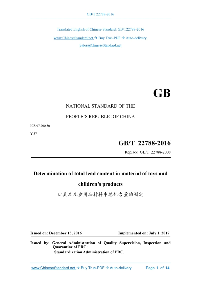 GB/T 22788-2016: Determination of total lead content in surface coating on toys Delivery: 9 seconds. True-PDF full-copy in English & invoice will be downloaded + auto-delivered via email. See step-by-step procedure Status: Valid GB/T 22788: Historical versions