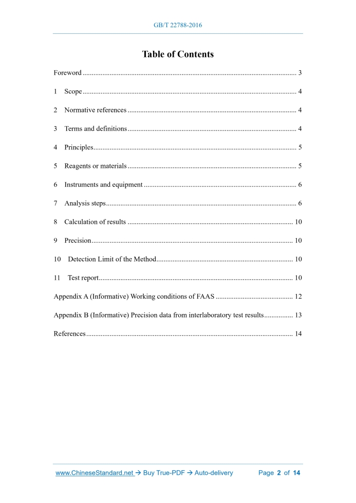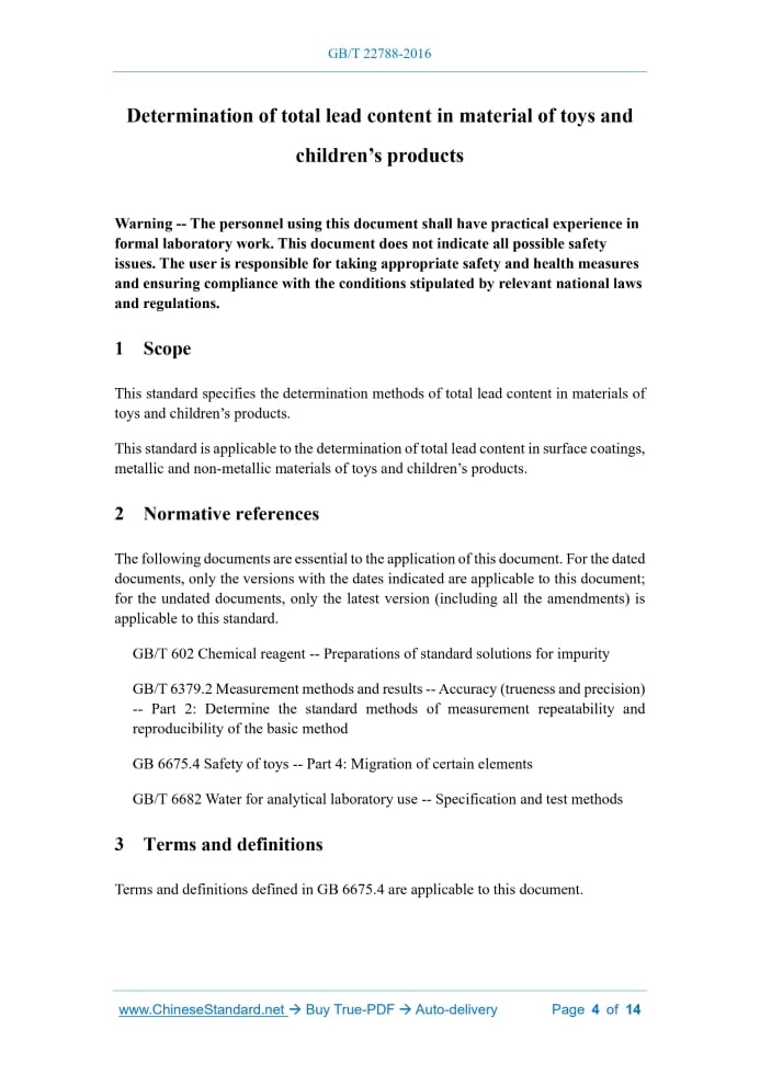 Similar standardsGB/T 22788-2016: Determination of total lead content in surface coating on toys---This is an excerpt. Full copy of true-PDF in English version (including equations, symbols, images, flow-chart, tables, and figures etc.), auto-downloaded/delivered in 9 seconds, can be purchased online: https://www.ChineseStandard.net/PDF.aspx/GBT22788-2016NATIONAL STANDARD OF THE PEOPLE’S REPUBLIC OF CHINA ICS 97.200.50 Y 57 Replace GB/T 22788-2008 Determination of total lead content in material of toys and children’s products ISSUED ON: DECEMBER 13, 2016 IMPLEMENTED ON: JULY 1, 2017 Issued by: General Administration of Quality Supervision, Inspection and Quarantine of PRC; Standardization Administration of PRC. Table of ContentsForeword ... 3 1 Scope ... 4 2 Normative references ... 4 3 Terms and definitions ... 4 4 Principles ... 5 5 Reagents or materials ... 5 6 Instruments and equipment ... 6 7 Analysis steps ... 6 8 Calculation of results ... 10 9 Precision ... 10 10 Detection Limit of the Method ... 10 11 Test report ... 10 Appendix A (Informative) Working conditions of FAAS ... 12 Appendix B (Informative) Precision data from interlaboratory test results ... 13 References ... 14 Determination of total lead content in material of toys and children’s products Warning -- The personnel using this document shall have practical experience in formal laboratory work. This document does not indicate all possible safety issues. The user is responsible for taking appropriate safety and health measures and ensuring compliance with the conditions stipulated by relevant national laws and regulations.1 ScopeThis standard specifies the determination methods of total lead content in materials of toys and children’s products. This standard is applicable to the determination of total lead content in surface coatings, metallic and non-metallic materials of toys and children’s products.2 Normative referencesThe following documents are essential to the application of this document. For the dated documents, only the versions with the dates indicated are applicable to this document; for the undated documents, only the latest version (including all the amendments) is applicable to this standard. GB/T 602 Chemical reagent -- Preparations of standard solutions for impurity GB/T 6379.2 Measurement methods and results -- Accuracy (trueness and precision) -- Part 2: Determine the standard methods of measurement repeatability and reproducibility of the basic method GB 6675.4 Safety of toys -- Part 4: Migration of certain elements GB/T 6682 Water for analytical laboratory use -- Specification and test methods3 Terms and definitionsTerms and definitions defined in GB 6675.4 are applicable to this document. of hydrogen peroxide (5.3), and continue heating; repeat the step 1~2 times until the digestion of the sample is complete. When the solution is left about 1 mL, remove the beaker and let it cool to room temperature. Dilute the solution with about 10 mL of water, filter the solution into a 25 mL volumetric flask, and then use 5 mL of nitric acid (5.6) in total to rinse the beaker and filter paper three times. Transfer the washing solution into the 25 mL volumetric flask. The mixed solution will be determined later. In the process of adding hydrogen peroxide, special attention shall be paid to the possible risk of solution bumping or overflow. 7.2.1.2 Microwave digestion method Weigh about 0.2 g of the sample, and the weight shall be accurate to 1 mg; place it in a microwave digestion vessel, respectively add 5 mL of nitric acid (5.2) and 2 mL of hydrogen peroxide (5.3), and seal the digestion vessel. Carry out the digestion according to the following temperature program: raise the temperature to (180 ± 5) °C in about 10 minutes, and keep the temperature for 30 minutes; then, let the temperature go down. After the digestion tank is cooled to room temperature, open the digestion tank, and transfer the digestion solution to a 25 mL volumetric flask; wash the inner tank and inner lid of the microwave digestion vessel three times with a small amount of nitric acid (5.6), and incorporate the washing solution into the volumetric flask. If the digestion solution is not clear or has precipitation, the solution shall be filtered, and the residual solid substances shall be washed 3 times with 5 mL of nitric acid (5.6) in total; then, transfer the washing solution into the 25 mL volumetric flask. The mixed solution will be determined later. 7.2.2 Metallic materials Note: This standard provides two digestion methods for metallic materials, which can be selected by the laboratory technicians according to the conditions. 7.2.2.1 Electric hot plate heating digestion method Weigh about 0.2 g of the sample, and the weight shall be accurate to 1 mg; put it into a 50 mL beaker, add 6 mL of hydrochloric acid (5.4) and 2 mL of nitric acid (5.2), and heat it on an electric hot plate to keep the solution slightly boiling; digest it for about 15 minutes; if the dissolution of the sample is not complete, remove the beaker and cool it down, add 0.5 mL~2 mL of nitric acid (5.2) and a few drops of hydrochloric acid (5.4), and then continue heating; repeat the step 1~2 times to complete the digestion of the sample; when the solution is left about 1mL, remove the beaker and let it cool to room temperature. Dilute with about 10 mL of water, filter the solution into a 25 mL volumetric flask, and then rinse the beaker and filter paper three times with 5 mL of nitric acid (5.6) in total. Transfer the washing solution into the 25 mL volumetric flask. The mixed solution will be determined later. 7.2.2.2 Microwave digestion method Weigh about 0.2 g of the sample, and the weight shall be accurate to 1 mg; place it in a microwave digestion vessel of polytetrafluoroethylene, add 6 mL of nitric acid (5.2) and 2 mL of hydrochloric acid (5.4), and seal the digestion vessel after the reaction subsides at room temperature. Carry out the digestion 