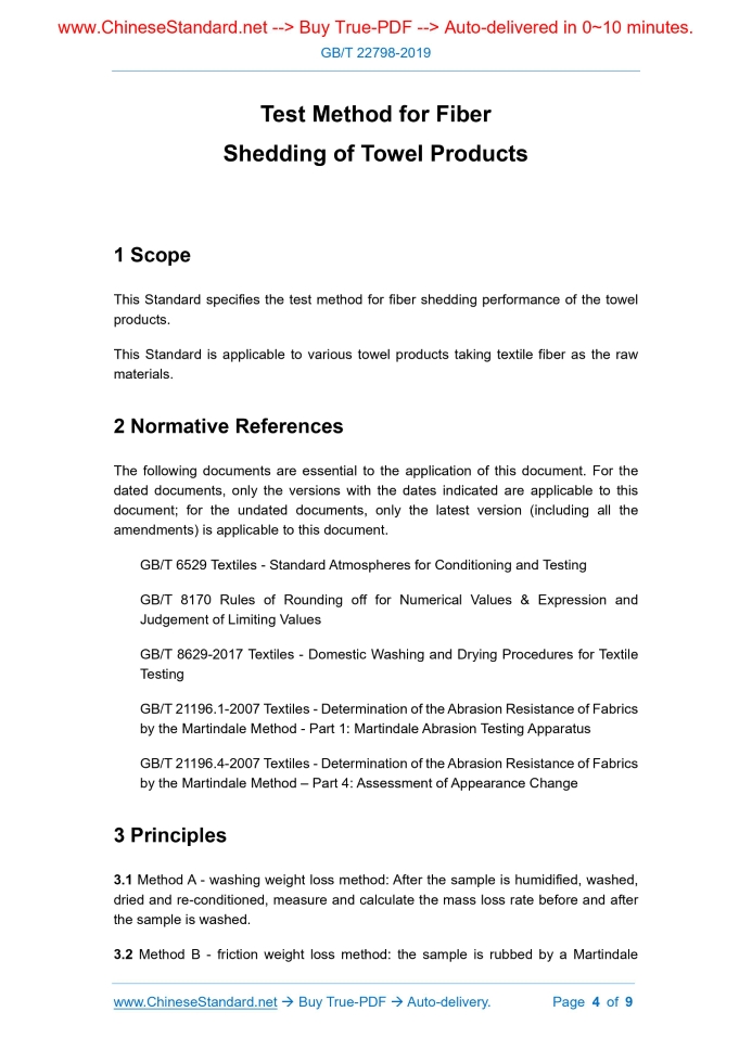 Similar standardsGB/T 22798-2019: Test method for fiber shedding of towel products---This is an excerpt. Full copy of true-PDF in English version (including equations, symbols, images, flow-chart, tables, and figures etc.), auto-downloaded/delivered in 9 seconds, can be purchased online: https://www.ChineseStandard.net/PDF.aspx/GBT22798-2019GB NATIONAL STANDARD OF THE PEOPLE’S REPUBLIC OF CHINA ICS 97.160 W 55 Replacing GB/T 22798-2009 Test Method for Fiber Shedding of Towel Products ISSUED ON: DECEMBER 31, 2019 IMPLEMENTED ON: MAY 01, 2020 Issued by: State Administration for Market Regulation; Standardization Administration of PRC. Table of ContentsForeword ... 3 1 Scope ... 4 2 Normative References ... 4 3 Principles ... 4 4 Test Conditions ... 5 5 Reagents and Materials ... 5 6 Apparatus ... 5 7 Sample ... 6 8 Test Procedures ... 7 9 Test Data Processing ... 8 10 Test Report ... 9 Test Method for Fiber Shedding of Towel Products1 ScopeThis Standard specifies the test method for fiber shedding performance of the towel products. This Standard is applicable to various towel products taking textile fiber as the raw materials.2 Normative ReferencesThe following documents are essential to the application of this document. For the dated documents, only the versions with the dates indicated are applicable to this document; for the undated documents, only the latest version (including all the amendments) is applicable to this document. GB/T 6529 Textiles - Standard Atmospheres for Conditioning and Testing GB/T 8170 Rules of Rounding off for Numerical Values & Expression and Judgement of Limiting Values GB/T 8629-2017 Textiles - Domestic Washing and Drying Procedures for Textile Testing GB/T 21196.1-2007 Textiles - Determination of the Abrasion Resistance of Fabrics by the Martindale Method - Part 1: Martindale Abrasion Testing Apparatus GB/T 21196.4-2007 Textiles - Determination of the Abrasion Resistance of Fabrics by the Martindale Method – Part 4: Assessment of Appearance Change3 Principles3.1 Method A - washing weight loss method: After the sample is humidified, washed, dried and re-conditioned, measure and calculate the mass loss rate before and after the sample is washed. 3.2 Method B - friction weight loss method: the sample is rubbed by a Martindale 6.2.1 Ventilated drying oven: The ventilation type may use pressure type or convection type device with constant temperature control, which can control the temperature at (105±3) °C. 6.2.2 Martindale abrasion tester: According to the provisions of GB/T 21196.1-2007. 6.2.3 Disc sampler: the diameter is 140 +0.5 0 mm. 6.2.4 Disc sampler: the diameter is 38 +0.5 0 mm. 6.2.5 Balance: the division value is 0.001g. 6.2.6 Compressed air generating device with air gun, compressed air pressure: 2×105 Pa~3×105 Pa; bore diameter of air gun: 2.5mm.7 Sample7.1 Method A - washing weight loss method 7.1.1 Take the entire representative sample, and take the minimum number of samples under the condition that the total mass is no less than 100g. 7.1.2 Place the prepared sample (see 7.1.1) in an atmospheric condition with relative humidity of 10.0% ~ 25.0% and temperature not exceeding 50.0°C for pre-conditioning for at least 1h. 7.1.3 Expose the processed sample (see 7.1.2) to the standard atmosphere for textile conditioning until it reaches a constant weight (weigh continuously at an interval of 2h, and when the mass change is no more than 0.25%, it is considered to have reached constant weight). NOTE: It is recommended that the sample be humidified for at least 24h under standard atmospheric conditions. 7.2 Method B - friction weight loss method 7.2.1 On the prepared sample (see 7.1.1), at a distance of 15 cm from the edge of the cloth or one-tenth of the width, cut and sample by a disc sampler with a diameter of 140 mm; respectively take 4 samples on the front and back sides. The sample shall not contain the same warp and weft yarns. 7.2.2 The cut sample shall be hemmed to prevent the yarn or hairiness from falling off. NOTE: It is recommended to use needling method for edge-wrapping. 7.2.3 After the edge-wrapping of the sample, use the compressed air with a pressure of 2×105 Pa~3×105 Pa to blow it on both sides to remove impurities from the sample surface. 7.2.4 Number each processed sample; then put it into a ventilated drying box (see 6.2.1); and dry it to constant weight at (105±3) °C (continuously weigh at least 20min intervals till the mass difference between two weighing exceeds 0.20% of the latter weighing). Weigh the samples one by one and record their mass. The mass of the sample is accurate to 0.001g.8 Test Procedures8.1 Method A - washing weight loss method 8.1.1 Gently shake the conditioned and balanced sample (see 7.1) to remove the floating hair; pick up the fluff and thread entangled on the towel; weigh it by a balance, and record the weighing value m1. 8.1.2 Put the sample in the washing machine; add the accompanying laundry (see 5.1.1); the total mass of the sample plus accompanying laundry is 1kg. Add (20±1) g standard detergent (see 5.1.2), and wash according to the procedures specified in Clause 9 in GB/T 8629-2017. 8.1.3 After the completion of washing, immediately load the sample and the accompanying laundry into the dryer; set the drying temperature to (66 ± 5) °C, and dry the sample. 8.1.4 Take out the sample immediately after drying, condition and weigh it again according to the provisions of 7.1.2 and 7.1.3; and record the weighing value m2. 8.2 Method - friction weight loss method 8.2.1 Install the sample (see 7.2) and wool standard abrasive (see 5.2.1); the installation method sees the provisions of 7.5 in GB/T 21196.4-2007. The wool standard abrasive is changed once every rubbing for 50,000 times. 8.2.2 After installing the sample and abrasive, put the abrasive jig guide board in the appropriate position; accurately place the abrasive jig and pin shaft on the corresponding workbench; and place the loading bloc