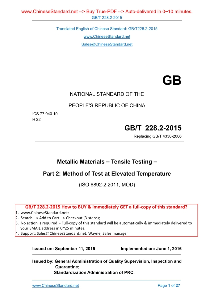 GB/T 228.2-2015: Metallic materials -- Tensile testing -- Part 2: Method of test at elevated temperature Delivery: 9 seconds. True-PDF full-copy in English & invoice will be downloaded + auto-delivered via email. See step-by-step procedure Status: Valid